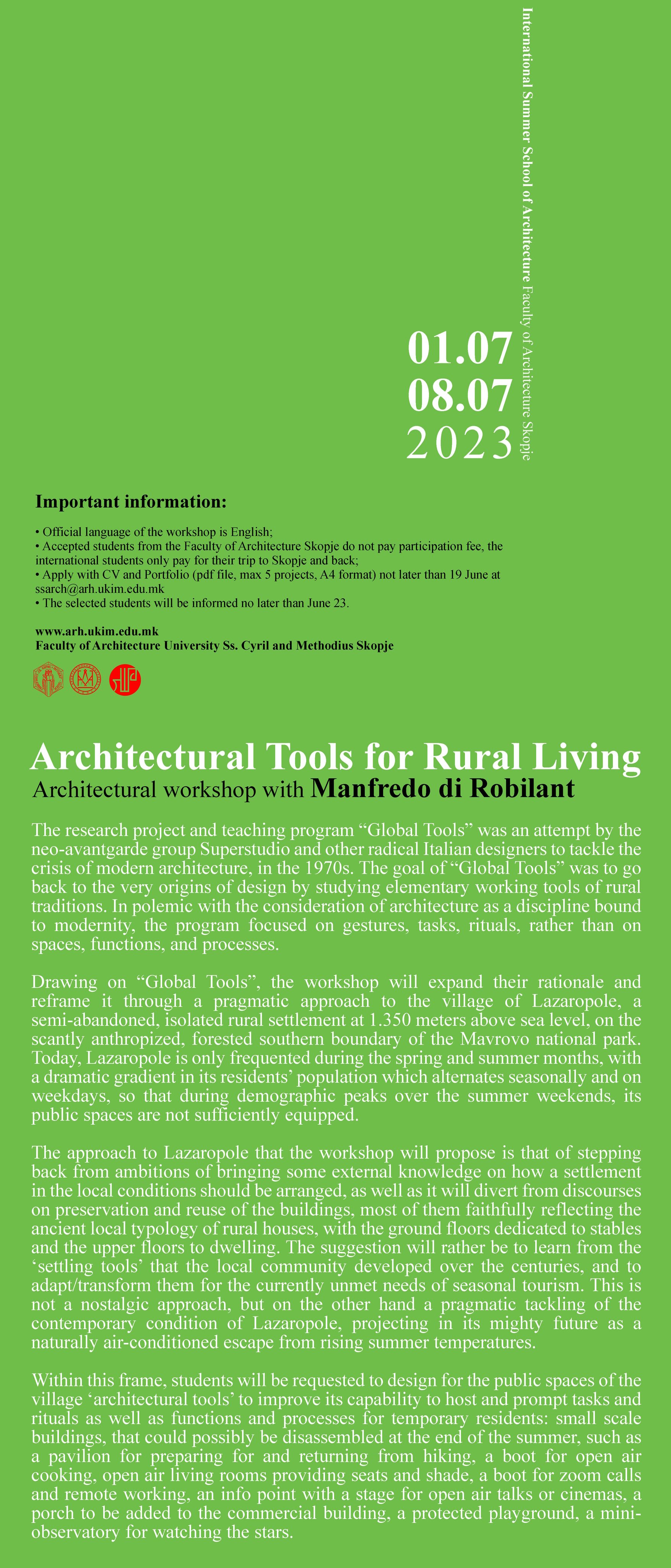 Architectural Tools for Rural Living 13. June 2023. Više informacija o raspisanoj studentskoj radionici dostupno je na poveznici.