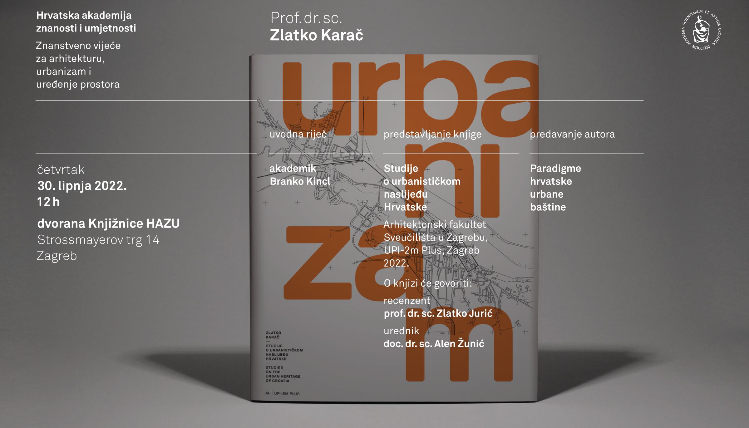 čast nam je pozvati Vas na predstavljanje knjige „Studije o urbanističkom naslijeđu Hrvatske“ prof. dr. sc. Zlatka Karača, s popratnim autorovim predavanjem „Paradigme hrvatske urbane baštine“, koje će se, u okviru programa Znanstvenog vijeća za arhitekturu, urbanizam i uređenje prostora Hrvatske akademije znanosti i umjetnosti, održati u četvrtak, 30. 6. 2022. u 12 h, u Knjižnici HAZU, Strossmayerov trg 14, Zagreb.