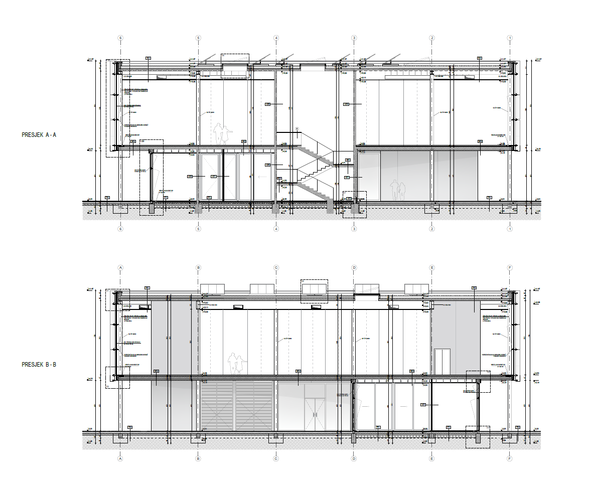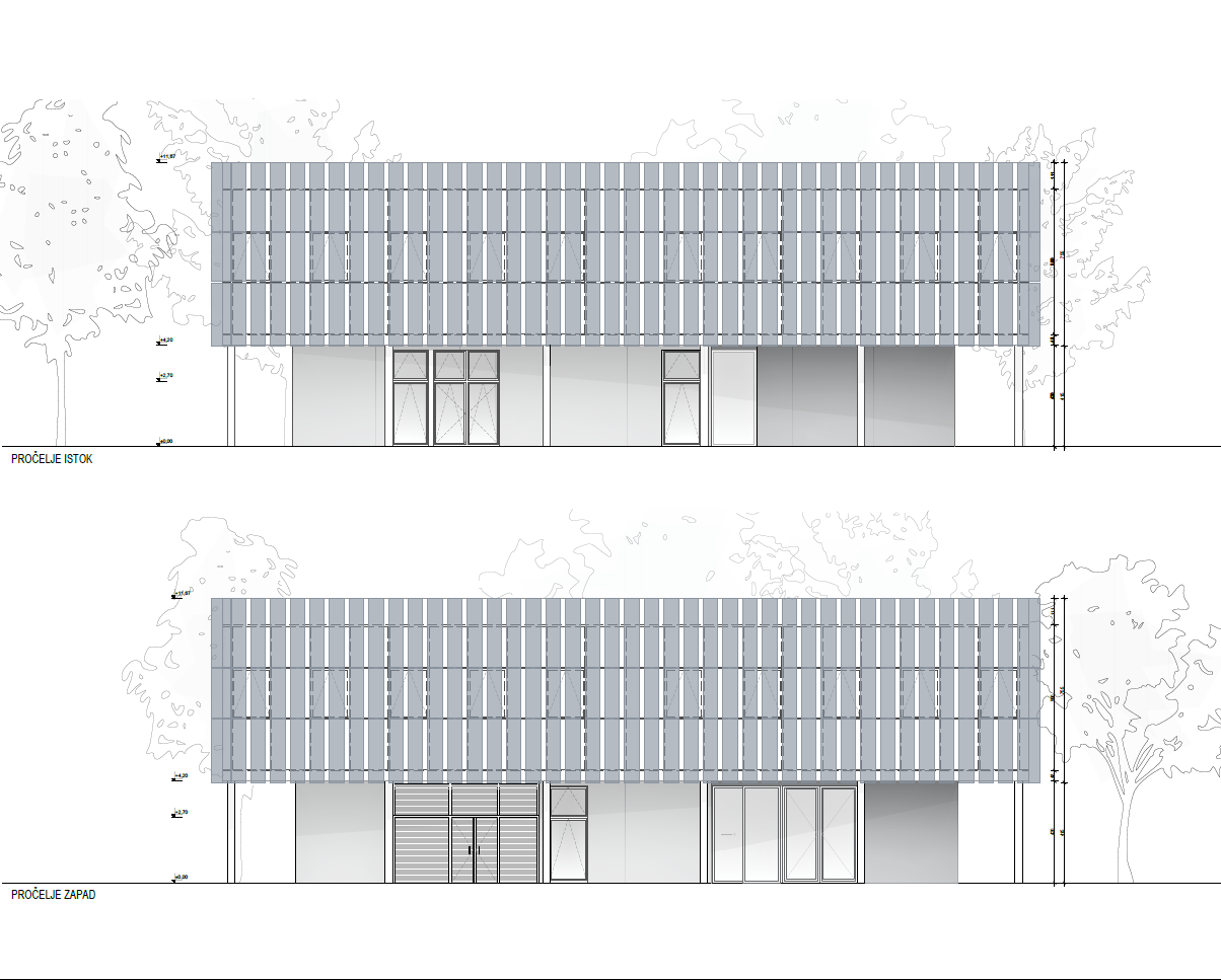 The Multipurpose Pavilion Špansko is conceived around the concept of modularity – within a defined, regular grid of structural modules, a flexible floor plan has been developed that enables a variety of spatial scenarios through the use of movable panels. The upper floor, housing a multipurpose hall, is constructed in a lightweight steel structure and is both materially and volumetrically distinct from the reinforced concrete ground floor, which accommodates technical and service areas. The recessed ground floor further accentuates the impression of a transparent volume floating above a solid base. The modular approach is reflected not only in the spatial organization but also in the architectural expression of the building.