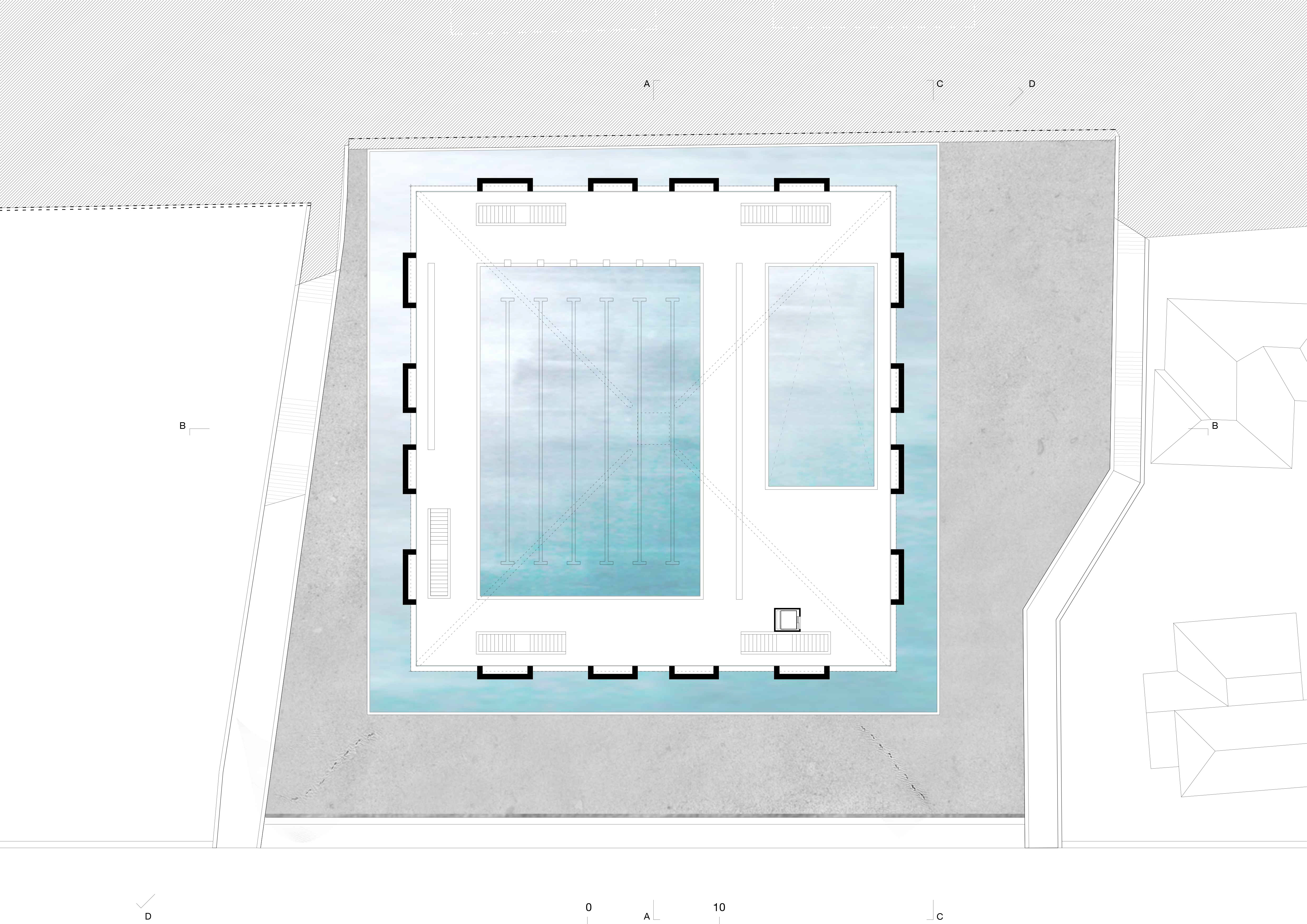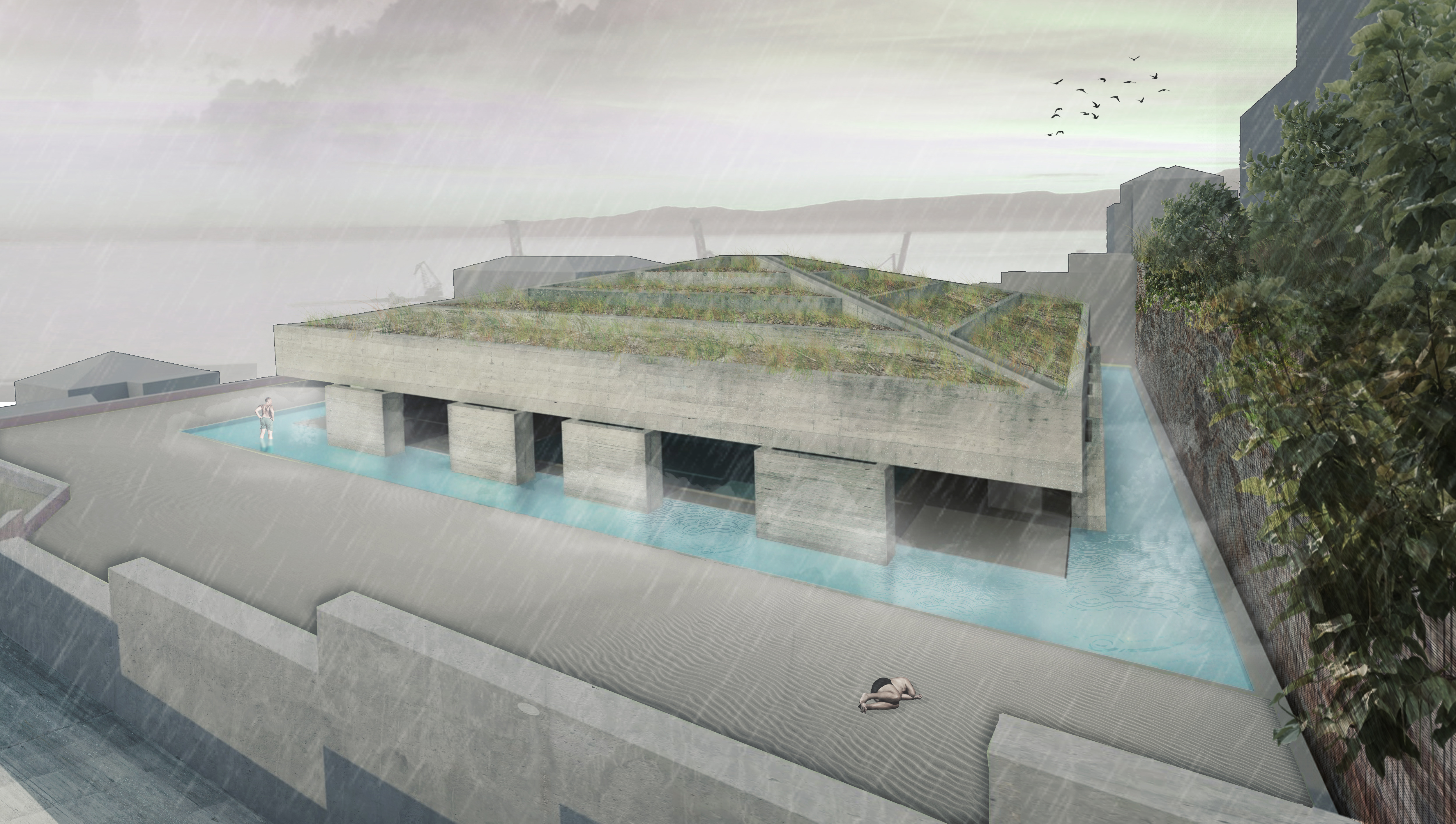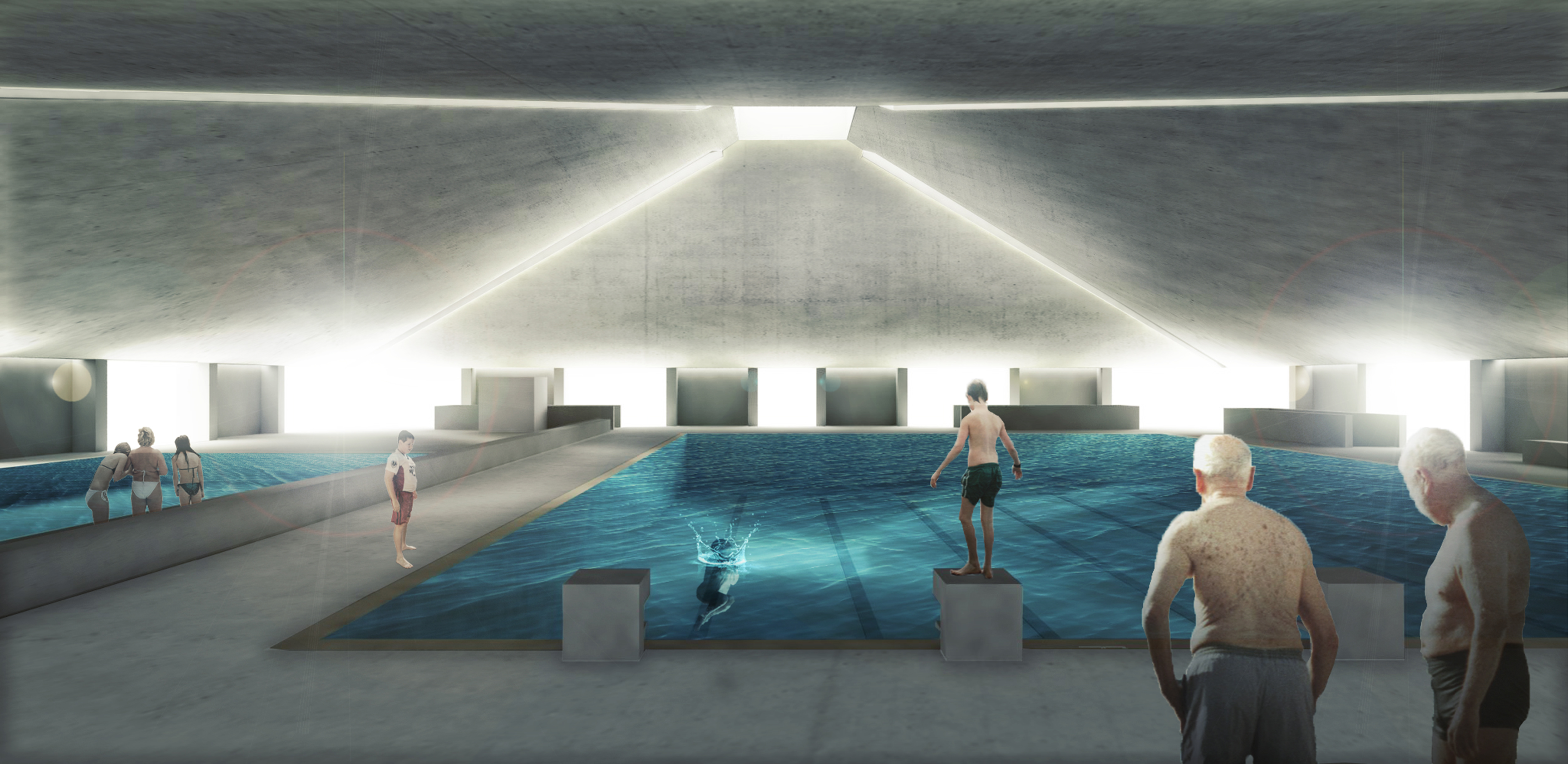 The size and high standard of the existing pool complexs in Rijeka at Kantrida (5 outdoor pools and 1 indoor pool woth viewing area) cannot compensate for the chronic lack of swimming pools in the town. The concentration of all facilities in one place, at edge od the town, makes this porblem all the more evident: the entire area of Sušak and the central part of the town has no bathing infrastructure. The proposal for a new pool addresses this issue, and returns swimming in Rijeka to its source. Divested of the function of the central town object, the new pool can be made to the measure of the neigbourghood: instead of an infrastructure for sports spectacles, it can be adapted to the everyday sports needs of the local community.