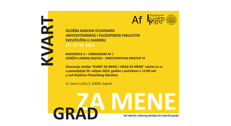 Izložba studentskih radova „KVART ZA MENA / GRAD ZA MENE“, rezultat je suradnje Arhitektonskog i Filozofskog fakulteta Sveučilišta u Zagrebu. Radovi su realizirani suradnjom studenata i voditelja na kolegiju "Radionica 3 - Urbanizam" (voditelj prof. Tihomir Jukić) na Diplomskom studiju Arhitektura i urbanizam (AF) i kolegiju "Održivi urbani razvoj - participativni pristup" (voditeljica izv. prof. Jana Vukić) na diplomskom studiju sociologije (FF). Uz voditelje u projektu su sudjelovali asistenti Kristina Perkov (AF) i Bruno Šimac (FF).