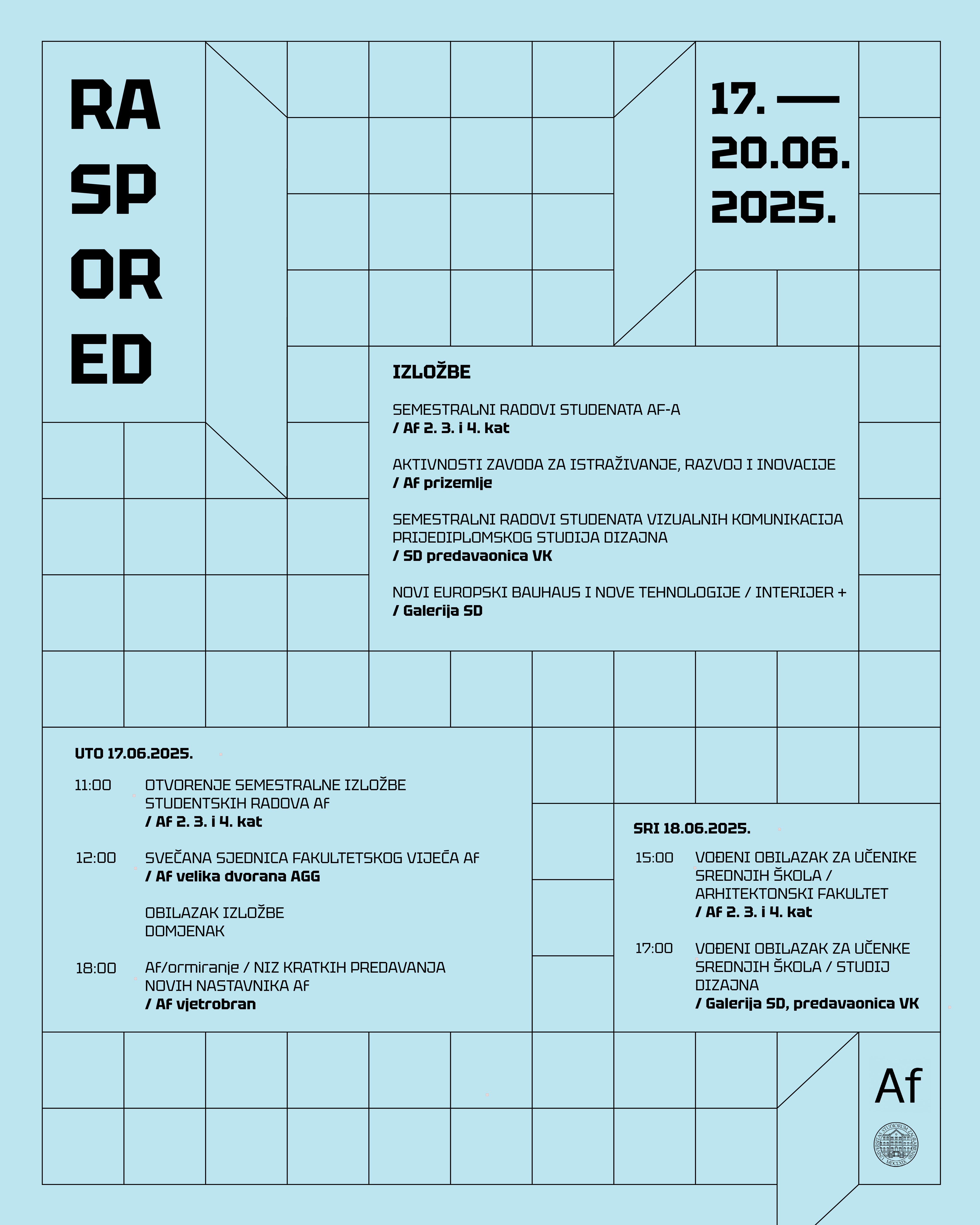 Od 17. do 20. lipnja održat će se Dani otvorenih vrata Af u sklopu kojih će niz izložbi i popratnih događanja biti dostupan zainteresiranoj javnosti, u prvom redu budućim studenticama i studentima. U utorak 17. lipnja od 11h, na 2., 3. i 4. katu u Kačićevoj bit će otvorena izložba semestralnih radova studenata Af, dok će u 12h uslijediti svečana sjednica Fakultetskog vijeća Af na kojoj će biti dodijeljene nagrade studentima za najbolje radove ostvarene na vježbovnim kolegijima u akademskim godinama 2021./22., 2022./23. i 2023./24. U prizemlju zgrade bit će postavljena i izložba aktivnosti Zavoda za istraživanje, razvoj i inovacije (ZIRI). Od 18h u prizemlju zgrade fakulteta bit će održan program Aformiranje na kojemu će kratka izlaganja održati nove asistentice i asistenti Af. Istog će dana u prostorijama Studija dizajna u Frankopanskoj 12 biti otvorene izložbe semestralnih radova studenata vizualnih komunikacija prijediplomskog studija dizajna (SD predavaonica VK) te izložba Novi europski Bauhaus i nove tehnologije / interijer + (Galerija SD). U srijedu 18. lipnja održat će se vođeni obilazak zgrade Af u Kačićevoj i vođeni obilazak prostora Studija dizajna u Frankopanskoj, za učenice i učenike srednjih škola. Pojedinačne najave događaja u sklopu Dana otvorenih vrata Af i ostale bitne informacije vezano uz raspored pravovremeno će biti objavljene na web stranici i društvenim mrežama Af.