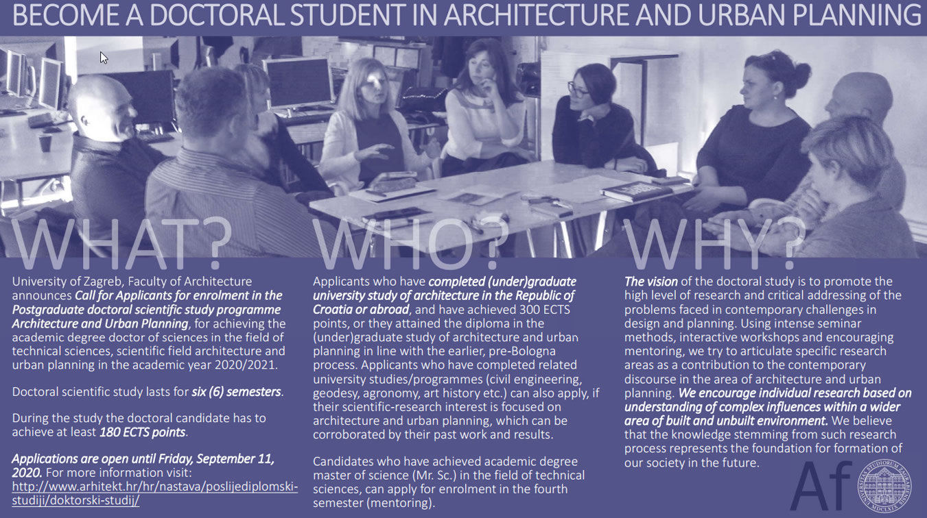 Poziv na prijave za upis 7. generacije polaznika Doktorskog studija Arhitektura i urbanizam 22. srpnja 2020. Poziv na prijave za upis 7. generacije polaznika Doktorskog studija Arhitektura i urbanizam možete preuzeti na sljedećim poveznicama: Poziv: Call: