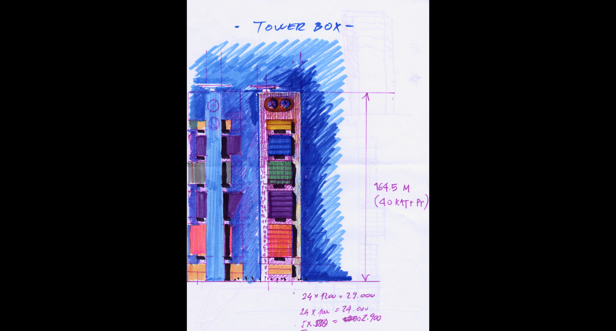 Projektom se definira forma novog zagrebačkog urbanog atefakta. Volumen tornja 4 Box Tower iznad postamenta koncipiran je kao vertikalni niz od 4 identična kubusa visine 6 etaža razdvojena terasama te petog,završnog istaknutog volumena iznad kojeg se nalazi tehnička etaža,vjetroelektrane i na vrhu heliodrom. Niži dio kompleksa percipira se kao postament tornja. Parter i krovne plohe sadrže vodene površine,zelenilo,skulpture.
