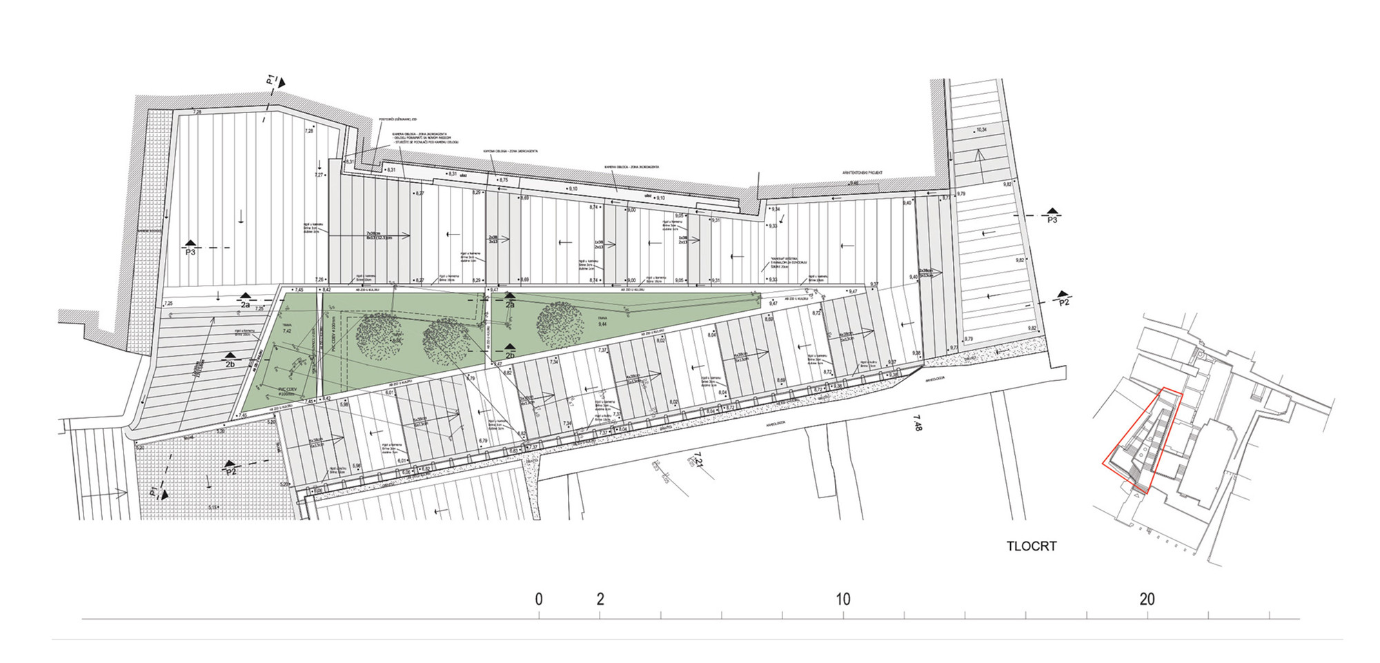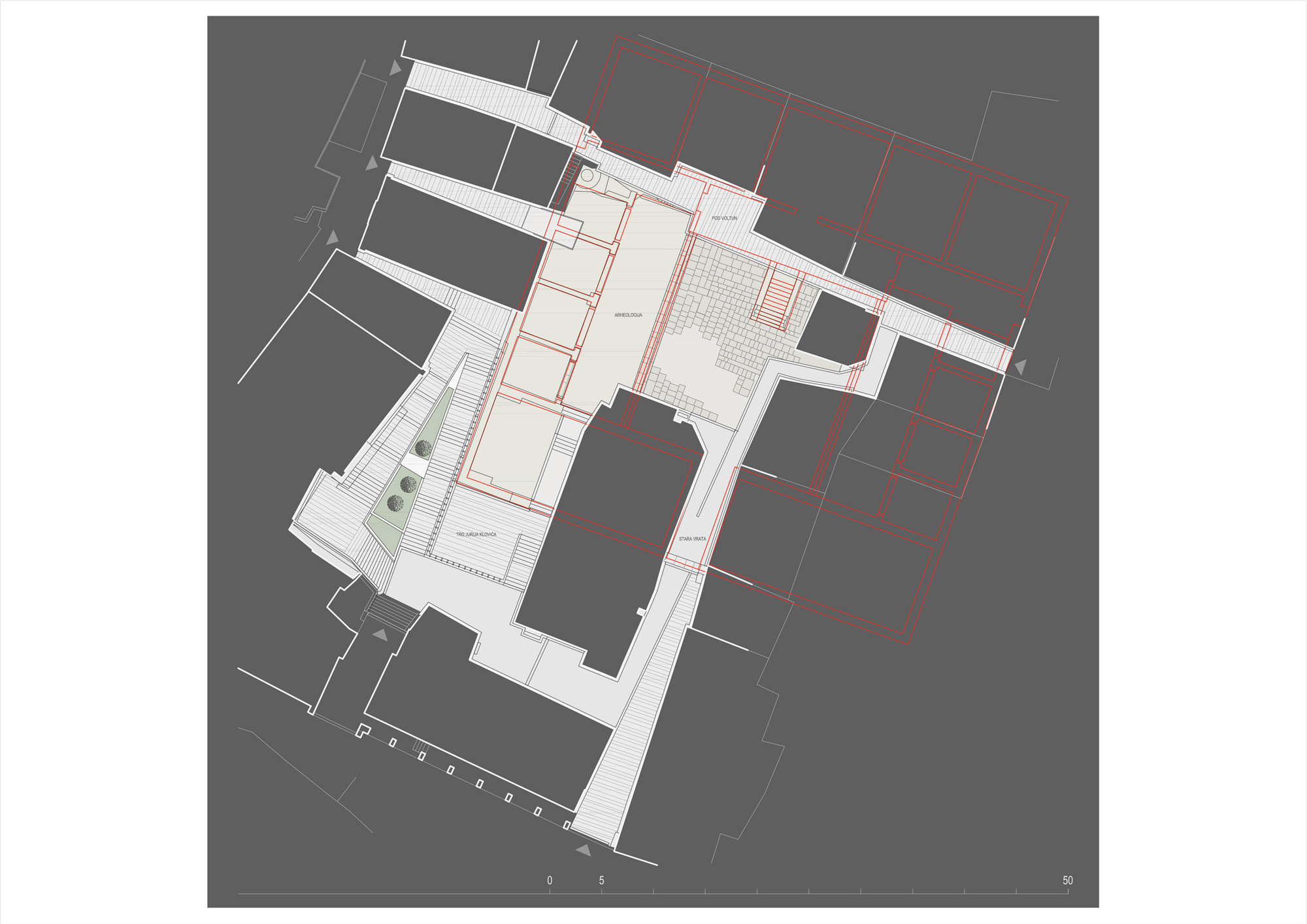 Iz dosad navedenog, preostalo je oblikovati i prezentirati neposredni okoliš i posebno, rubne zone arheološkog nalazišta. Regulacijom jasnog komunikacijskog usmjeravanja, eliminacijom svih efemernih detalja i intervencija, čitanjem prostornih autoriteta, željelo se potencirati glavnu temu i arheološko žarište.