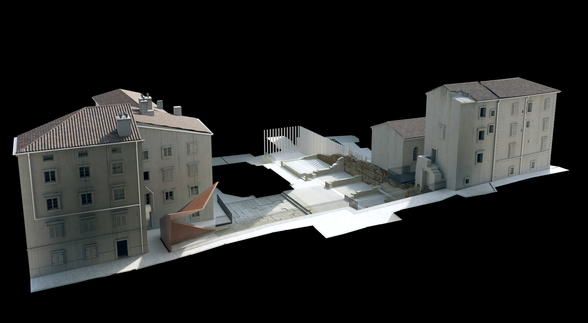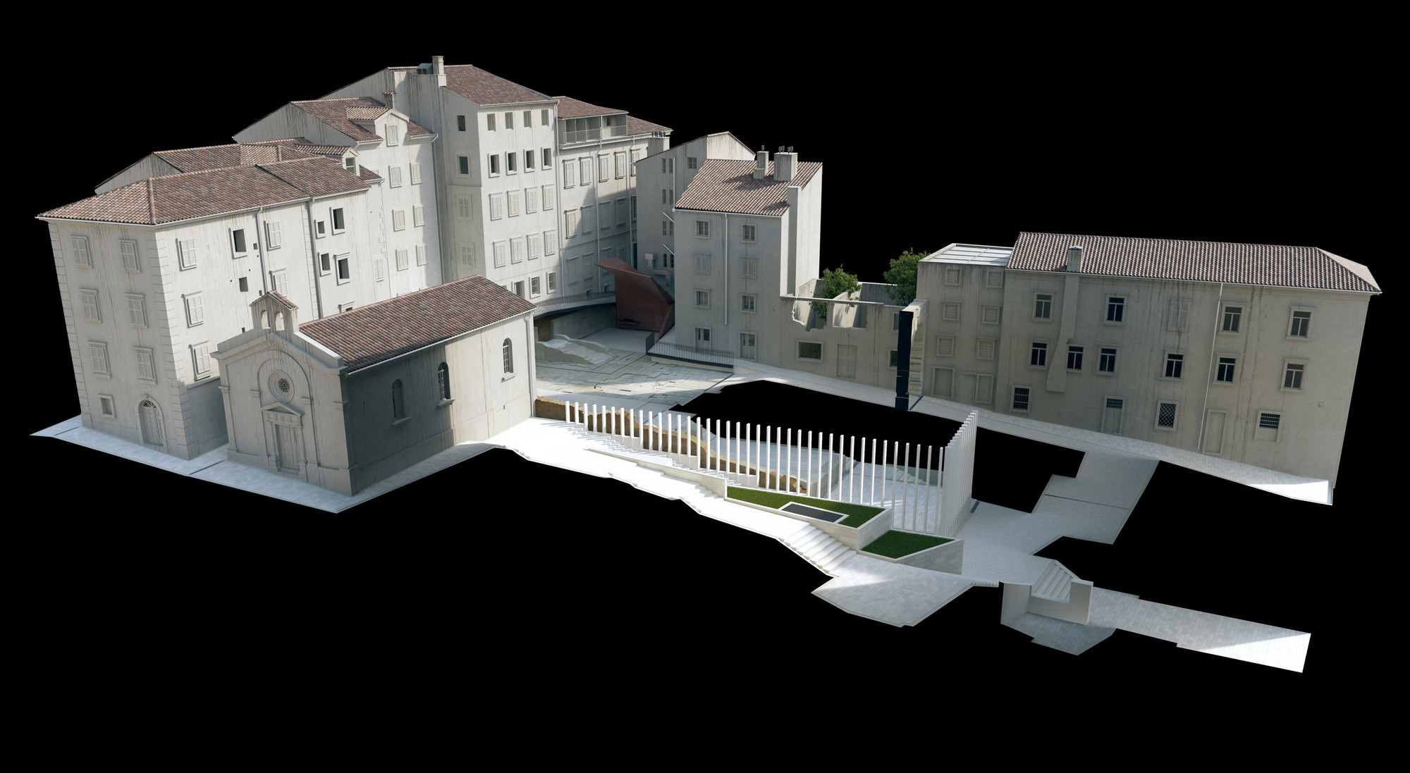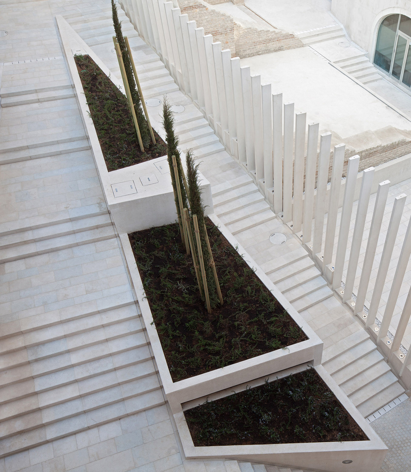 A) Rubna zona (granica) J-Z ugla principija dilatirana je ritmiziranim nizom vertikalnih lamela (bijeli beton) od okolnog ambijenta terasa, rampi, stubišta i fontane.