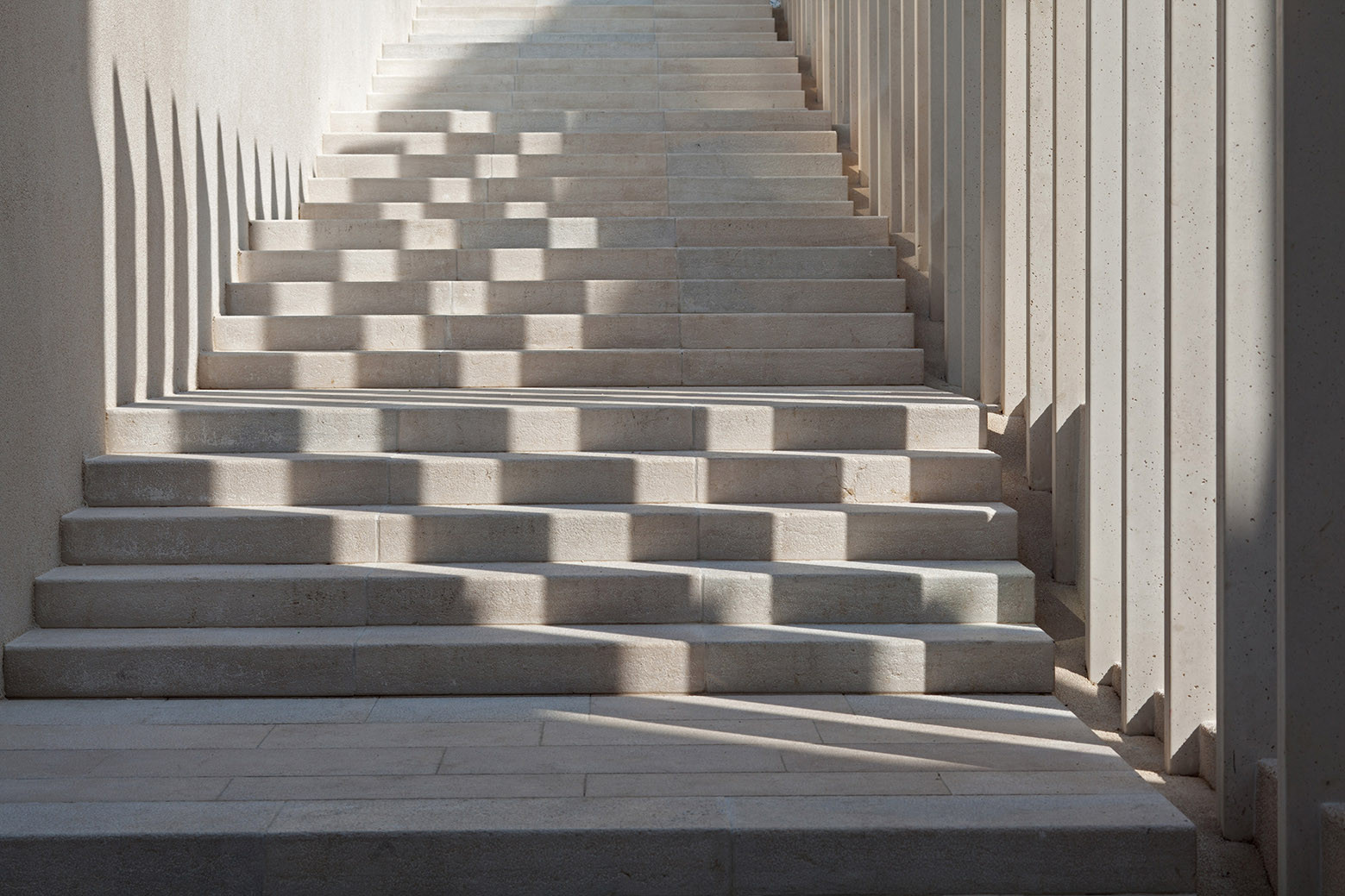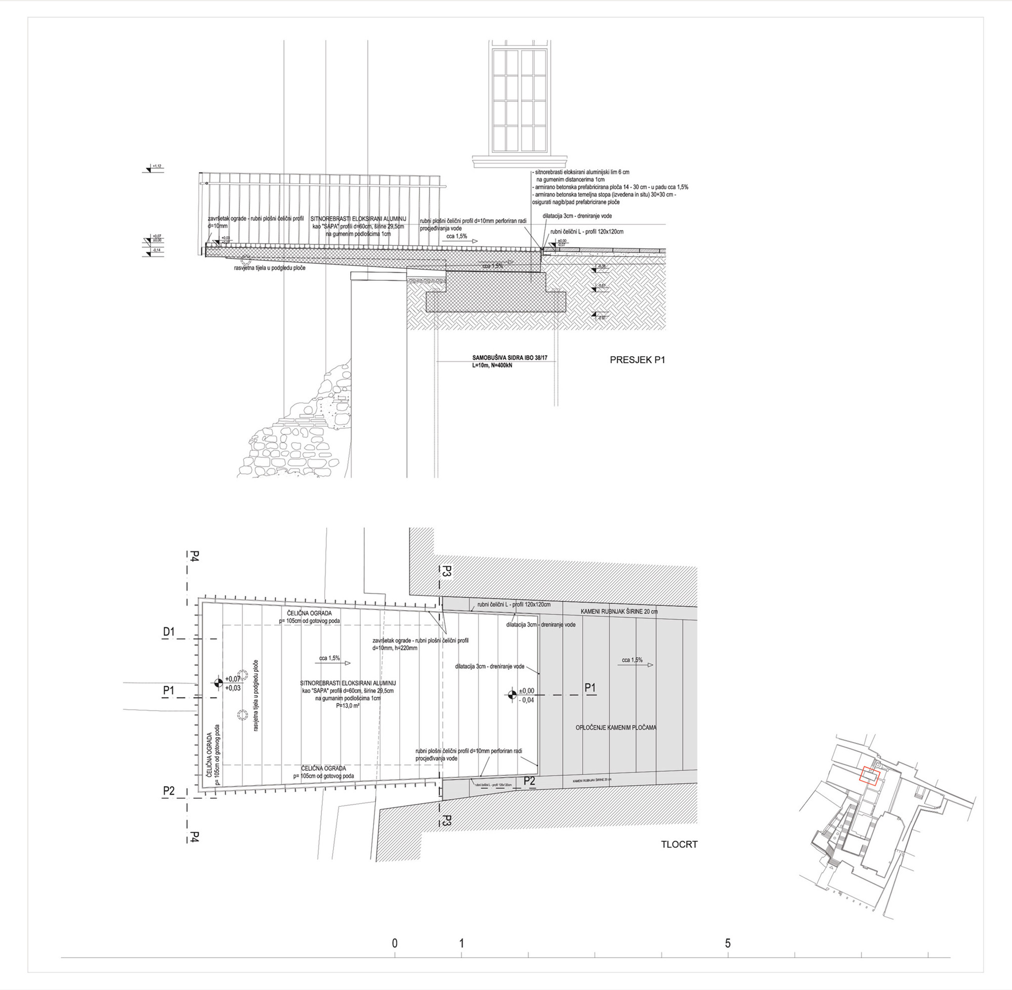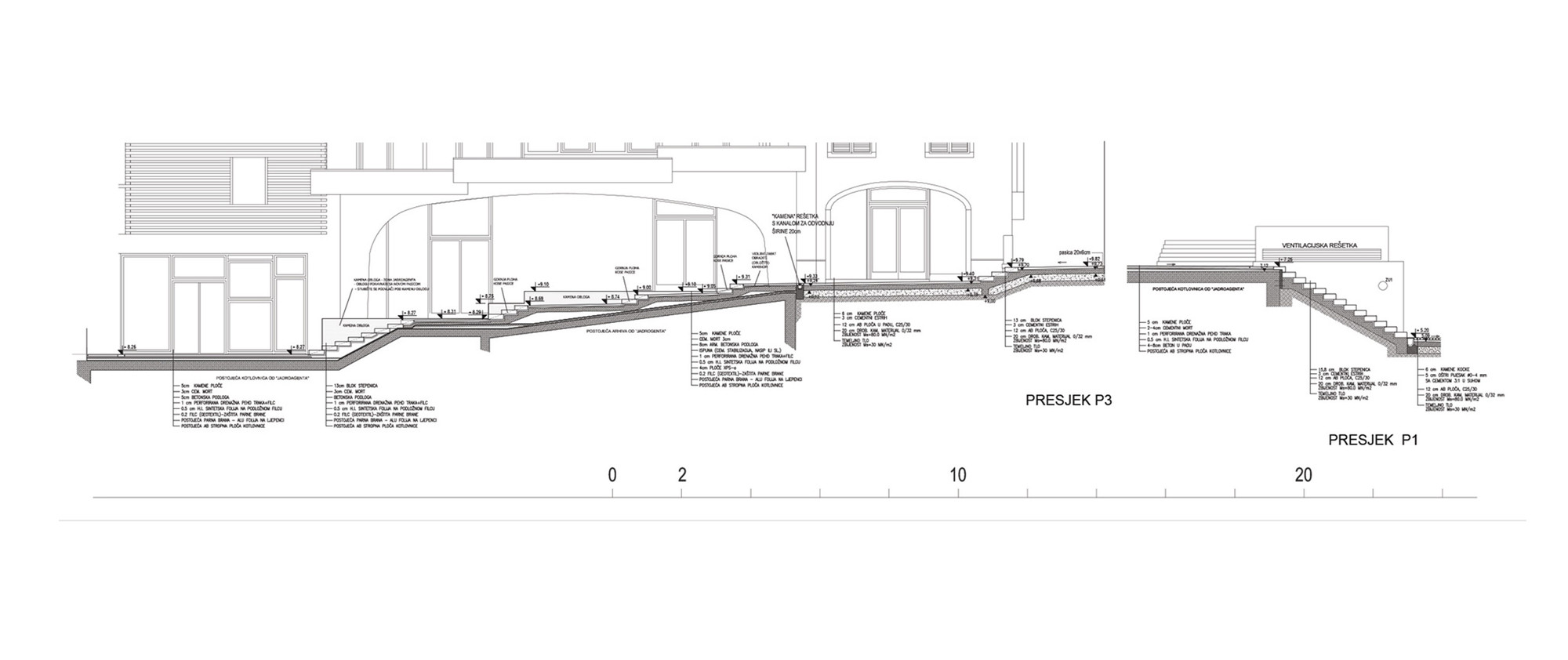 A) Rubna zona (granica) J-Z ugla principija dilatirana je ritmiziranim nizom vertikalnih lamela (bijeli beton) od okolnog ambijenta terasa, rampi, stubišta i fontane.