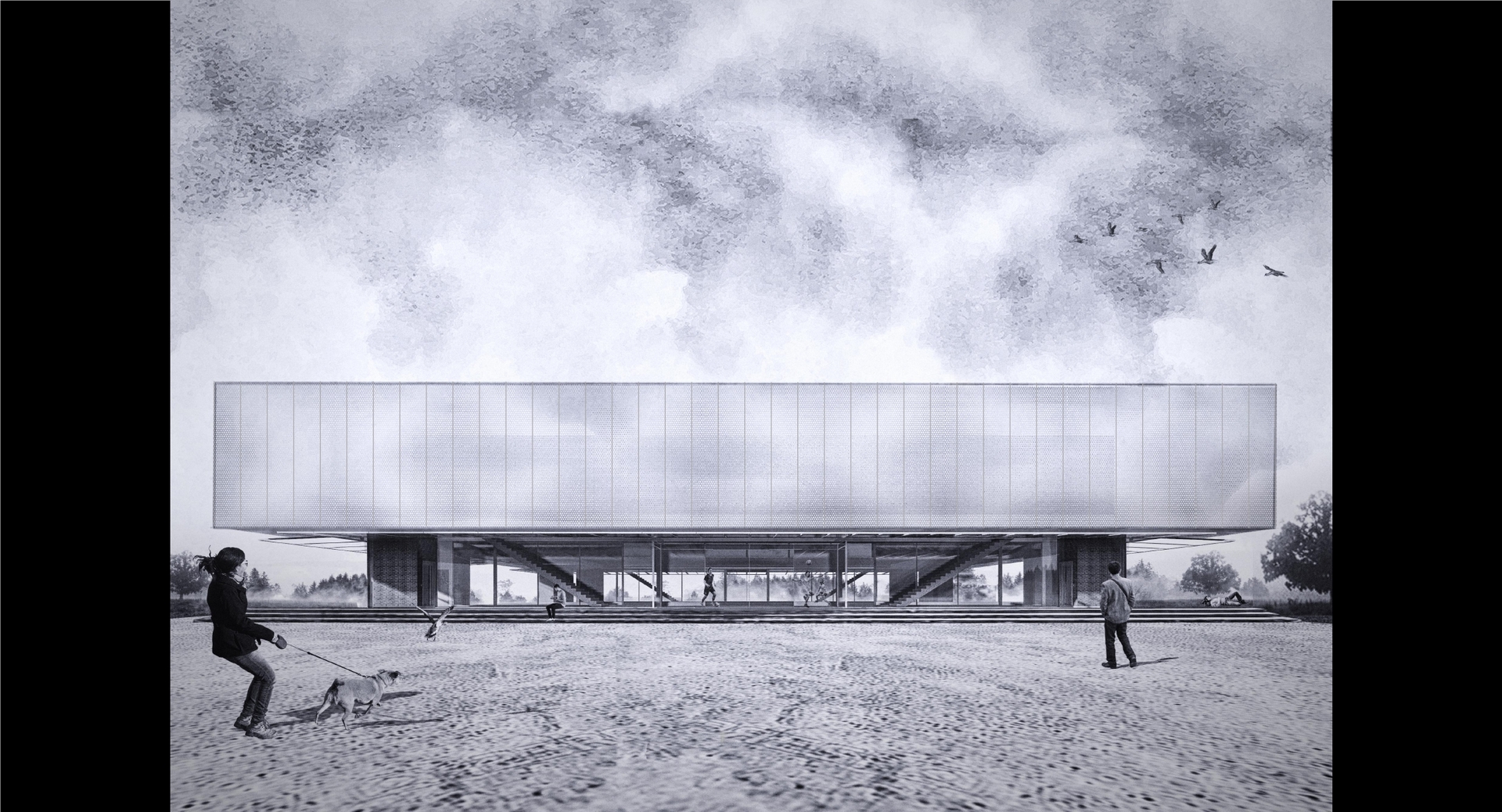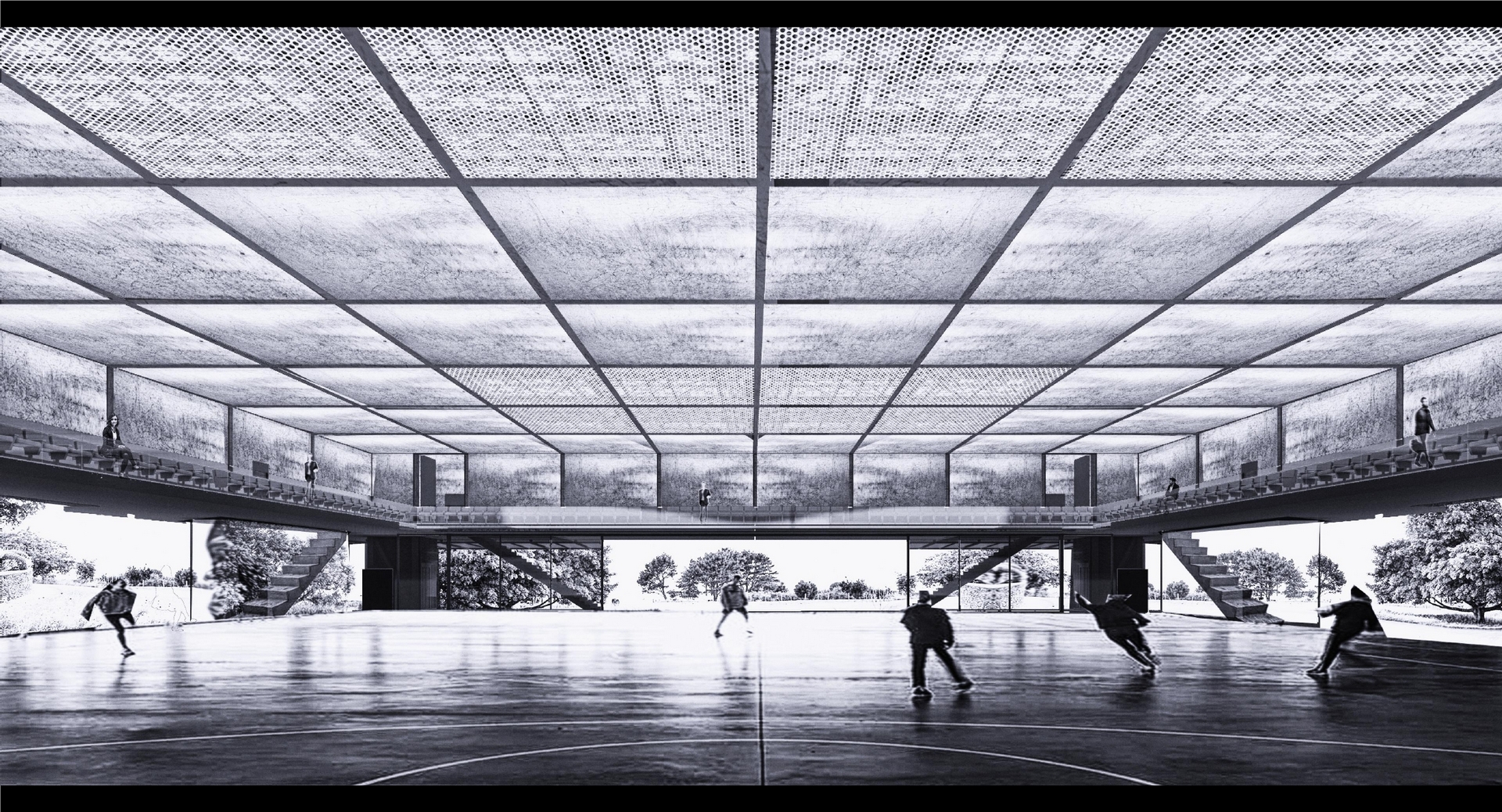 Lebdeći kubus dvorane, kojeg nosi čelična prostorna rešetka, natkriva 'otvoreni' sportski trg prizemlja. Pomoću rotirajuće - podiznih staklenih stijena trg se zimi pretvara u unutarnji prostor dvorane, a ljeti postaje vanjsko igralište povezano sa okolnim krajolikom.