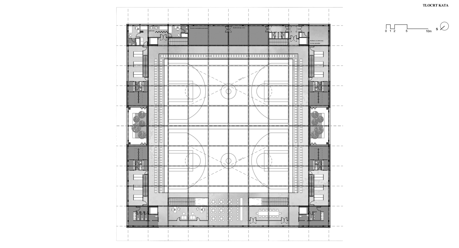 Sve prateće prostorije odignte su od tla i nalaze se na katu. Tako i svlačione koje se u parovima mogu spojiti u jednu zajedničku preko vanjskog atrija te omogućiti korisnicima nesmetan boravak u prirodnoj oazi. Gledalište koje se obodno na katu galerijski proteže, obgrljuje dvoranu poput velikog balkona.