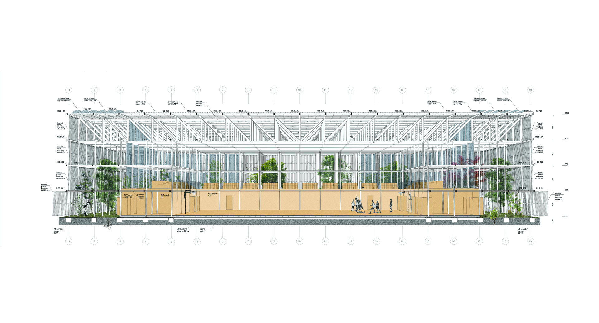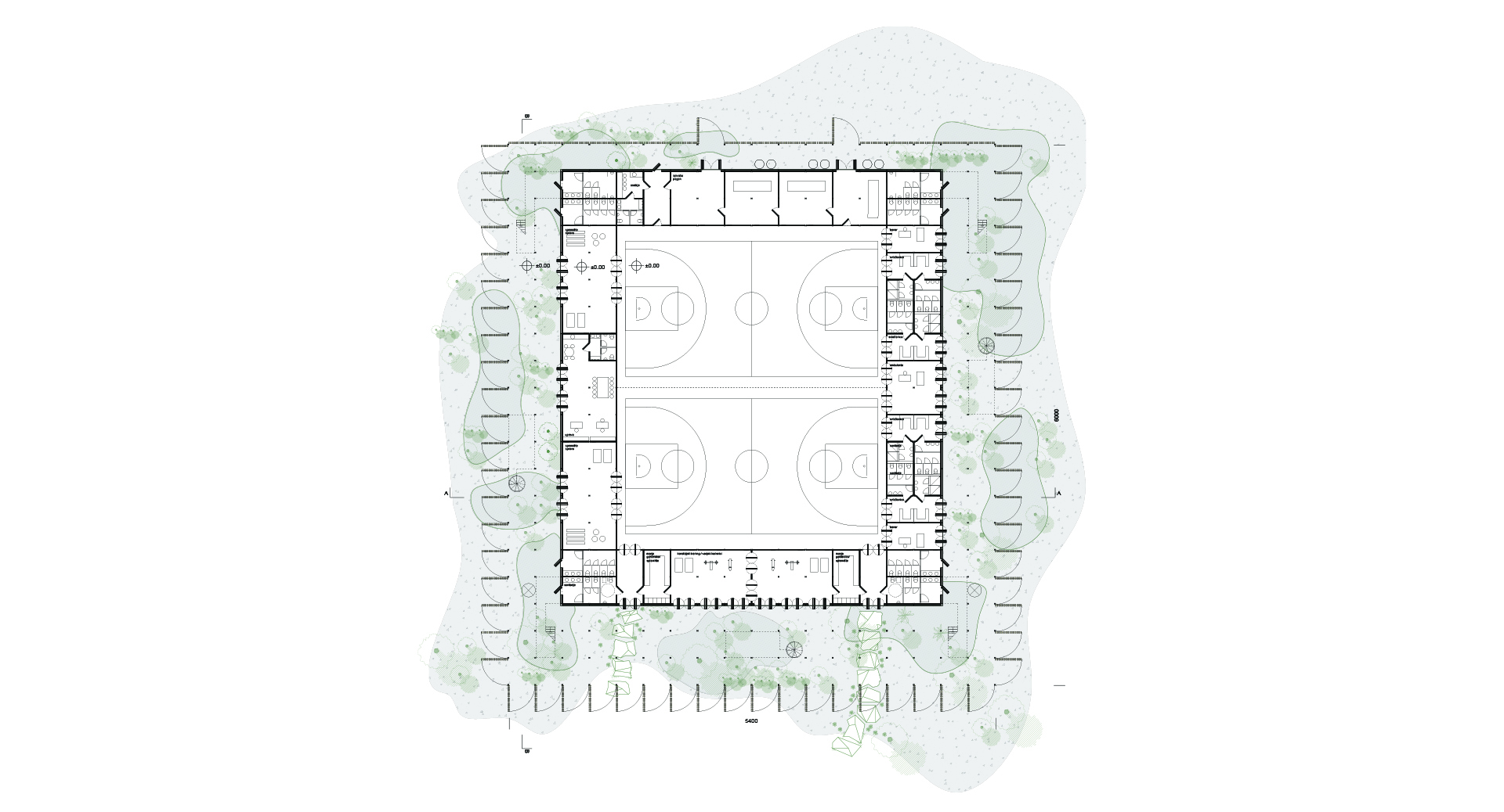 Dvorana se osmišlja kao pravilna pravokutna građevina, smještena na parceli u odnosu prema formiranom šumskom okolišu u koji gleda. Zgrada je koncipirana kao objekt s dvostrukim klimatskim zonama. Prostor između vanjske fasade i unutranje termičke granice sadrži klimatsku međuzonu naseljenu zelenilom u službi pasivne zaštite od vrućine, sunčevog zračenja, nečistog zraka, buke i osvjetljenja, istovremeno i kao predprostor s društvenom funkcijom. Zgrada razlikuje ljetni i zimski režim korištenja. Vanjsko pročelje od drvenih letvica rastvara se prema vanjskom okolišu, a unutrašnja staklena stijena otvara se prema unutarnjem klimatskom međuprostoru, prožimajući interijer sa zelenilom. U zimskom se režimu zgrada 'zatvara' i grije od unutrašnje staklene stijene prema svom središtu. U klimatski su međuprostor zasađena stabla lokalne vegetacije poput kestena, hrasta, šljive i bukve, te odgovarajućeg niskog zelenila i paprati. Formirane su uzvisine sa zemljanom podlogom gdje je vegetacija intenzivnija, a ostatak je pokriven rasutim šljunkom.