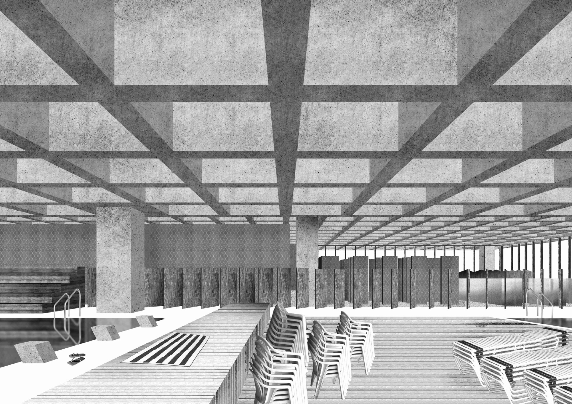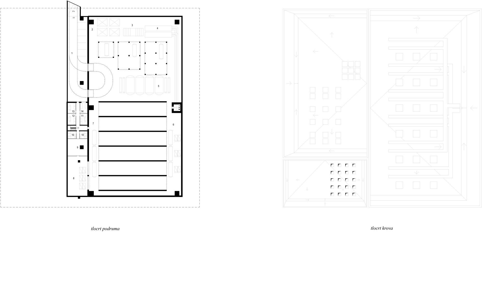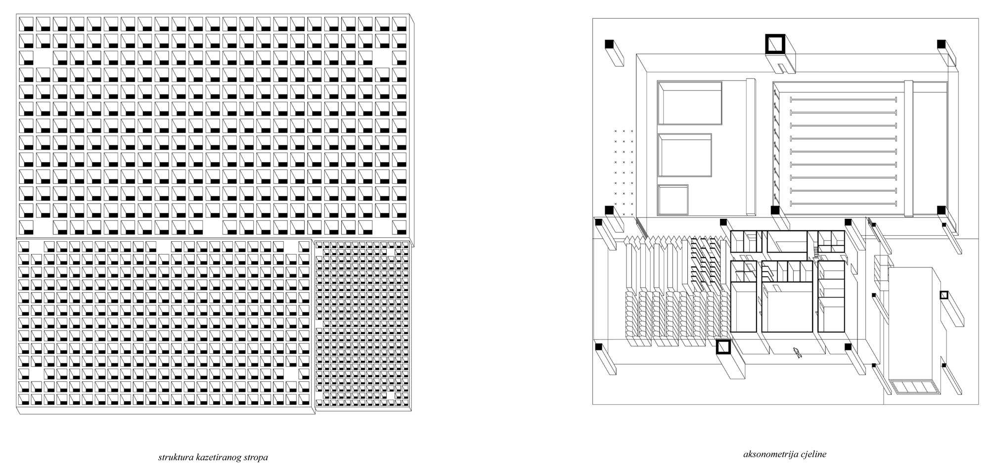 Prostor se natkriva kazetiranim stropom dimenzioniranim prema formatu potrebne dvorane. Dvorana se multiplicira ista u proporciji i materijalu, mijenja mjerilo prema potrebama prostornog programa. Sukladno tome mijenjaju se dimenzije greda i stupova, visina prostora... Dvorane u kontinuiranom ritmu čine zgradu u cjelini, sa tri stropa i tri poda. U svakoj dvorani sadržana su dva kvadratna polja određena stupovima. U svakom polju je sadržaj projektiran kao zaseban entitet. Unutar svakog entiteta kretanje je drugačije, ovisno o zahtjevanom funkcionalnom režimu. Zgrada se doima istovremeno racionalna i neracionala, masivna i lagana, robusna i fragilna.