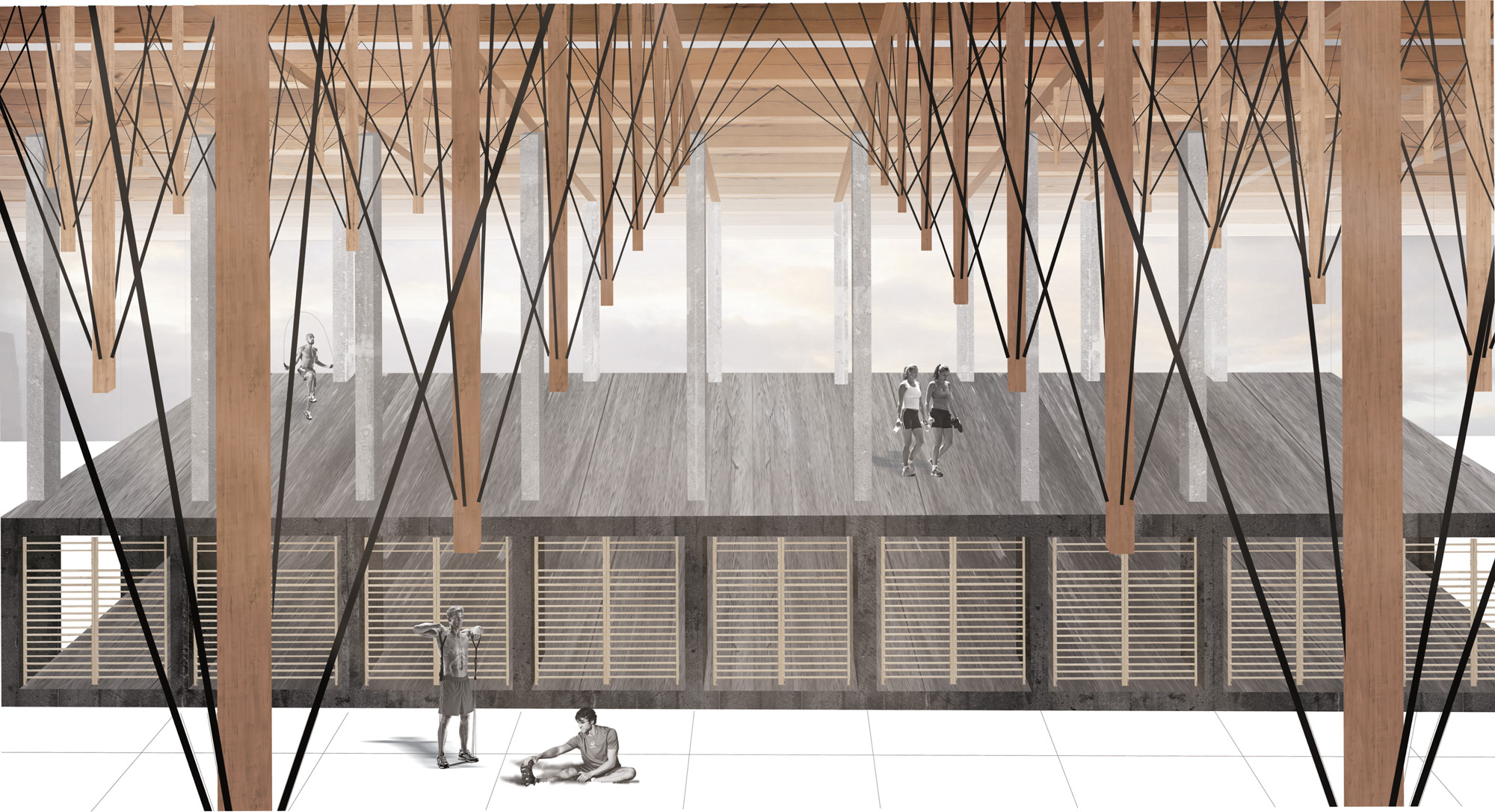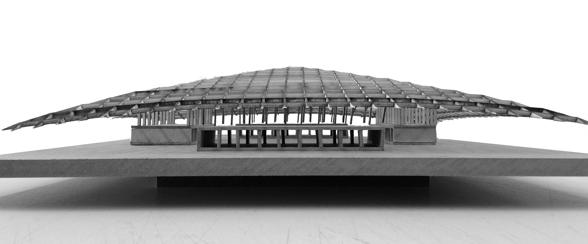 sustavom tlačnih drvenih vertikala i kosih zatega. Time razlikujemo prostor oko dvorane i samu dvoranu koja dobiva svoje „nebo“. Osim tehničkog elementa, lagana i elegantna konstrukcija krova postaje važan čimbenik u doživljaju prostora.