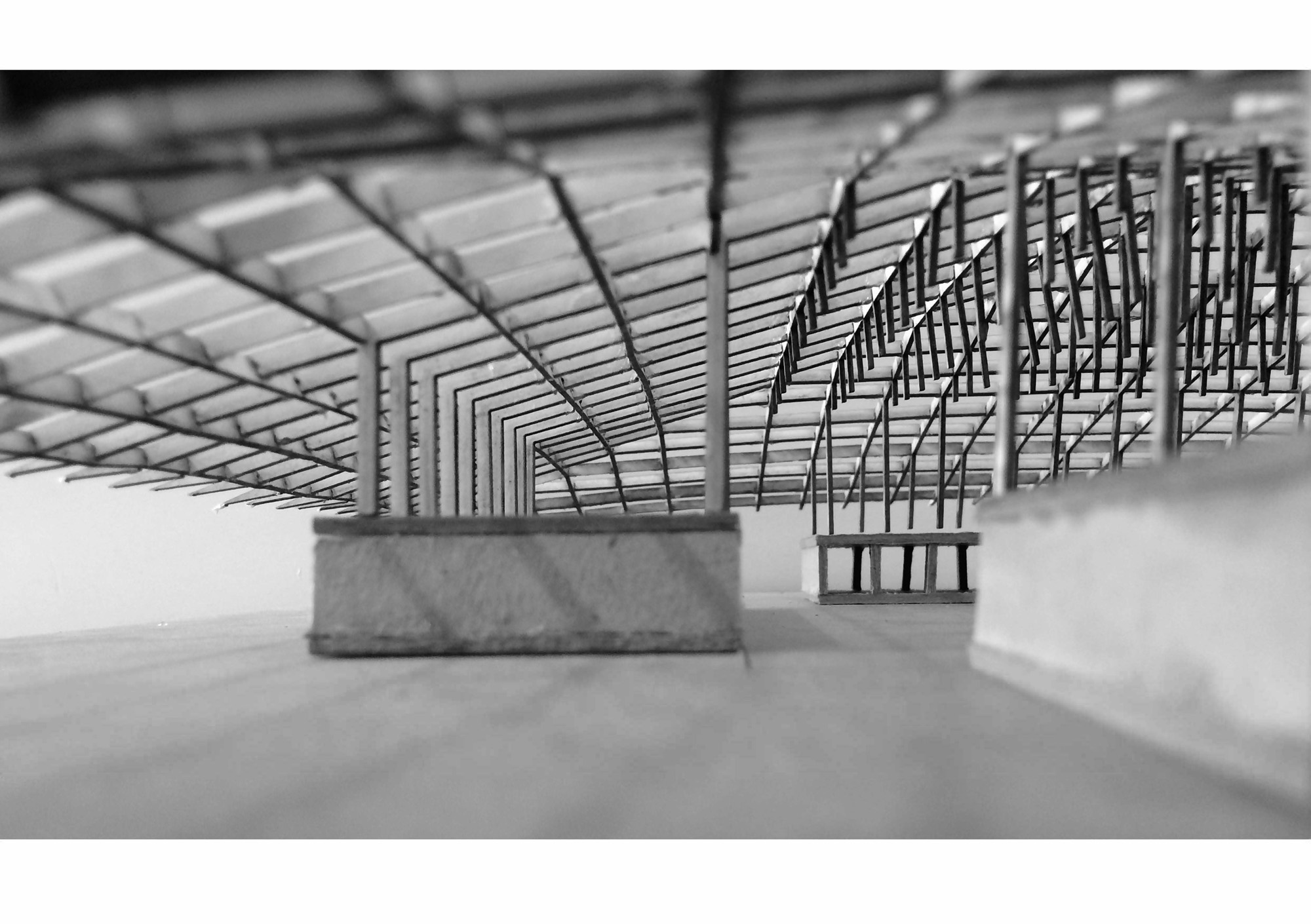 Težina krova prenosi se na paviljone pratećih i servisnih sadržaja preko parova armirano-betonskih stupova koji se povlače u drugi plan u odnosu na unutarnju i vanjsku fasadu. Time prostor kata ostaje prostorom između – lišen prostornih pregrada, na jednak način komunicirajući sa svim