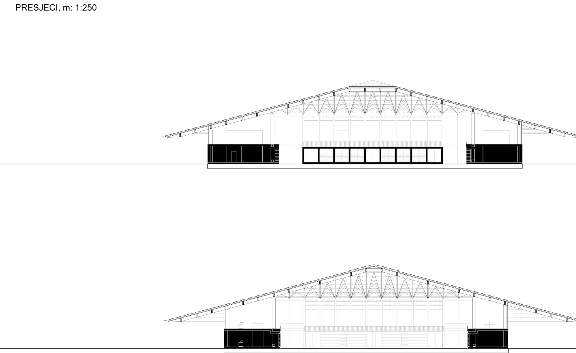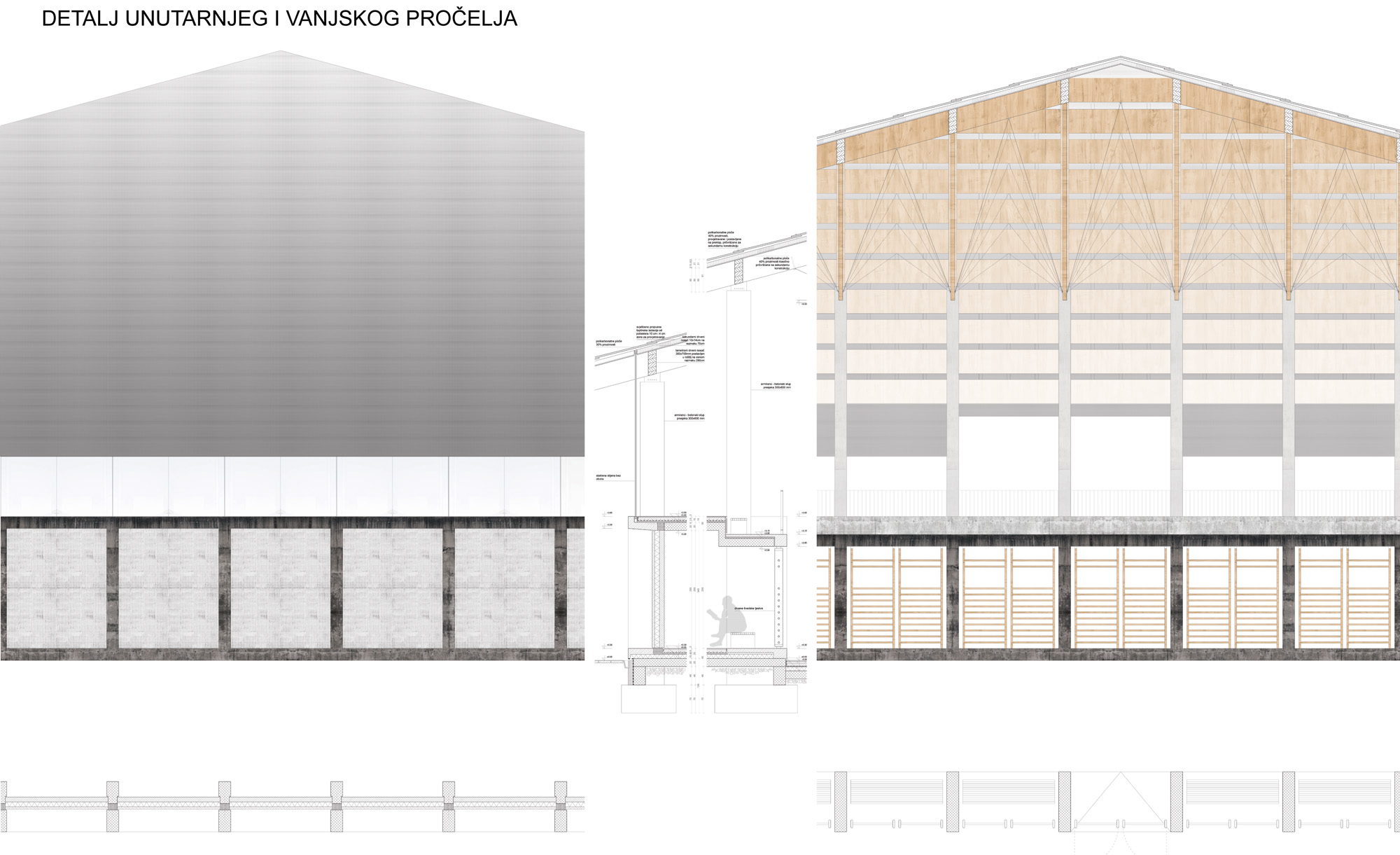 Nosači krova, paviljoni pratećih i servisnih sadržaja dvorane, formiraju pročelje dvorane na jednak način tretirajući interieur i exterieur.