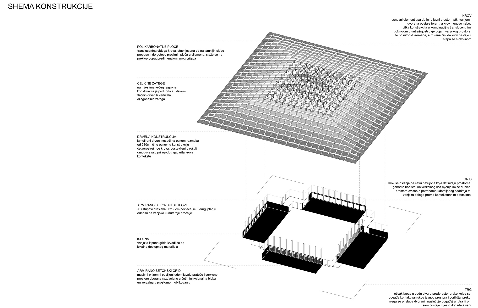 Taj gradski krov izdvaja se kao autonoman arhitektonski element koji dozvoljava kući da se sama gradi pod njim. Iako predimenzioniran, svojom niskom roštilj konstrukcijom dimenzioniranom prema manjem rasponu, zadržava čovjeku blisku mjeru te se na mjestima većeg raspona podupire