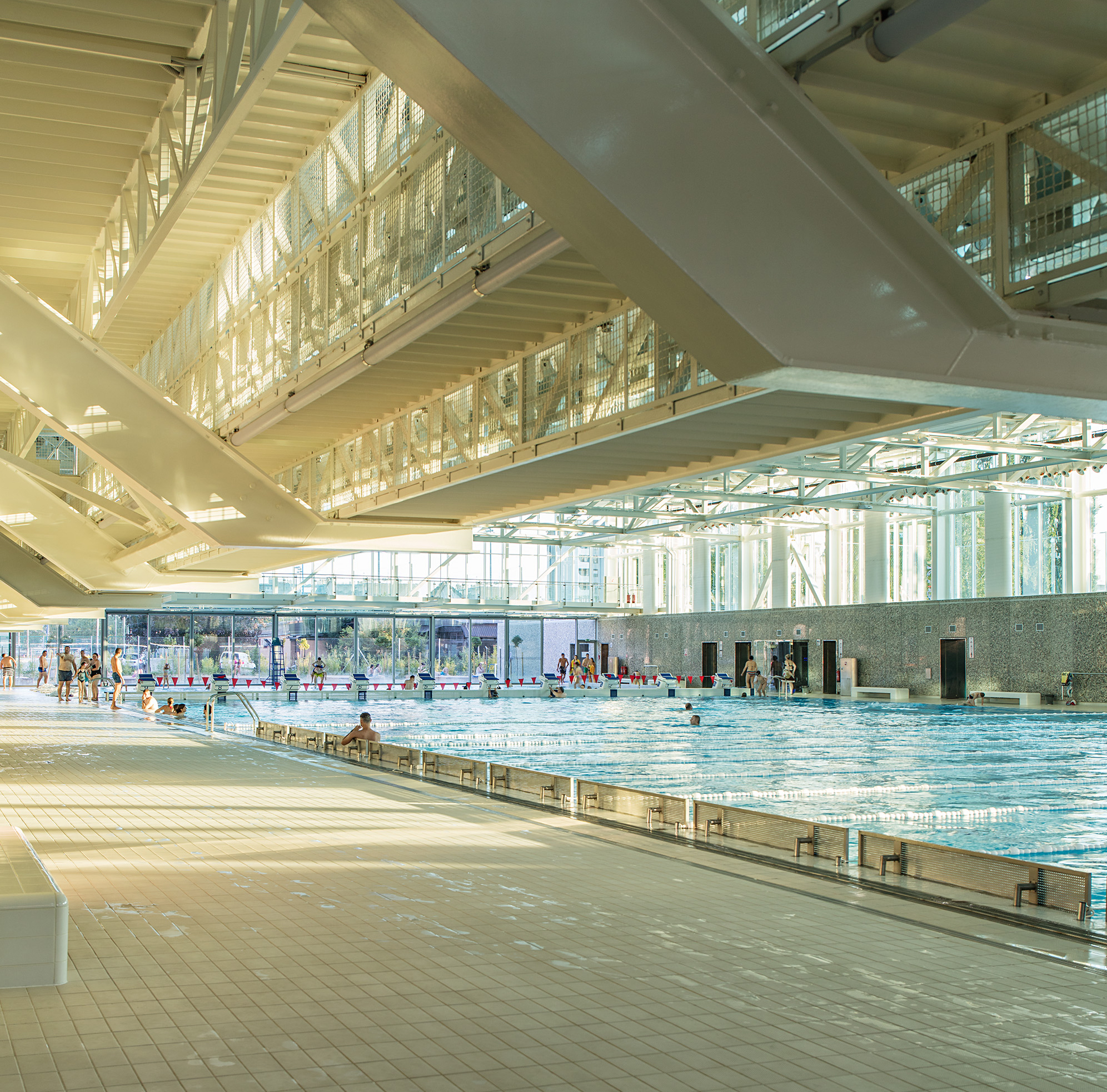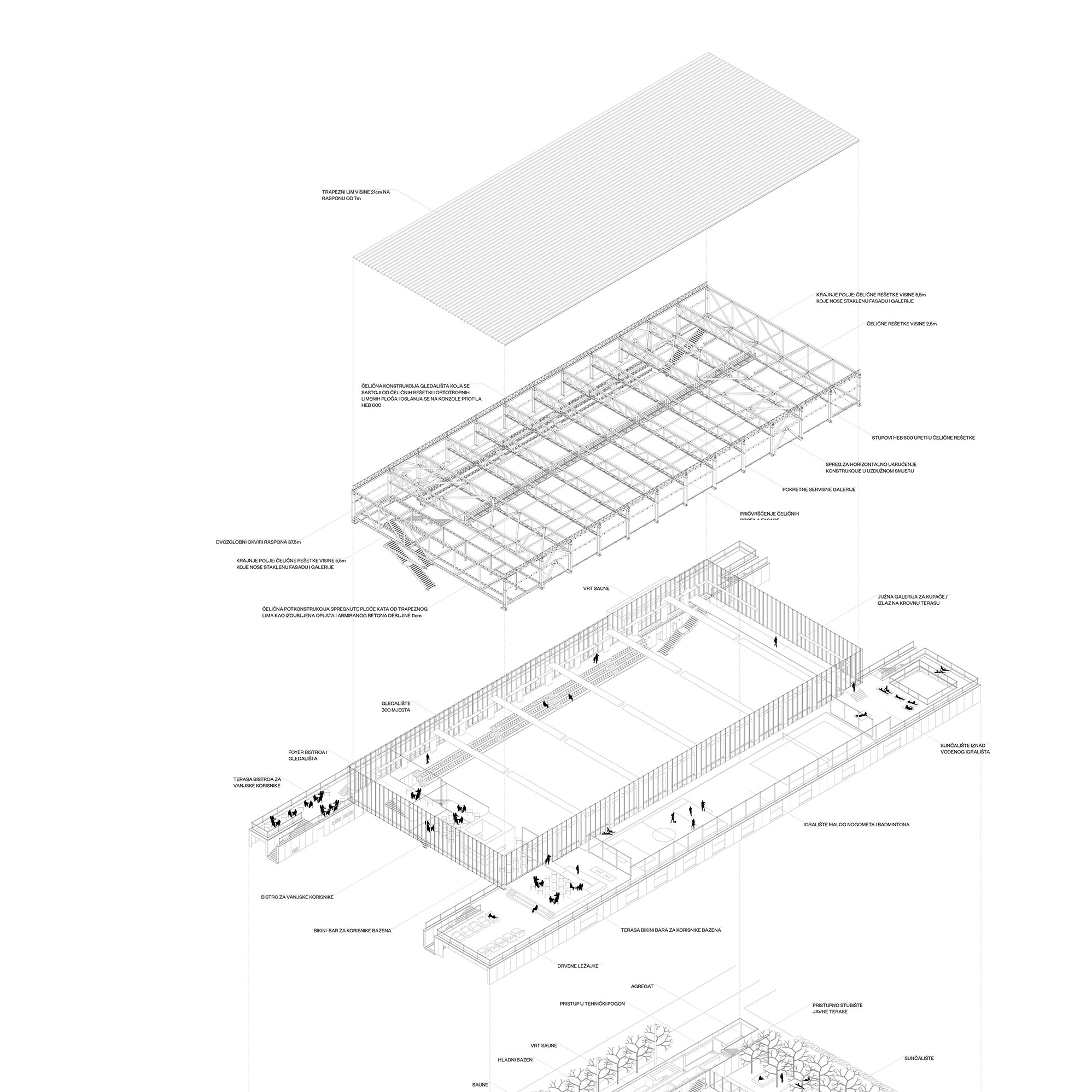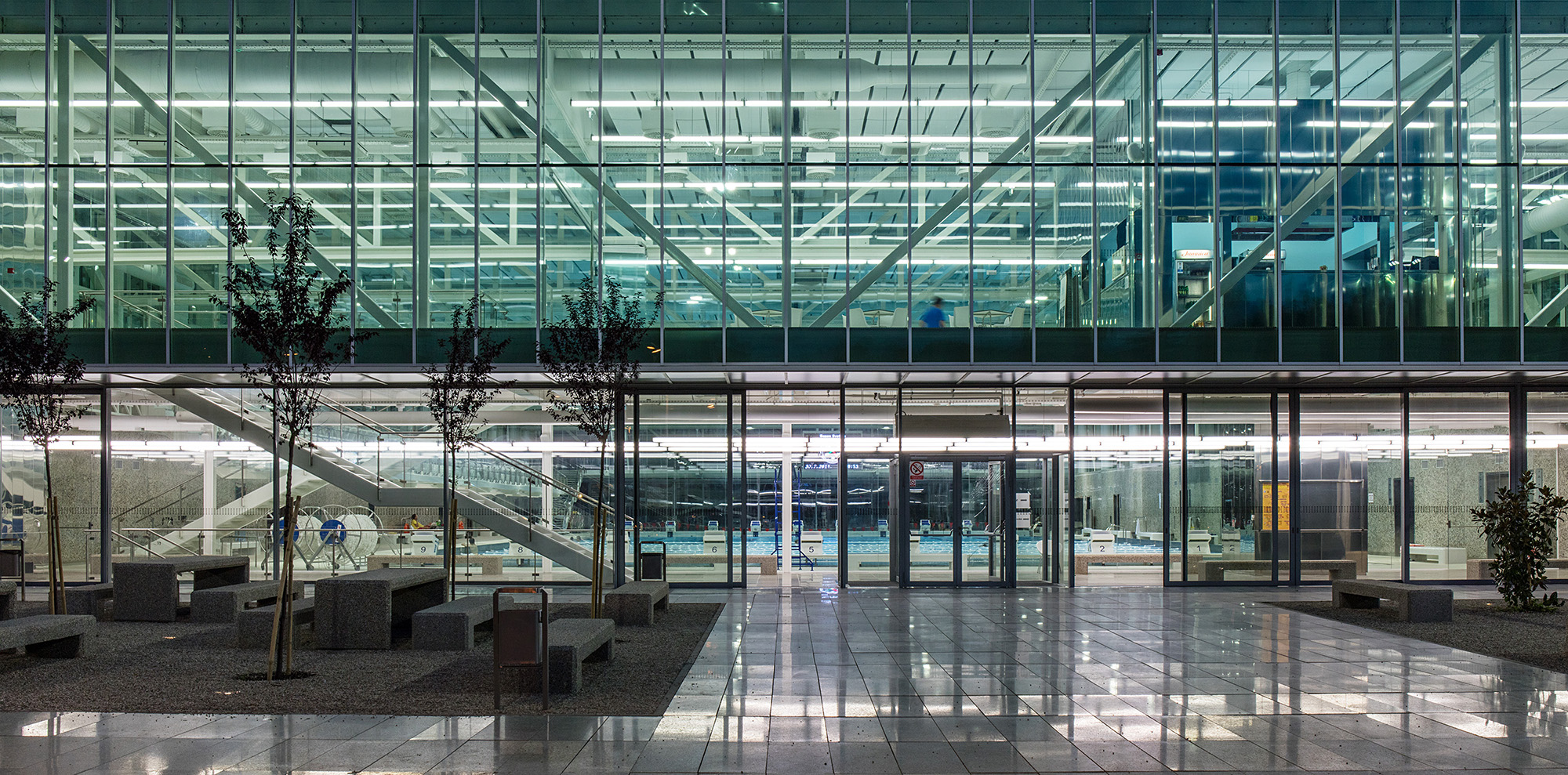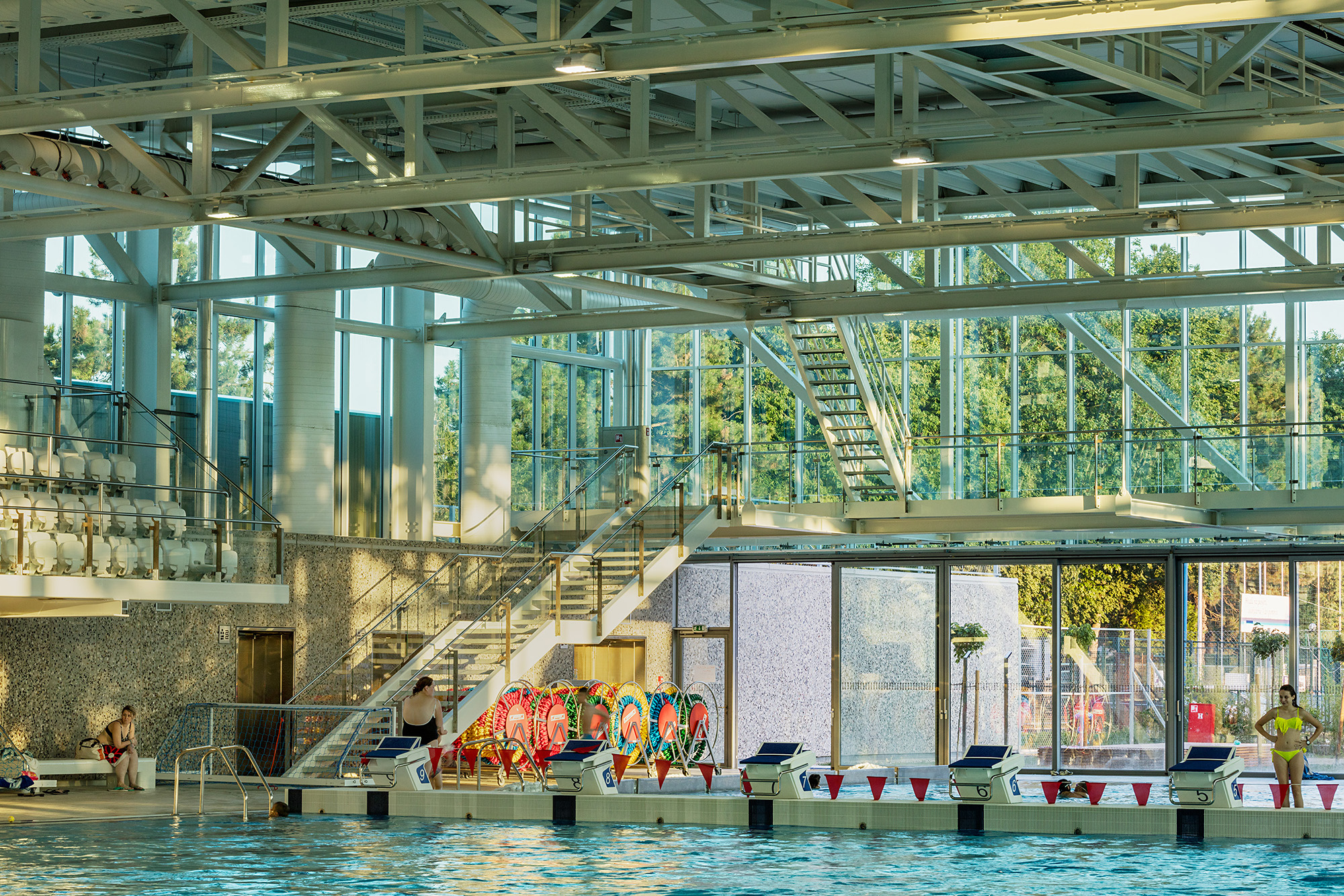 Jasnoga i kontekstualno utemeljenoga prostornog koncepta, s dvjema punim lamelama pomoćnih sadržaja između kojih je razapeto elegantno transparentno tijelo glavne dvorane plivališta, dosljedno je promišljen na svim razinama – od funkcije, konstrukcije, tehničkih aspekata, pa sve do samog oblikovanja. Precizna filigranska čelična konstrukcija i minuciozno oblikovana staklena ovojnica pretvaraju veliko tijelo dvorane u prozračnu i rastvorenu središnju poveznicu, koja preko transparentnih stijena i reflektirajućih vodenih površina u sebe uvlači okolnu prirodu te doživljajno spaja šumoviti svjever i stambeni urbanitet juga, Maksimir s Borongajem, šumu s vodom, sport s gradom, eksterijer i interijer.