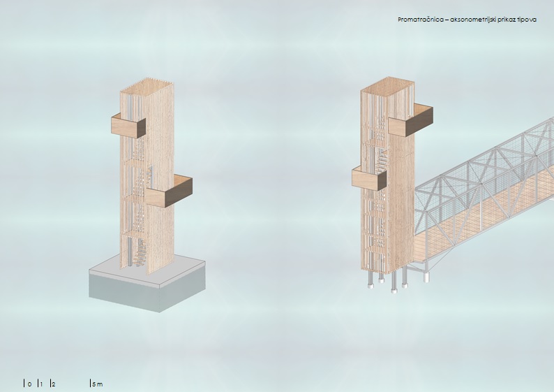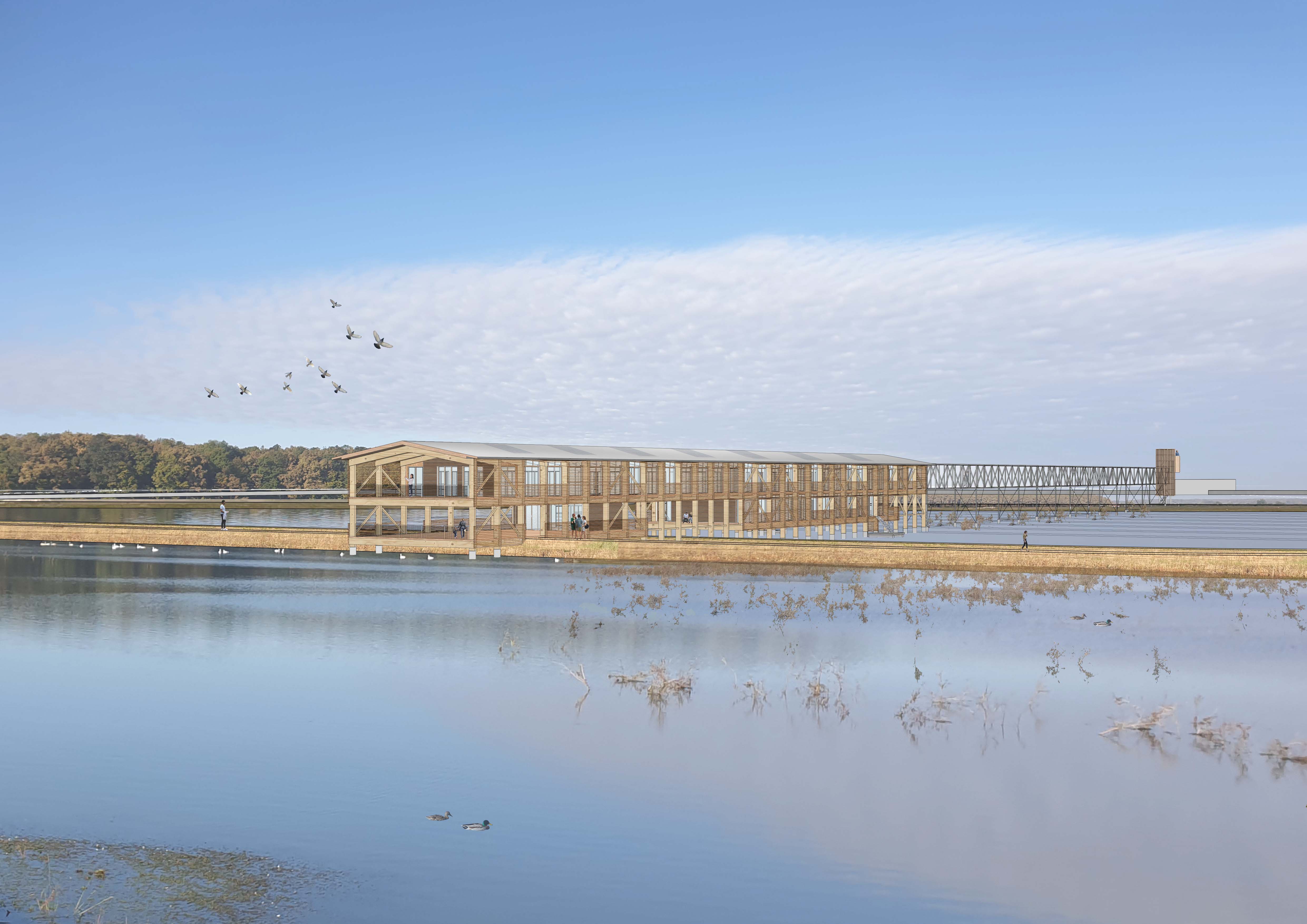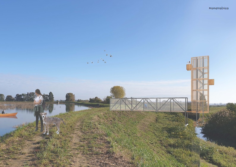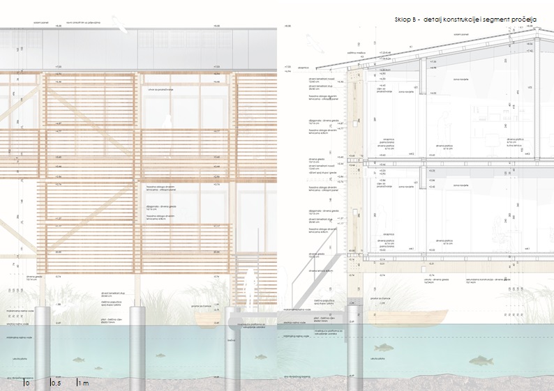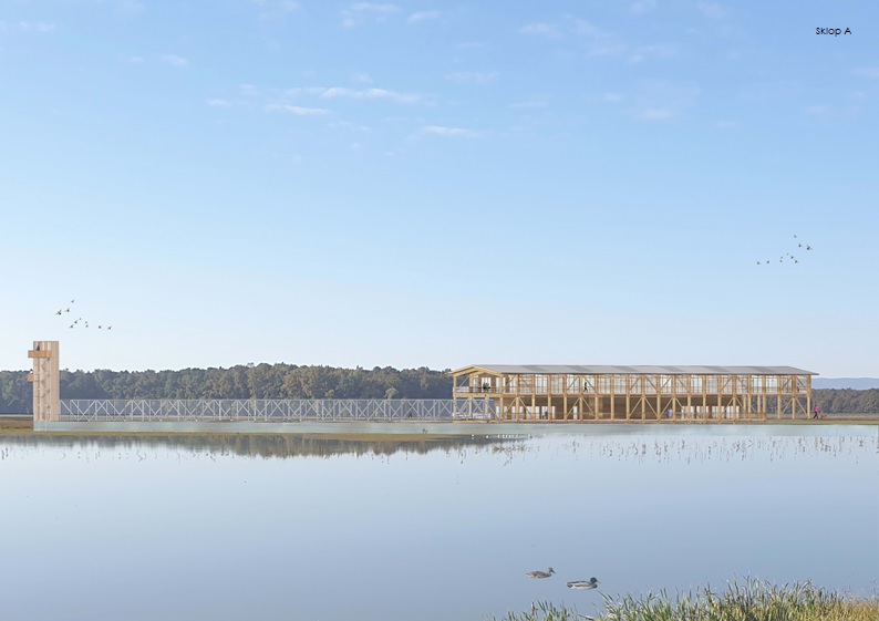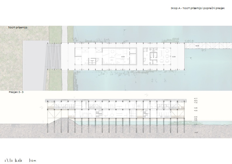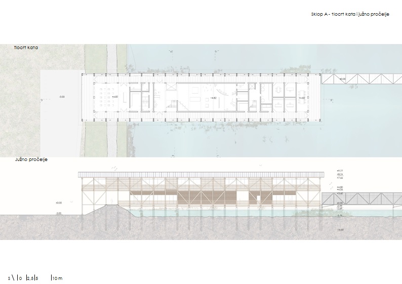 Sklopovi su jednostavne prostorne organizacije. Inspiraciju vuku iz tradicije prostora – linearna organizacija, podizanje kuće od vode, bočne komunikacije koje povezuju sadržaje - sa ciljem povezivanja prostora ispred i iza ribnjačkih nasipa.