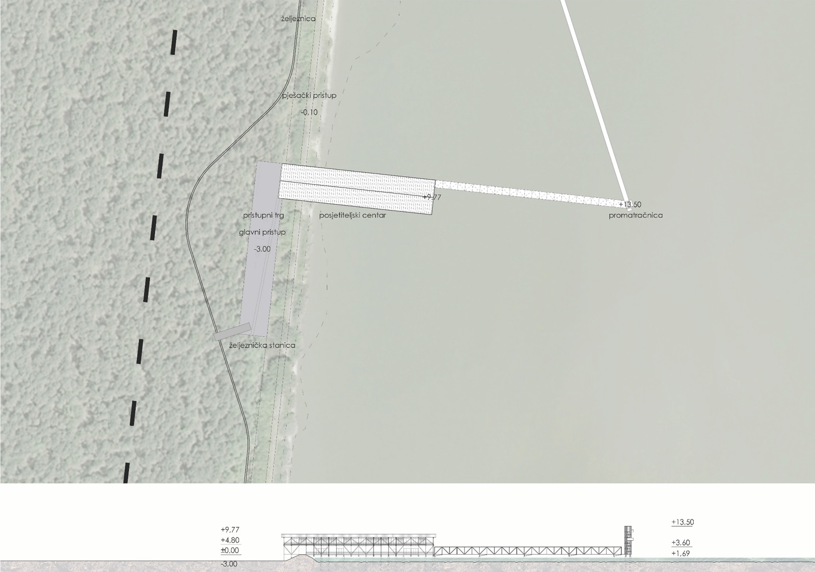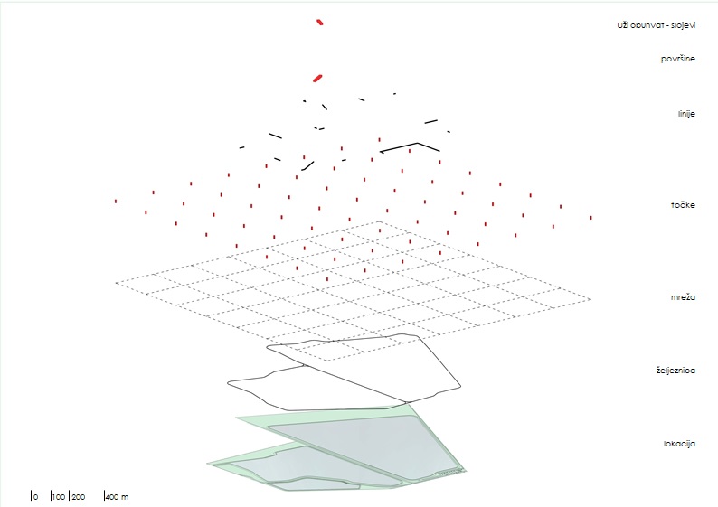 Oblikovna polazišta proizašla su iz analize lokacije i prisutnih elemenata – točka (promatračnica), linija (željeznica) i površina (ribnjak). Postavom mreže preko lokacije (asocijacija na postojeću poljoprivrednu parcelaciju) uvodi se organizacija u organičkom prostoru. U sjecištima mreže postavljaju se točke – jednake, ali specifične, koje služe kao orijentiri i sadržaji. Glavni sklopovi ne prate postavljenu matricu, već se ističu u prostoru kako bi privukli korisnika. Kretanje po obuhvatu riješeno je obnovom i dogradnjom postojećih kolosijeka uskotračne željeznice.