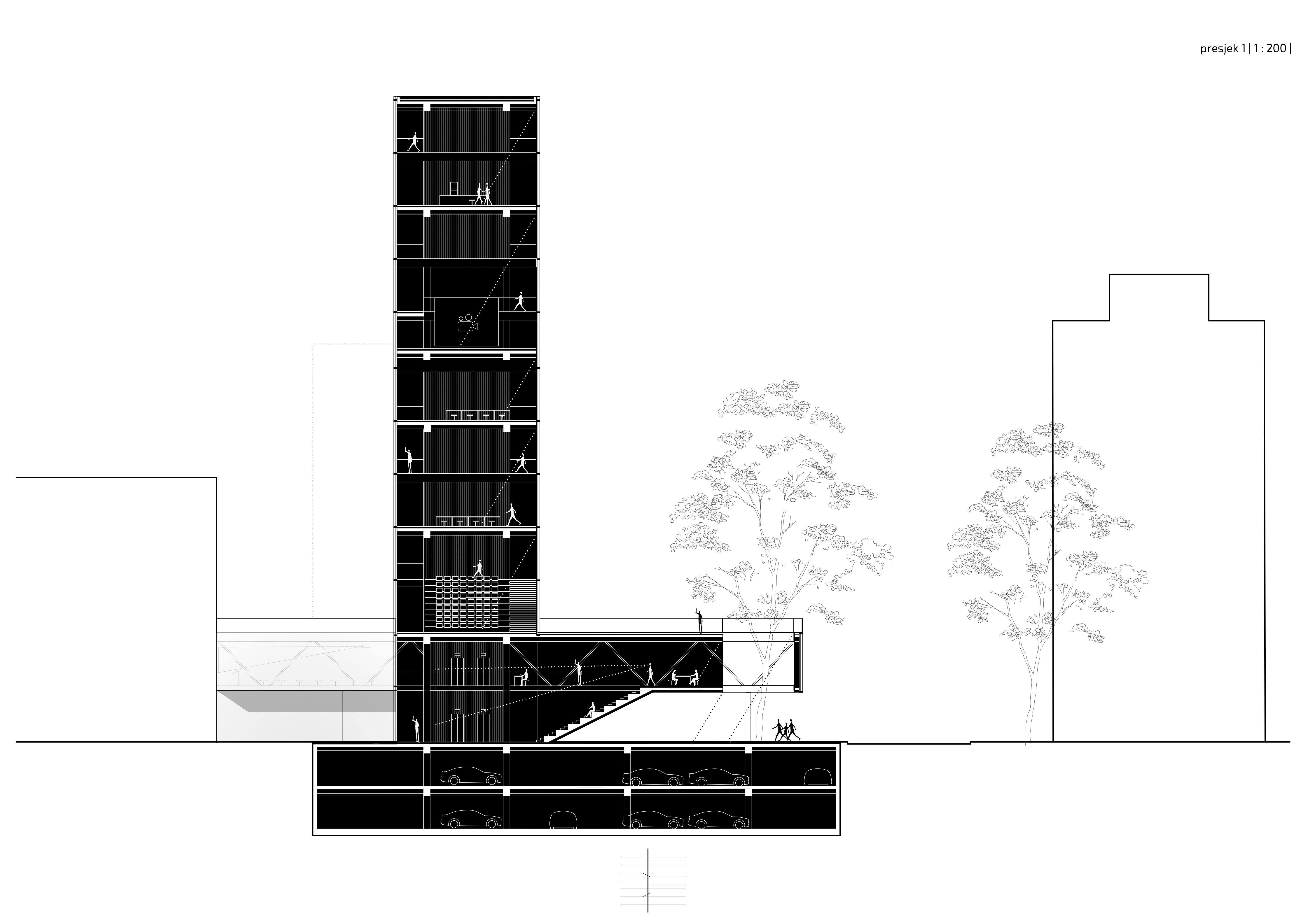 Centar za nove tehnologije s medijatekom organiziran je kroz dva ortogonalno postavljena volumena, koji svojom kompozicijom odgovaraju postojećoj izgradnji. Vertikalna lamela je postavljena kao reakcija na dominantne zgrade susjednih fakultetskih zgrada, dok horizontalni volumen predstavlja uzdignutu gradsku platformu koja u svoje tkivo prima nastavak drvoreda Kačićeve ulice. Ispod takve uzdignute platforme stvara se natkriveni pristupni trg sa snažnim ambijentom prodora svijetla i zelenila kroz atrije. Prozračnost i svjetlina vertikalne lamele ostvarena je malom širinom betonske zgrade sa obodno postavljenim koridorima i centralno postavljenim radnim jedinicama koje se zatvaraju po potrebi. Sjeverni i južni završetci svake etaže imaju ulogu interaktivnih punktova. Zgrada je po visini organizirana po funkcionalnim zonama – grupama etaža iste namjene za interne korisnike, dok je čelična horizontala prvog kata predviđena za grupni rad i vanjske korisnike. Horizontalni volumen probijajući kroz betonsku vertikalu, ima ulogu spone s ostatkom bloka.