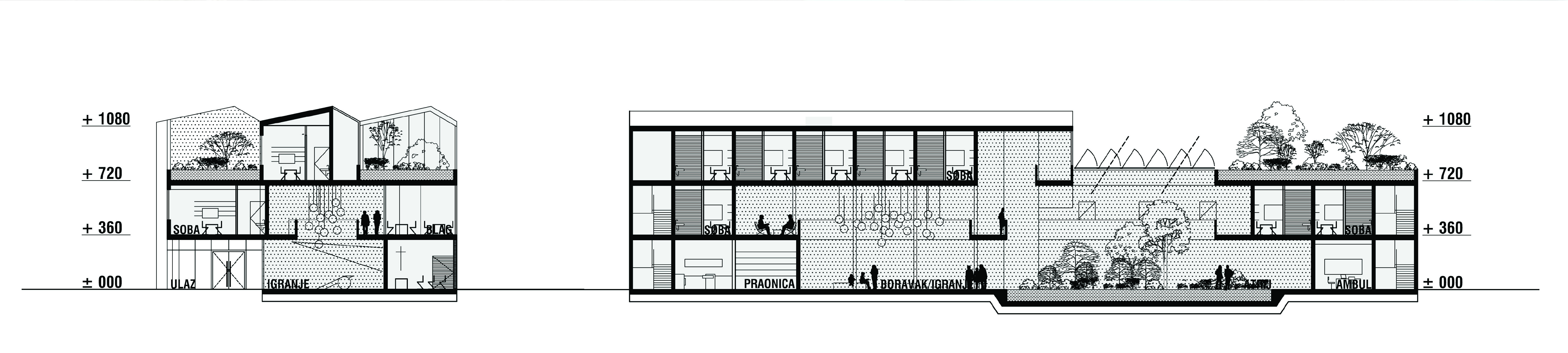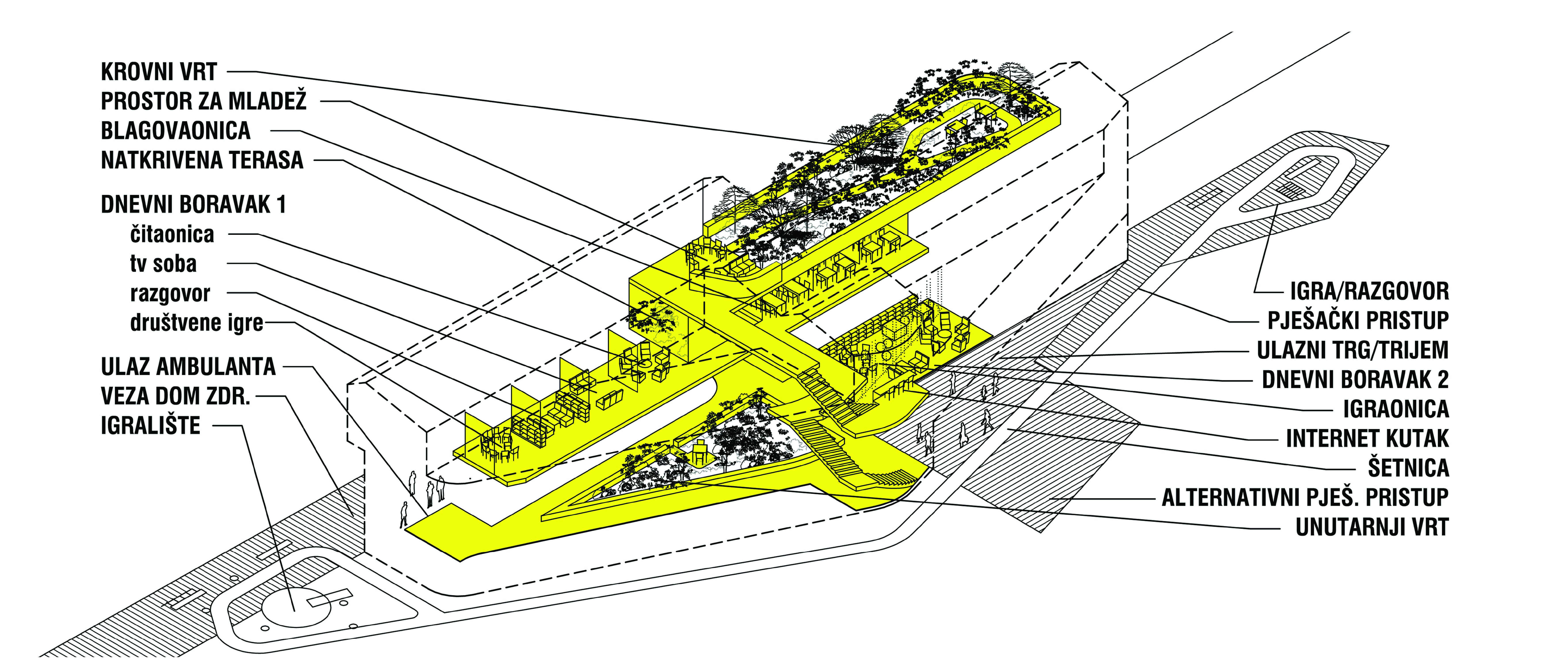 Priroda programa obiteljskog humanitarnog centra za skrb o oboljeloj djeci usmjerava pozornost na formiranje niza toplih unutarnjih situacija koje se fluidnim putanjama nadovezuju jedna na drugu. Izvana je kuća čvrsta, omotana kontinuiranom ovojnicom koja je ispuštena na mjestima uvučenih trgova, trijemova i vrtova/terasa i zaštitnička je. Iznutra je pak razvedena ambijentima 'doma daleko od doma'. Kuća se odnosi prijateljski prema korisnicima i omogućava im da pronađu svoj kutak. Različita ali i kontrolirana mjesta za igranje, razgovore, učenje, šetnju ili odmor granaju se kroz unutrašnji prostor centra i prate dnevne potrebe djece i roditelja. Mjerilo kuće usitnjeno je nizom situacija koje nude empatičan odgovor na svakodnevicu korisnika. Kuća je pregledna u svakom trenutku iz raznih smjerova, a istovremeno omogućava povlačenje od zajedničke igre do mirnog i tihog kutka ili sobe. Vanjski prostor se u prizemlju preko glavnog ulaznog trga uvlači u središte, a sjeverni trijem uz alternativni ulaz u lječilišni dio nastavlja se na manji trg kojim se ostvaruje veza s domom zdravlja. Atrij, ozelenjene terase i krovni vrt stvaraju dodatne nanourbane situacije, isječke uređene prirode nadohvat svakodnevice u centru.