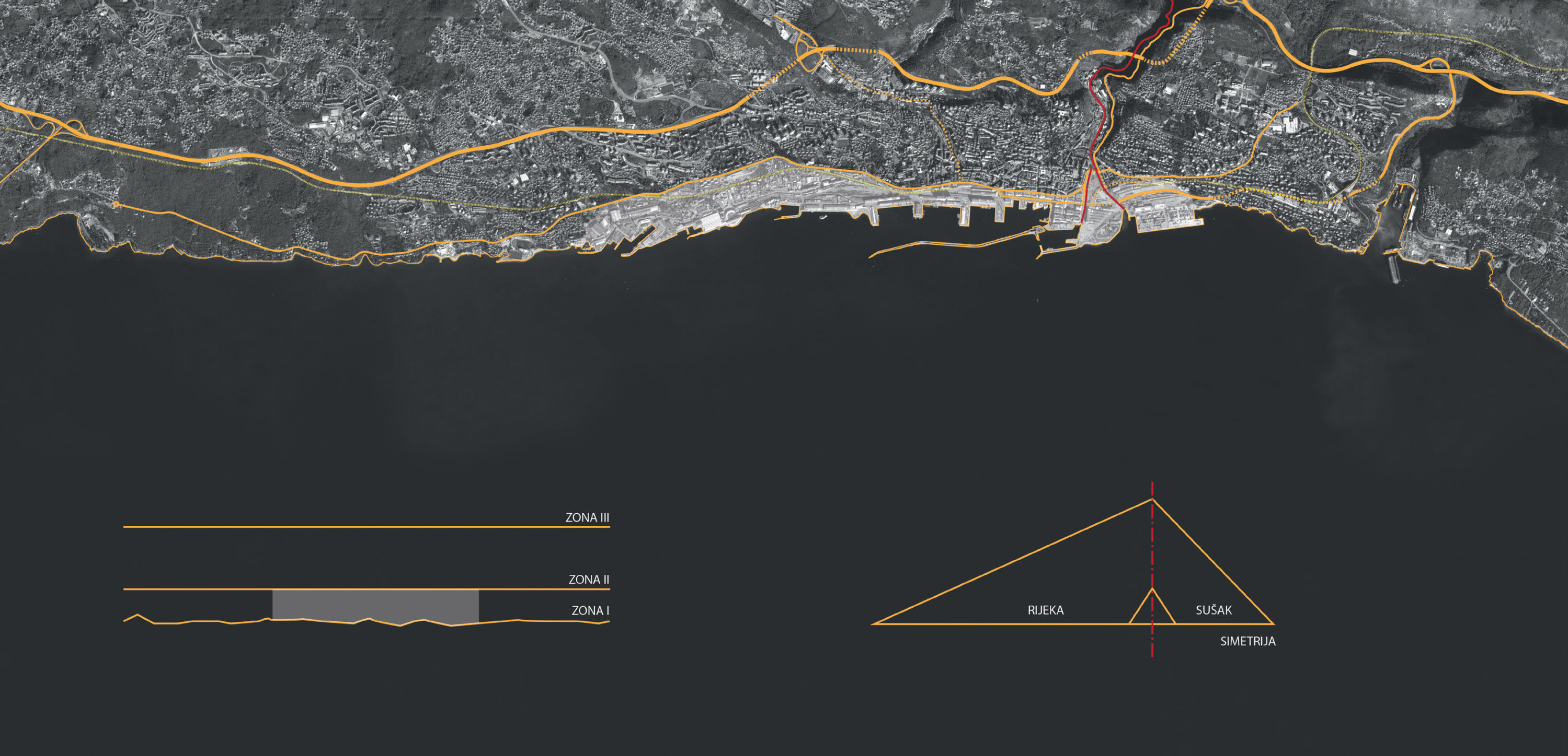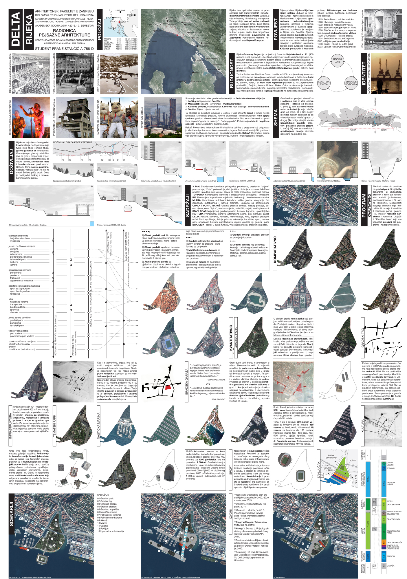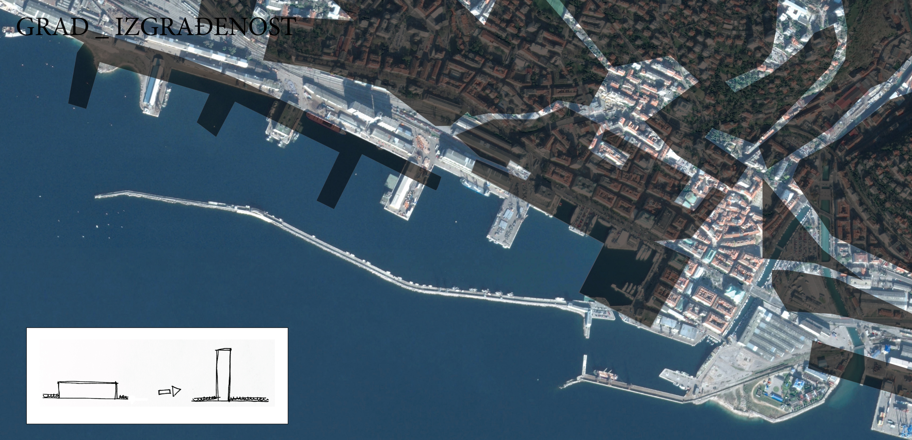 GARAŽA - grad već godinama vodi borbu sa prometom u mirovanju u užem i širem centru, velik dio otvorenih i vrijednih površina je prekriven automobilima na neekonomičan i nefunkcionalan način dok u gradu fali šetnica, prirode i kontakt s morem. Prijedlog je promet u strogom centru grada rasteretiti sa dvije garaža na ulaznim točkama, na zapadu i istoku, te otvorene parkinge smjestiti u njih te dodatno povečati kapacitet. Ona zapadna je u sklopu transportnog terminala Žabica, a istočna je na Delti. Lokacija je idealna za garažu jer je direktno spojena na obilaznicu, a istovremeno u samome centru grada te je moguće direktno ostvariti pješačke izlaze preko Mrtvog kanala na Korzo i Kazališni trg, preko Rječine na Sušak i prema jugu na budući glavni trg, park i dr.