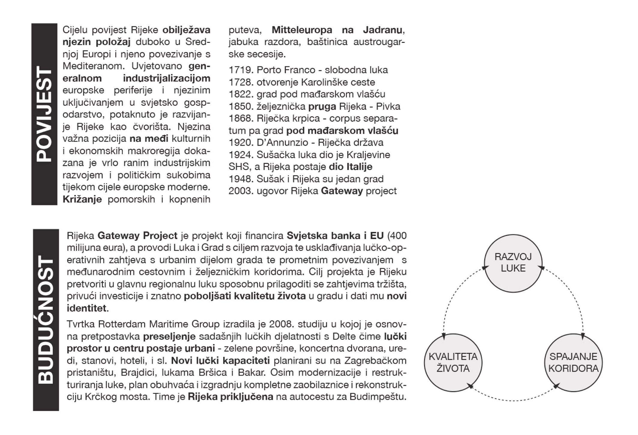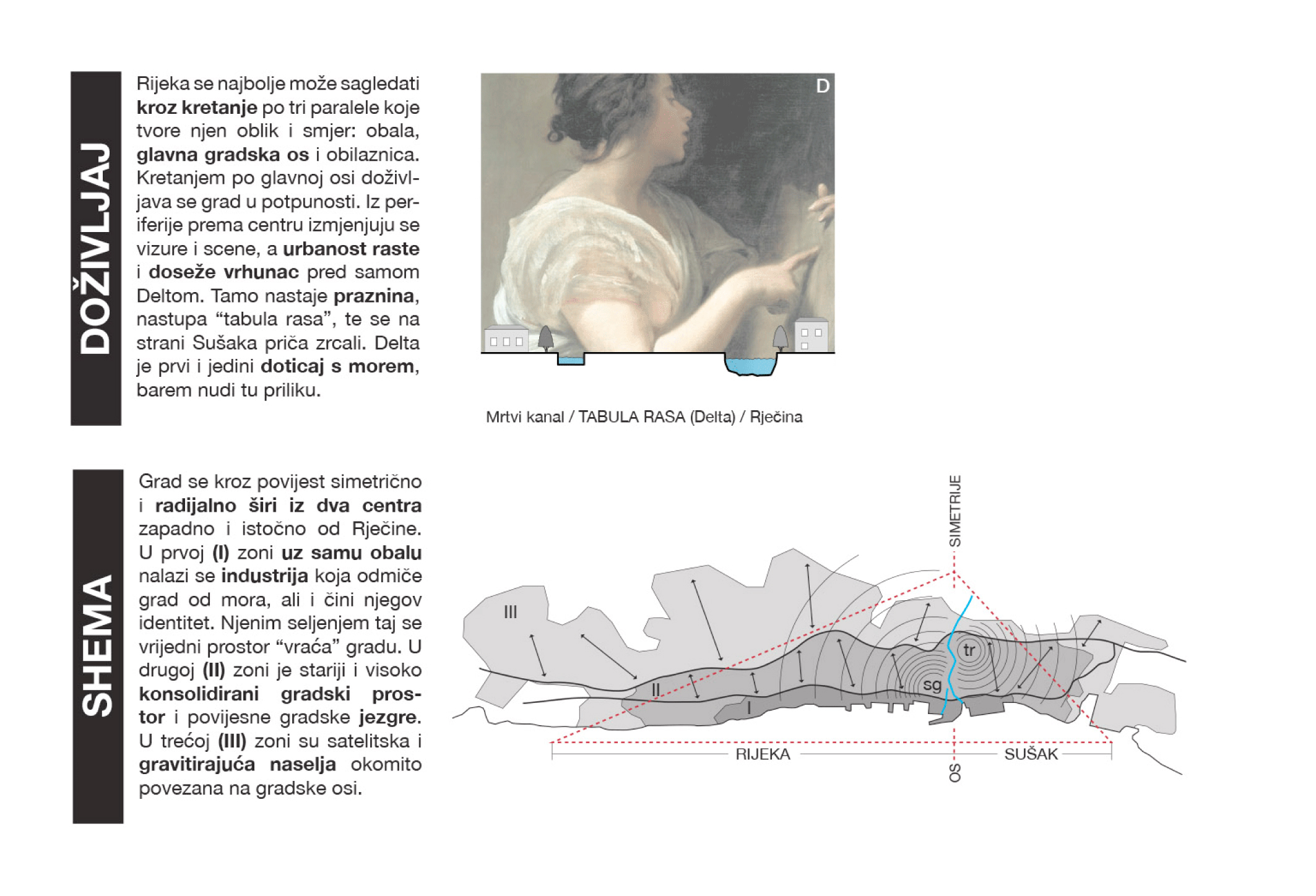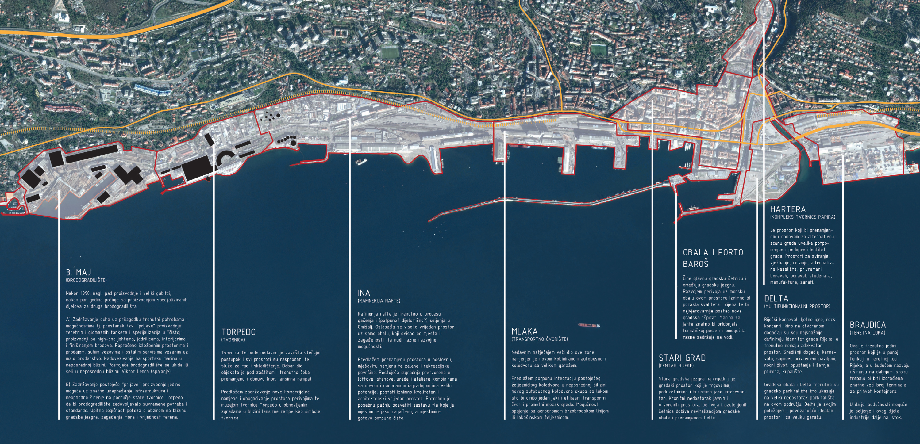 GARAŽA - grad već godinama vodi borbu sa prometom u mirovanju u užem i širem centru, velik dio otvorenih i vrijednih površina je prekriven automobilima na neekonomičan i nefunkcionalan način dok u gradu fali šetnica, prirode i kontakt s morem. Prijedlog je promet u strogom centru grada rasteretiti sa dvije garaža na ulaznim točkama, na zapadu i istoku, te otvorene parkinge smjestiti u njih te dodatno povečati kapacitet. Ona zapadna je u sklopu transportnog terminala Žabica, a istočna je na Delti. Lokacija je idealna za garažu jer je direktno spojena na obilaznicu, a istovremeno u samome centru grada te je moguće direktno ostvariti pješačke izlaze preko Mrtvog kanala na Korzo i Kazališni trg, preko Rječine na Sušak i prema jugu na budući glavni trg, park i dr.