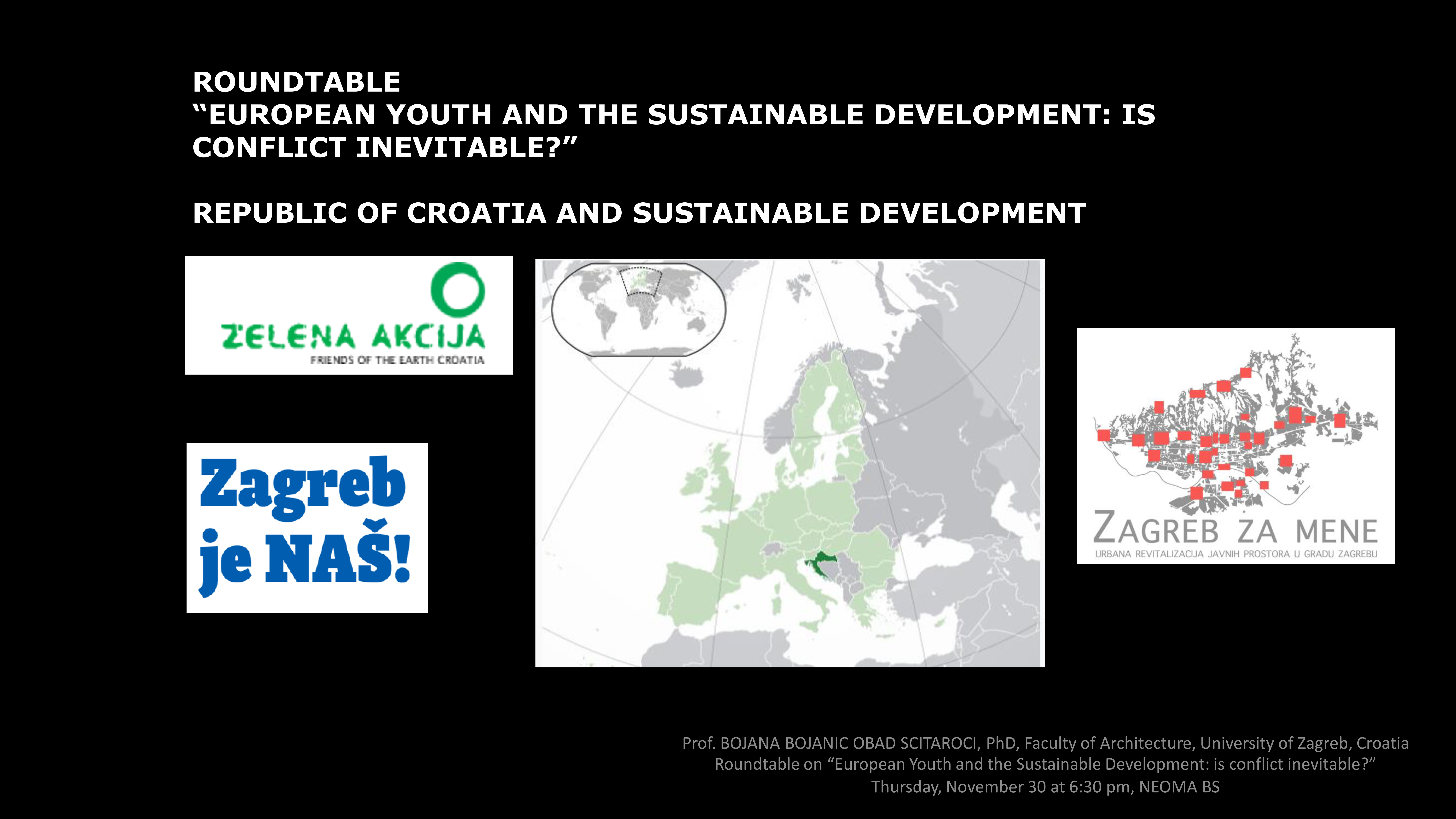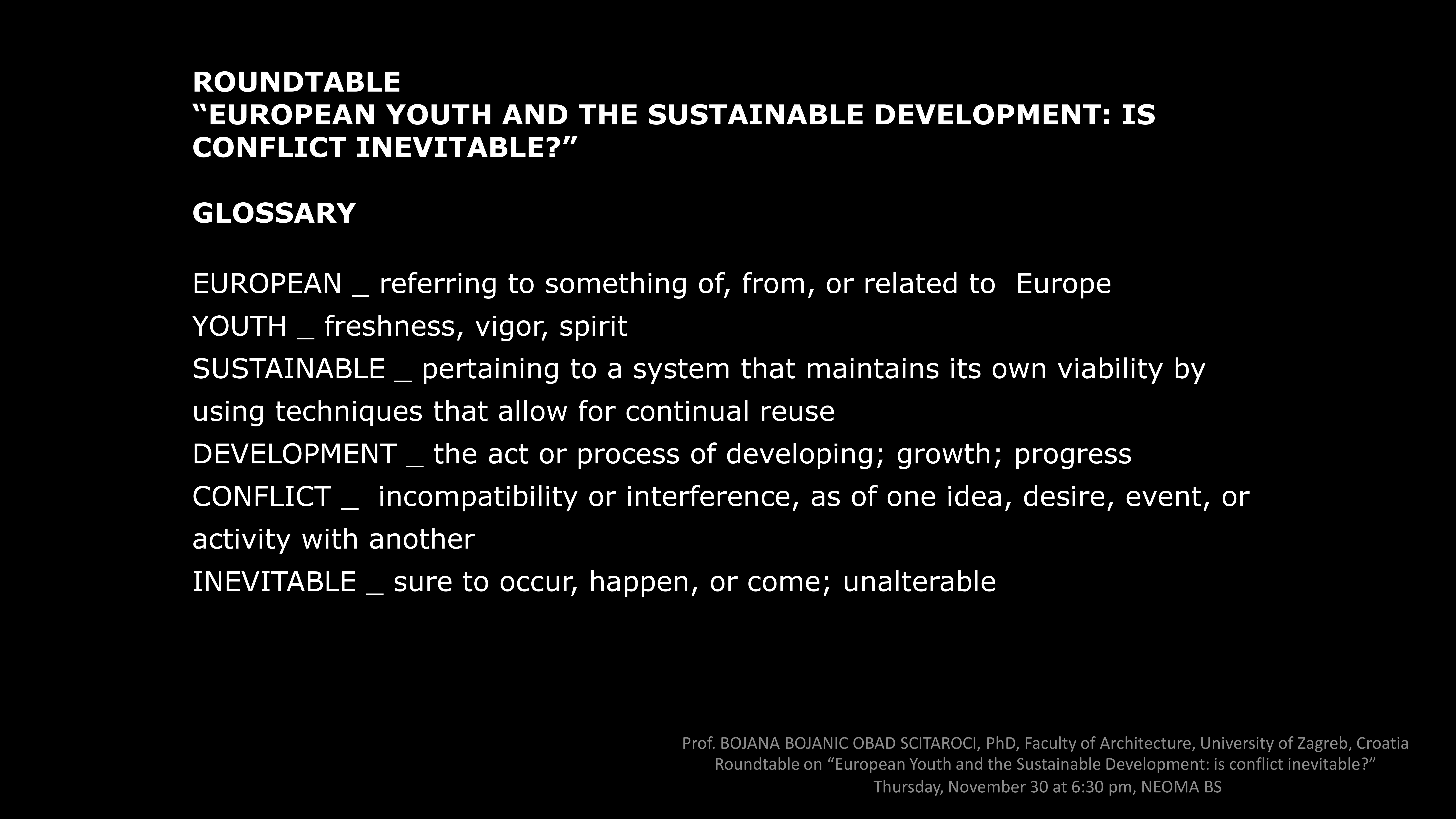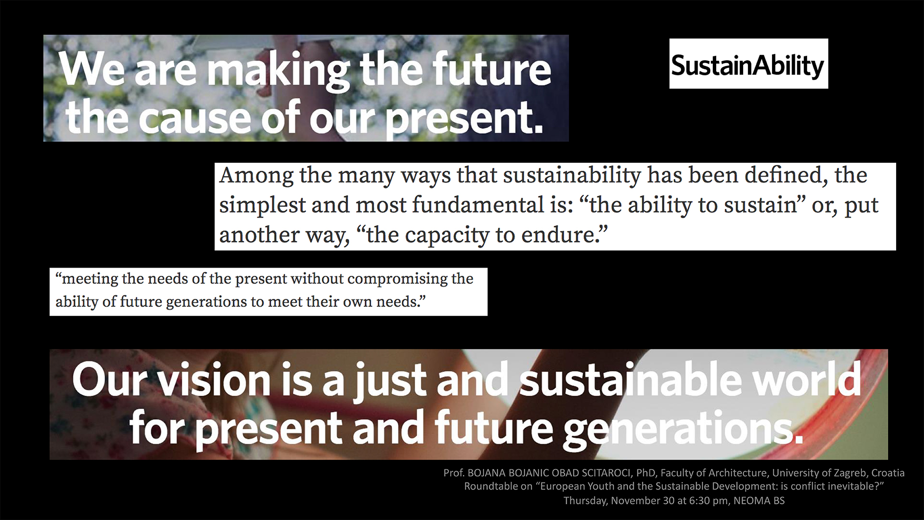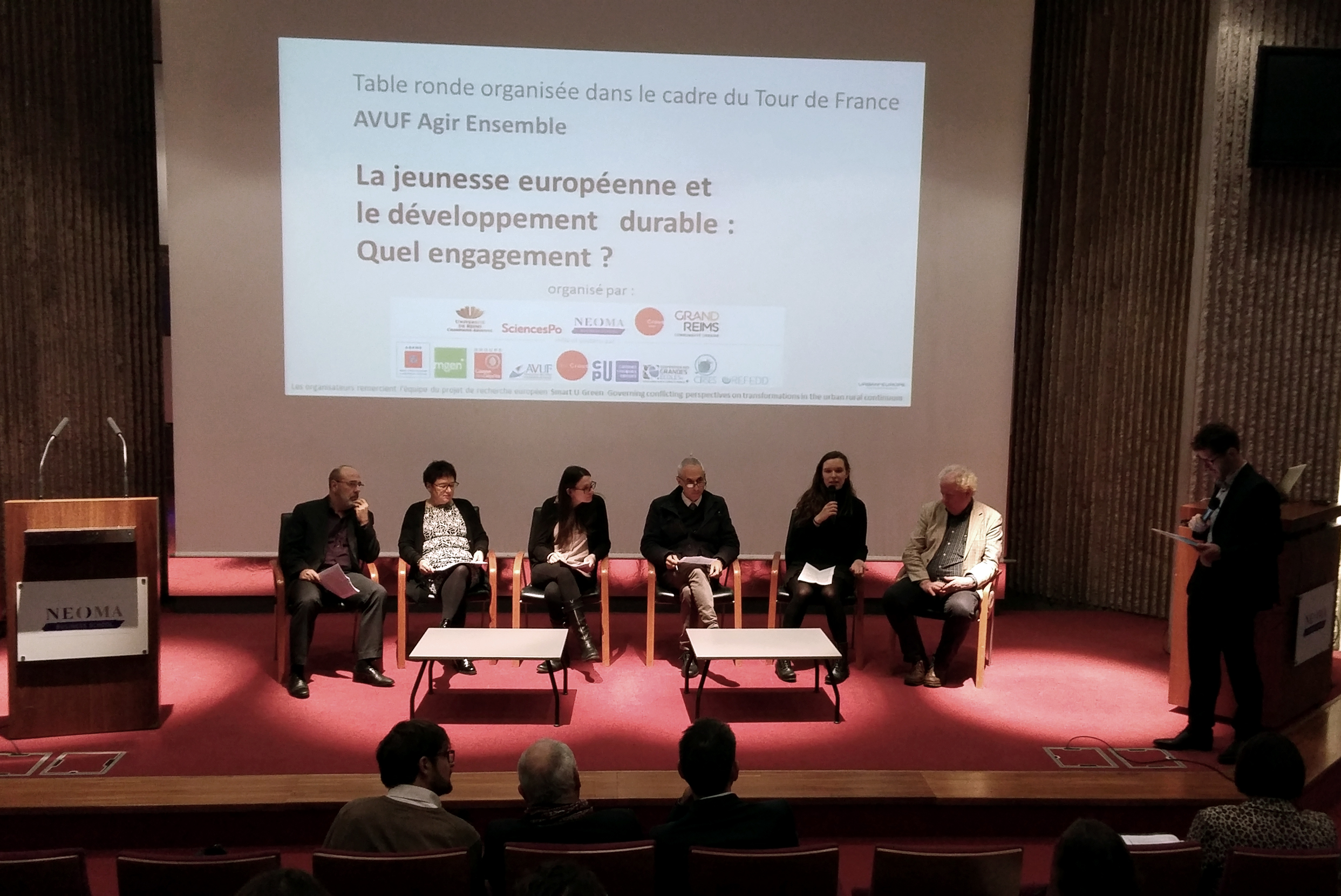 Okrugli stol „EUROPEAN YOUTH AND THE SUSTAINABLE DEVELOPMENT: IS CONFLICT INEVITABLE?“ na temu sudjelovanja europske mladeži u održivom razvoju održan je 30. listopada 2017. u Reimsu u Francuskoj. Sudionici i organizatori su članovi i suradnici na europskom projektu Smart-U-Green iz: Hrvatske (Zagreb, Bojana Bojanić Obad Šćitaroci), Italije (Camerino, Massimo Sargolini i Ilenia Pierantoni), Nizozemske (Rotterdam, Matthijs Hisschemoller i Ilonka Marselis) i Francuske (Reims, François Mancebo). Pitanja, o kojima se diskutiralo na okruglom stolu, bila su vezana uz: