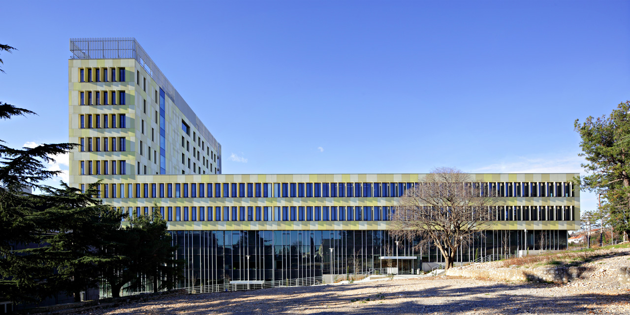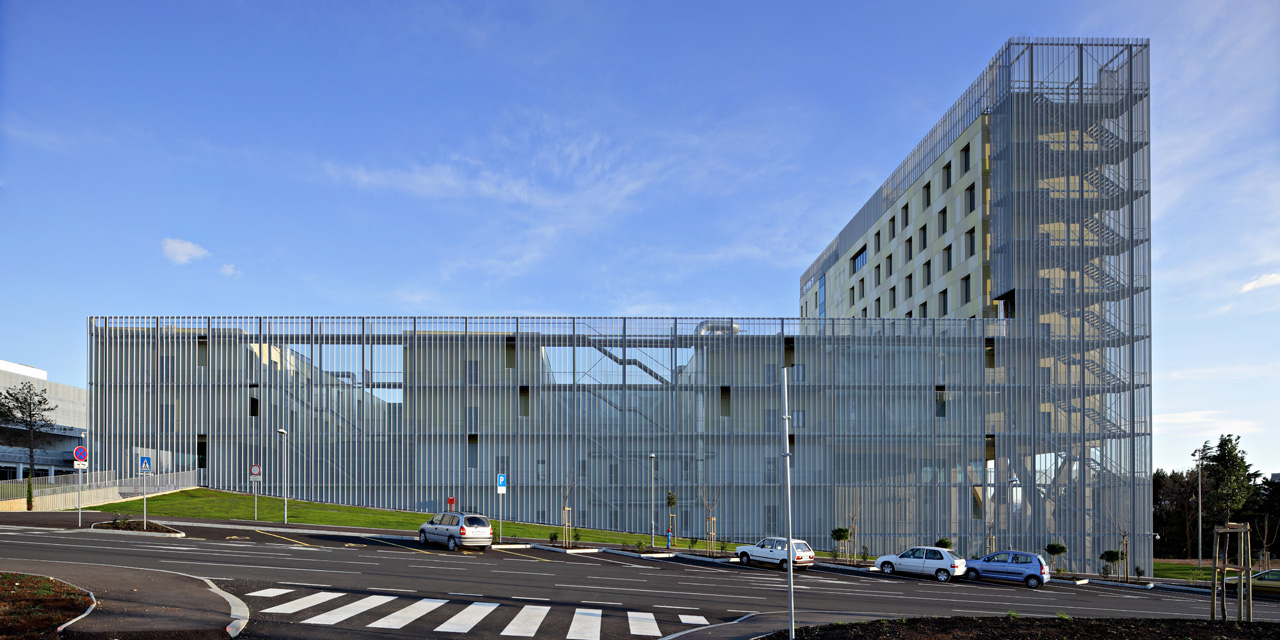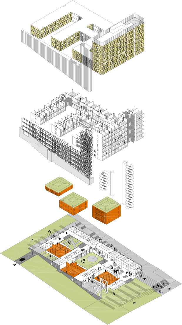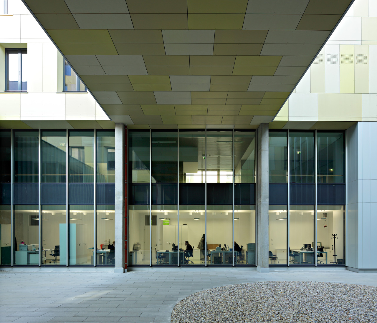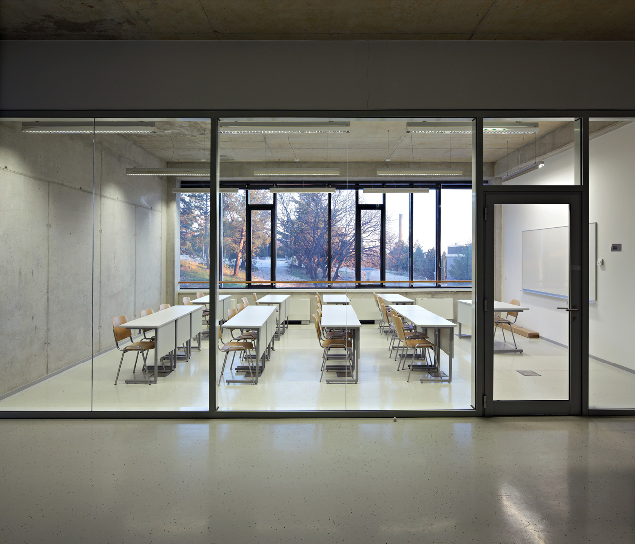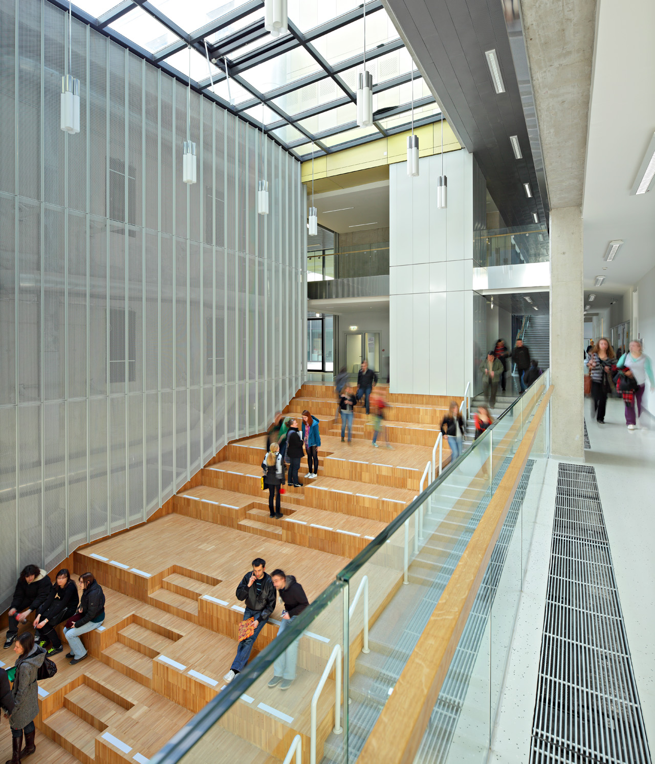 Unutar kompaktnog volumena nastaje niz karakterističnih javnih i intimnih mjesta: transparentni predprostori predavaonica uz zasjenjena dvorišta i introvertirani traktovi pojedinih odsjeka uz brežuljkaste ozelenjene krovove. Lebdeće zajedničke prostorije odsjeka - mostovi ujedno i povezuju različite dijelove fakulteta. Prozračne terase galerije služe kao alternativna komunikacija po lijepom vremenu i prostor odmora na otvorenom.