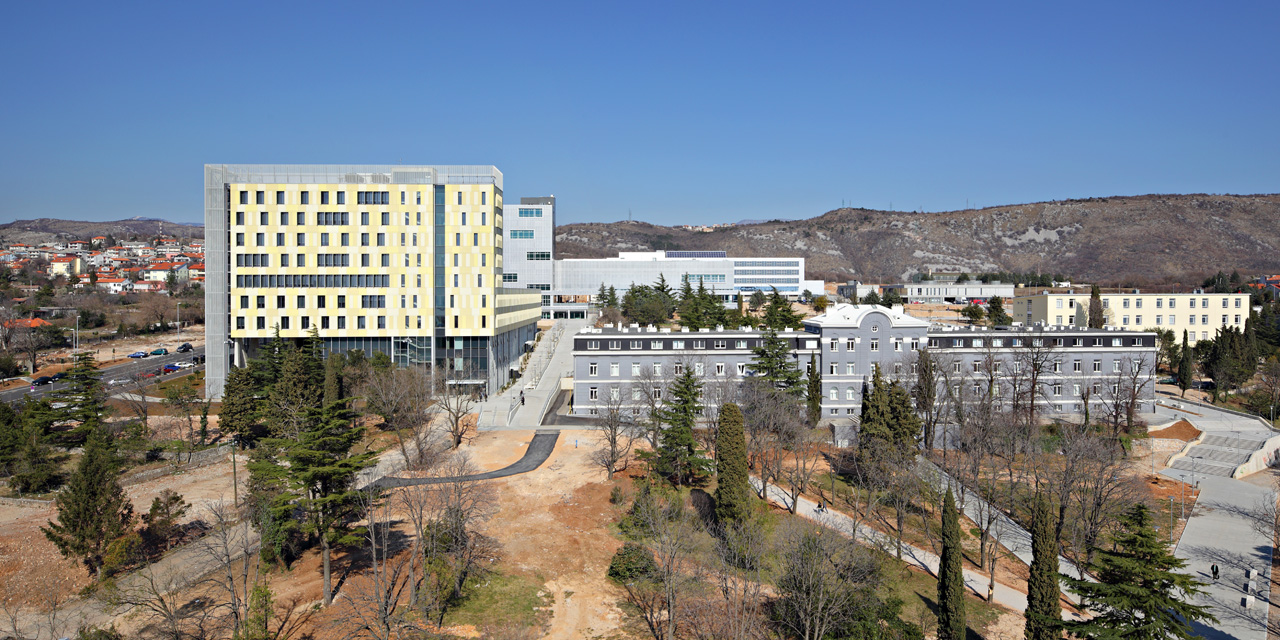 Prostorna i funkcionalna struktura čita se i kroz materijalizaciju: donji dio je transparentan i ekstrovertiran u aluminijskoj ostakljenoj fasadi, s umetnutim grupama predavaonica kao volumenima presvučenim perforiranim limovima. Gornji dio zgrade je introvertiran, obložen eternitnim pločama blagih promjena u nijansi žutog kolorita i ozelenjenim kupolastim krovovima predavaonica ispod. Otvorenu galeriju čini tekstura rešetkastih gazišta i perforirane opne neutralnog kolorita.