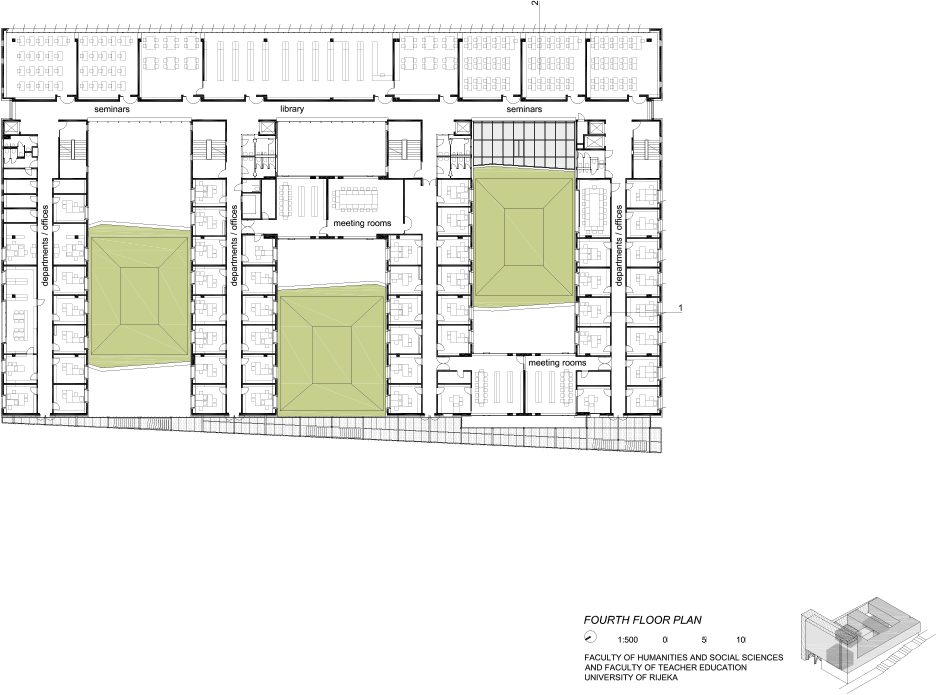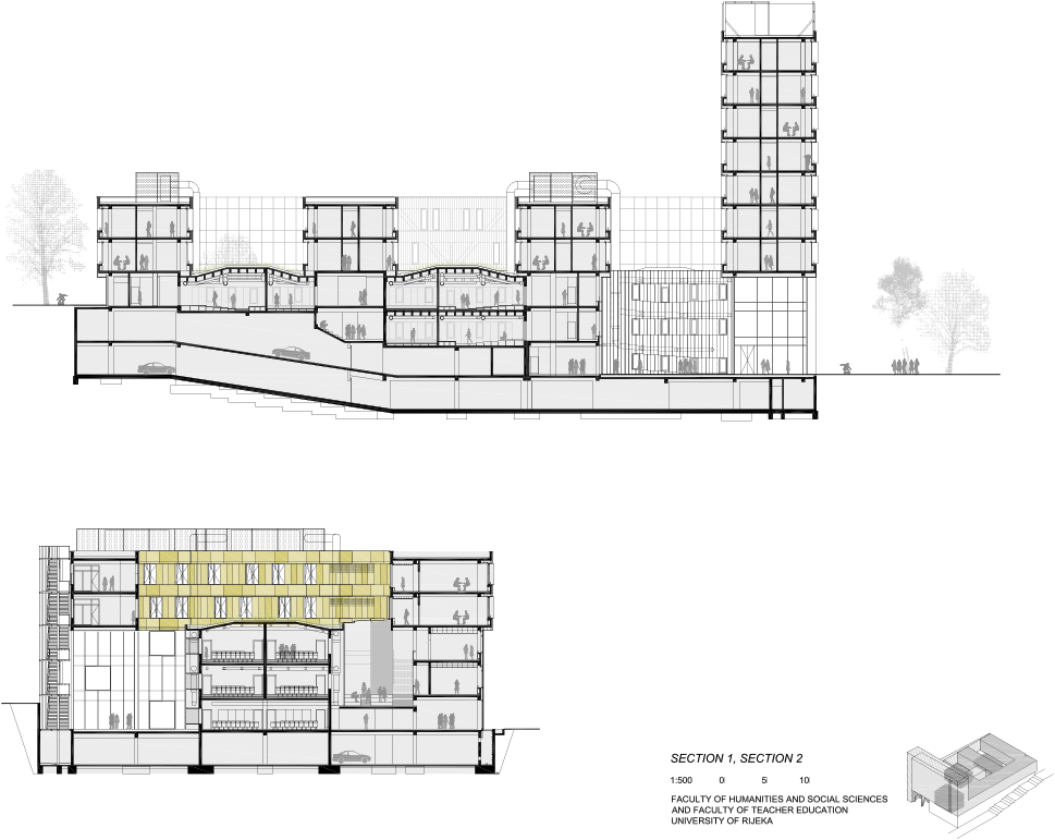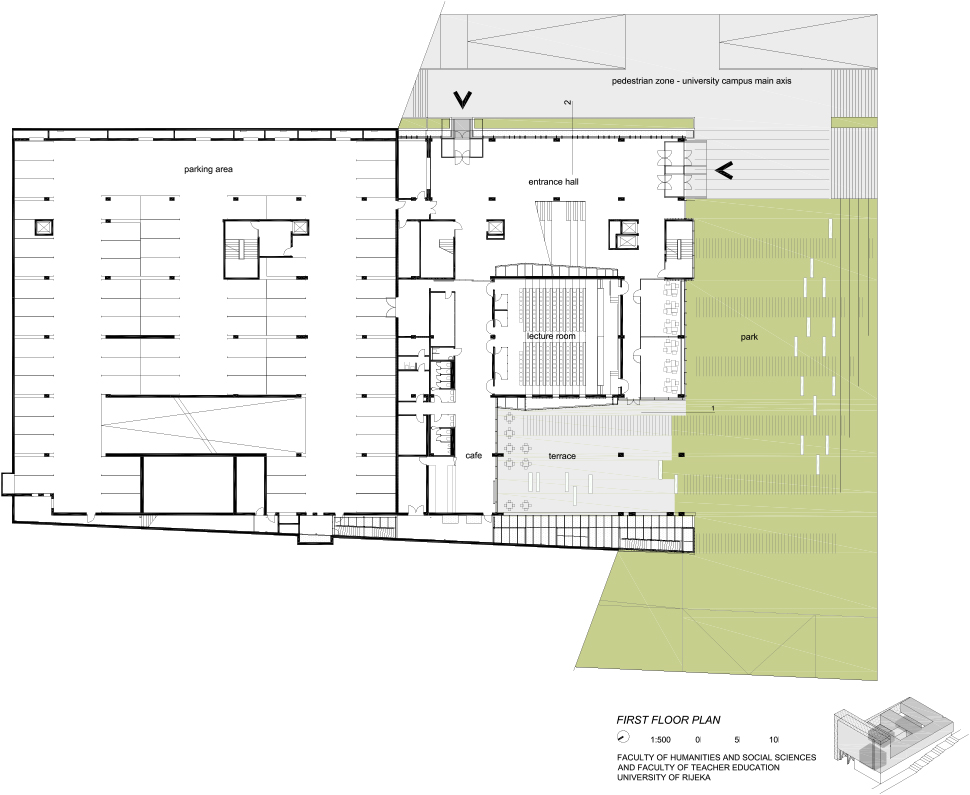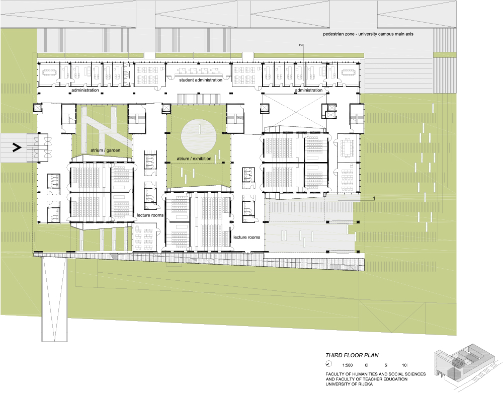 Oblikovana je struktura zgrade koja artikulira vitalno ispreplitanje brojnih aktivnosti i korisnika. Ona se čita kroz presjek i tlocrt, te omogućuje prostornu preglednost, efikasnu komunikaciju i fleksibilnost. Donji dio zgrade s unutarnjom ulicom, kroz presjek okuplja javne prostore: predavaonice, knjižnicu, aulu i otvorene atrije. Gornji dio zgrade sadrži mirne radne prostore: kabinete, seminare, te zelene krovove predavaonica. Također, tlocrtno su oblikovane tri zone od istoka prema zapadu: prostori seminara i uprave uz unutarnju ulicu, prostori odsjeka i predavaonica, te prostori otvorene galerije –evakuacijskog puta.
