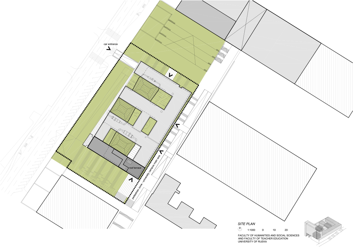 Neposredni kontekst zgrade Filozofskog fakulteta i Učiteljskog fakulteta formiran je urbanističkim planom novog kampusa Sveučilišta u Rijeci na mjestu bivše vojarne na Trsatu. Program fakulteta je kompleksan: dvije institucije s desetak studijskih programa i isto toliko odsjeka i pratećim prostorima.