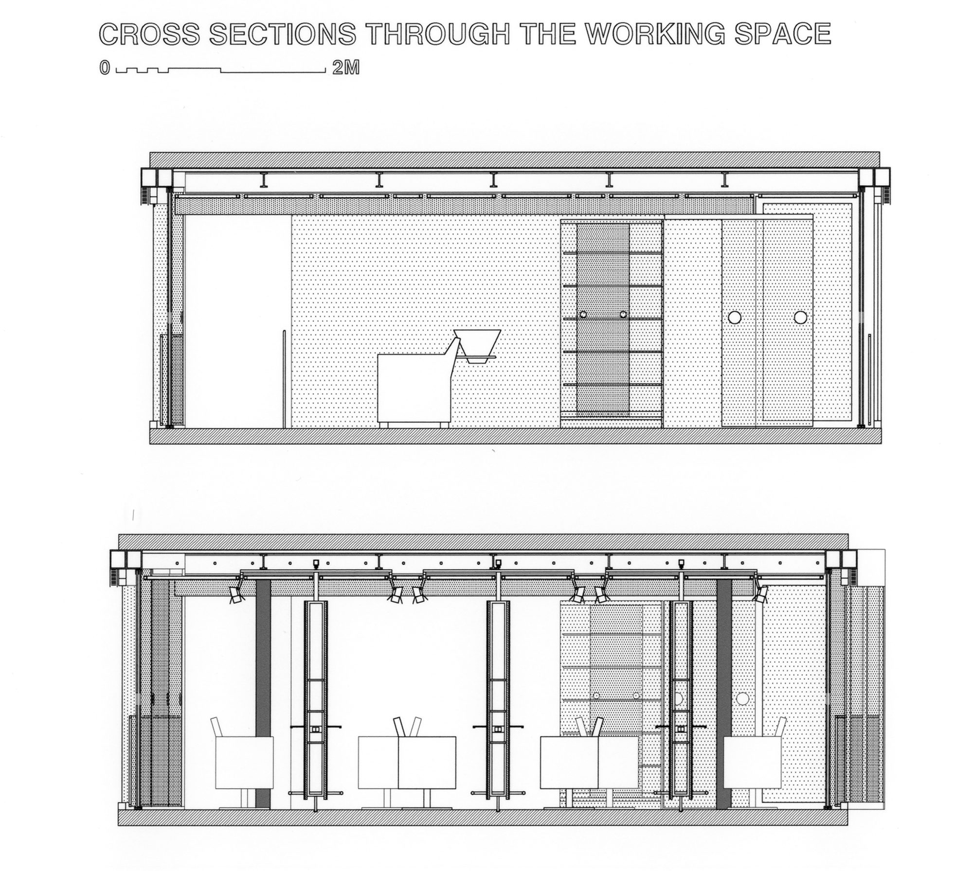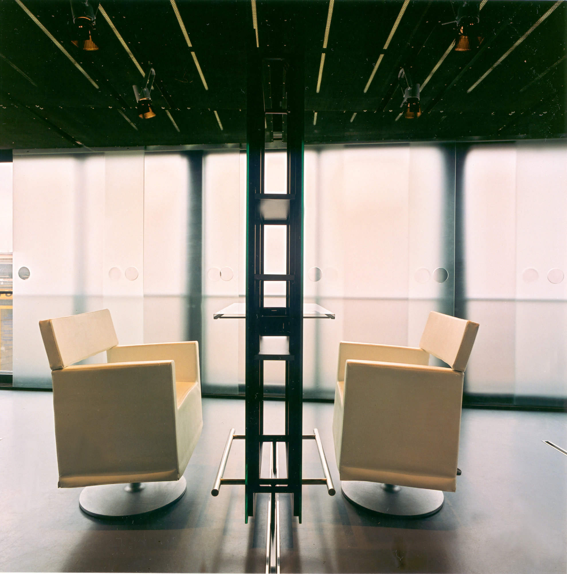 Naizgled je očito da se klizanje pojavilo kao motiv iz potrebe, iz nužnosti vrlo malog prostora. (Trebalo je smjestiti šest radnih mjesta u prostor omeđen s čak tri staklena zida.) No, kao i kod svakog dobrog rada, svrsishodna rješenja vrlo brzo nadrastu sama sebe.