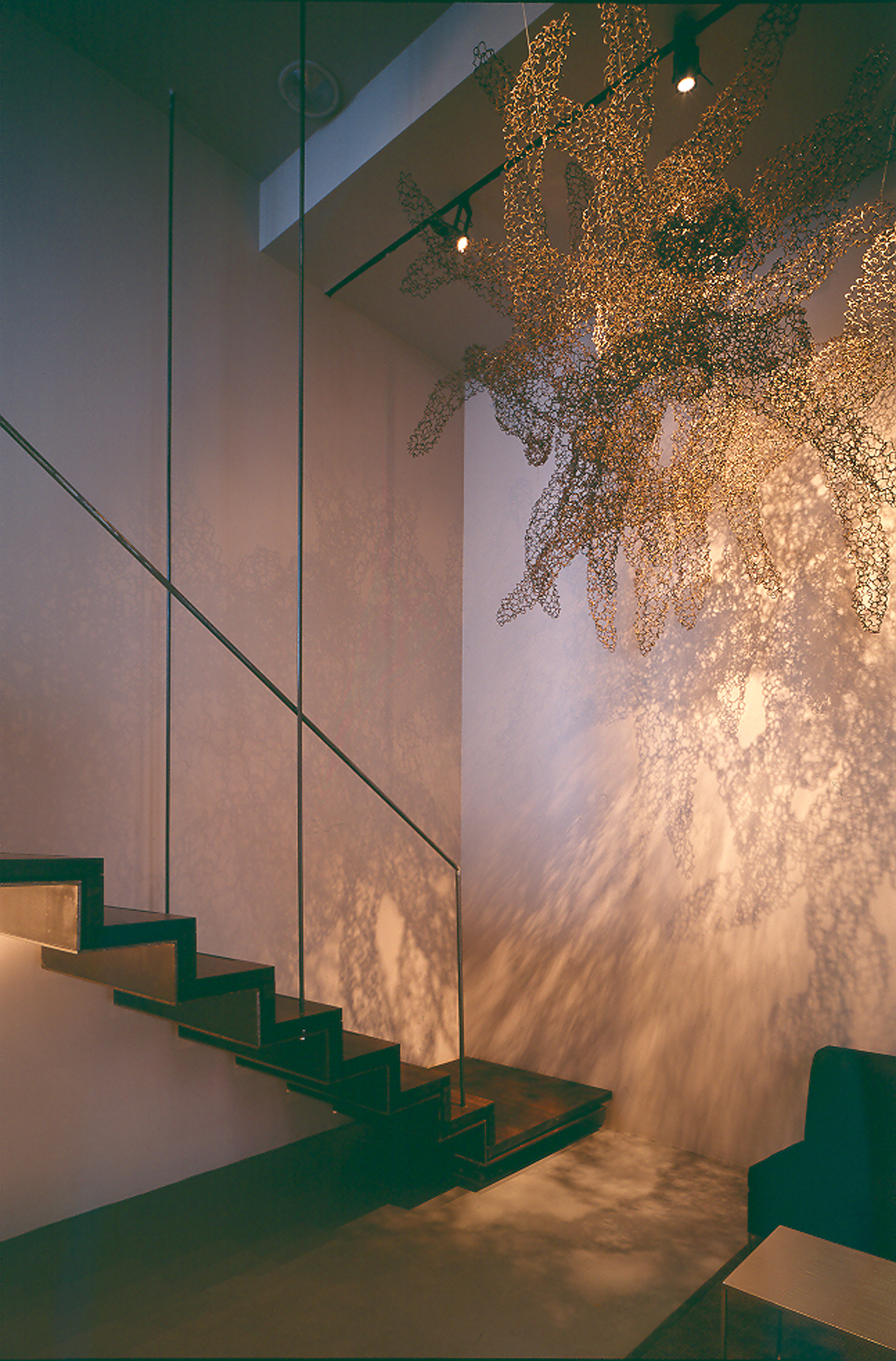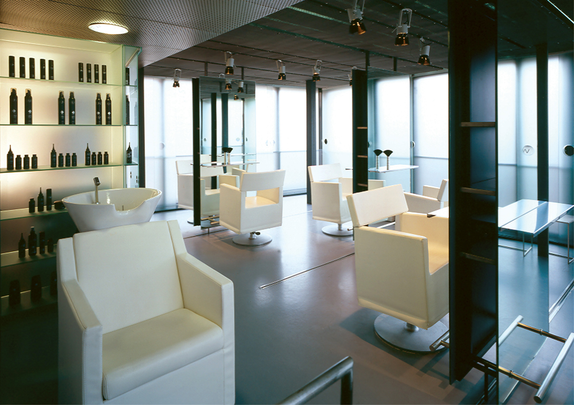 Gornja etaža prostora frizerskog salona je niska – dotiče propisani minimum od 250 centimetara. Da bi prostoru povećali prozračnost i dodali utisak visine, zamijenili su uobičajene spuštene stropove tkanim (i naravno providnim) stropom od žičanog pletiva. Konstruirali su tri dvostruka (3 x 2) radna mjesta, ovješena o šine na stropu, koja klizanjem mogu promijeniti mjesto - dakle i preoblikovati interijer frizerskog salona. Rulanjem radnih mjesta pomiču se ogledala skupa s pripadajućim reflektorima, i otvaraju se novi slojevi prostora.