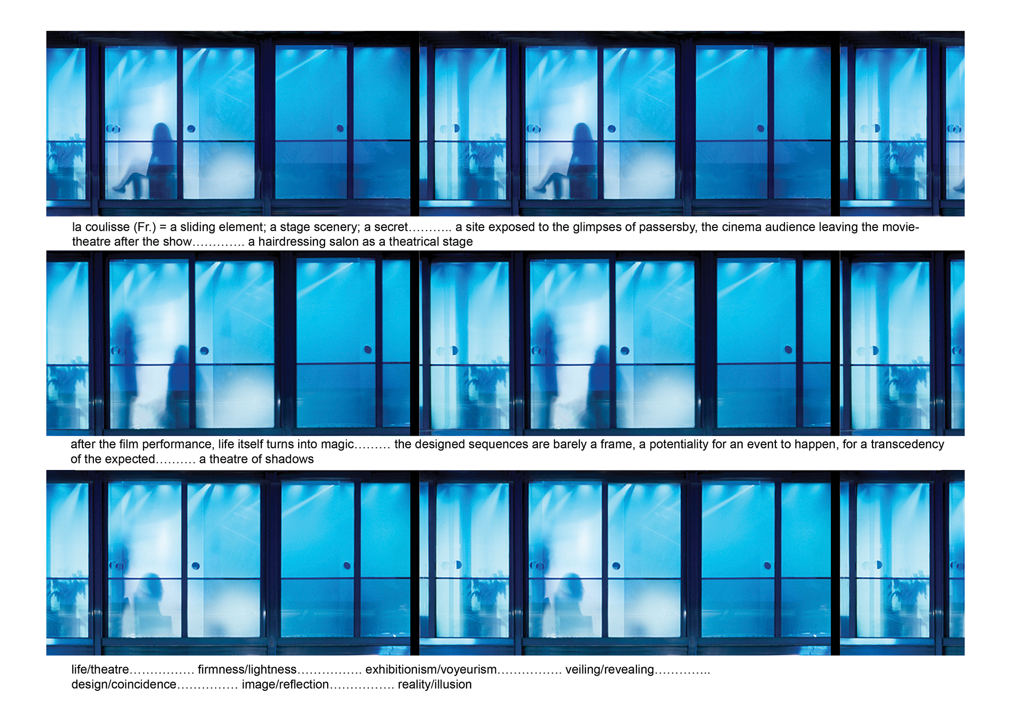 Riječ kulisa potiče ne od zakrivanja istine, već od pokretljivosti i mogućnosti sklizanja po sceni. Zato u našem frizerskom salonu Bernfest i Prpić postavljaju - osim klizećih elemenata u centru prostora - i klizne stijene od posebne vrste pjeskarenog stakla na njegovoj opni.