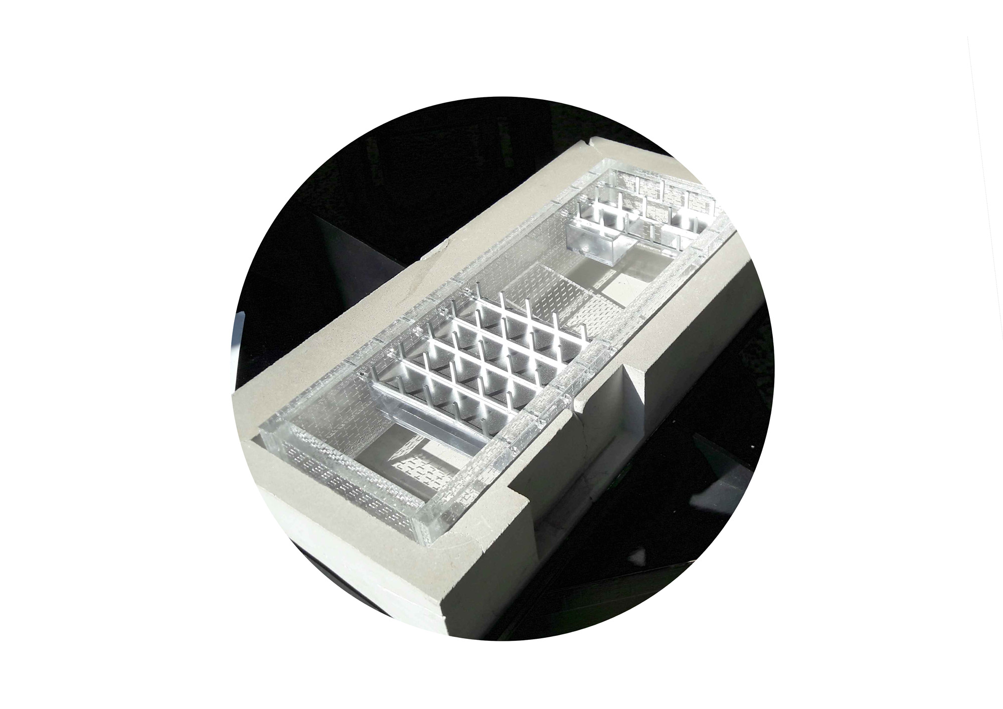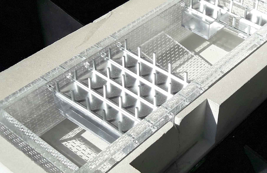 „Brana“ okružuje centralni vanjski prostor koji stvara novu „umjetnu“ prirodu potonulu u tom čvrstom volumenu.