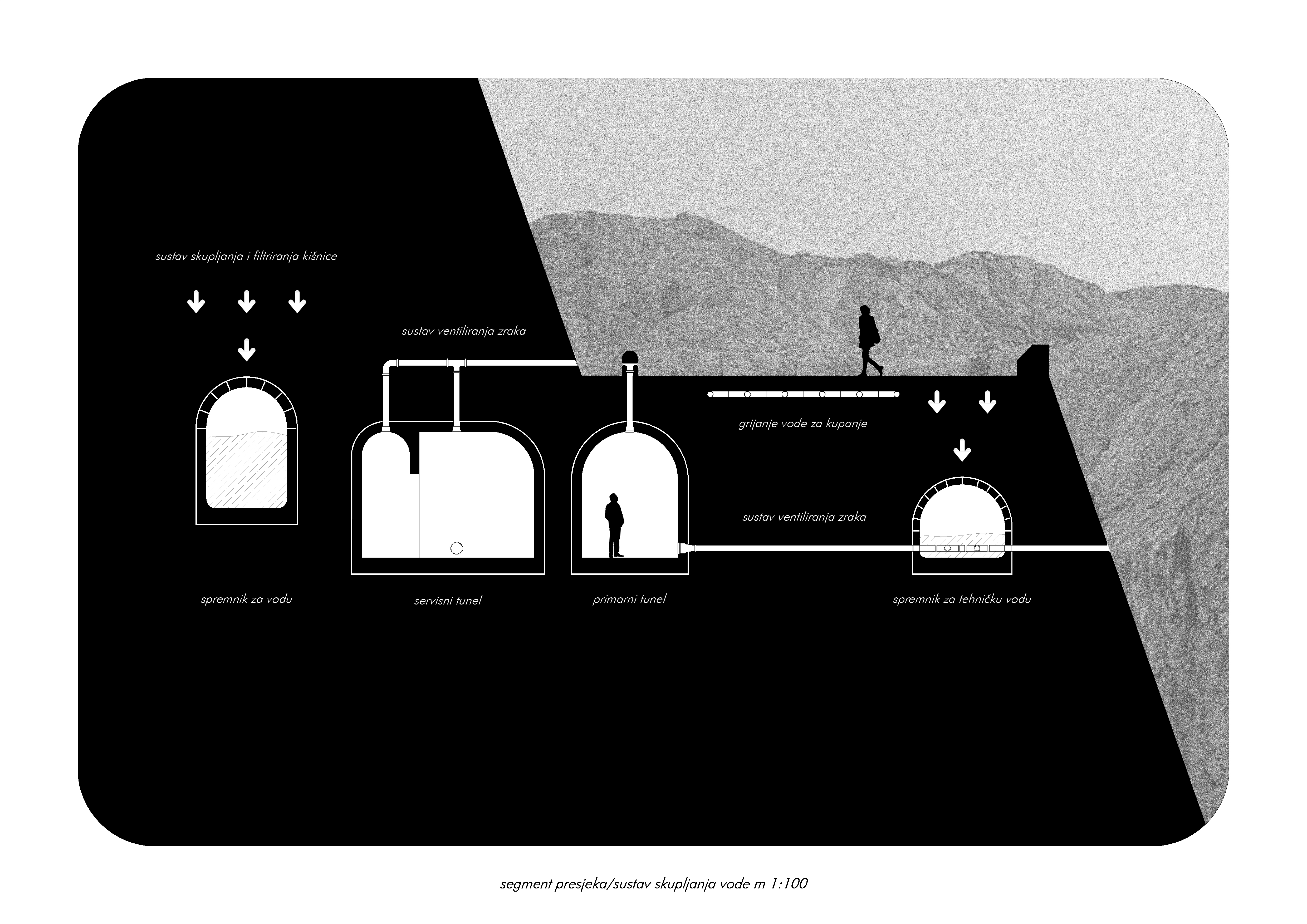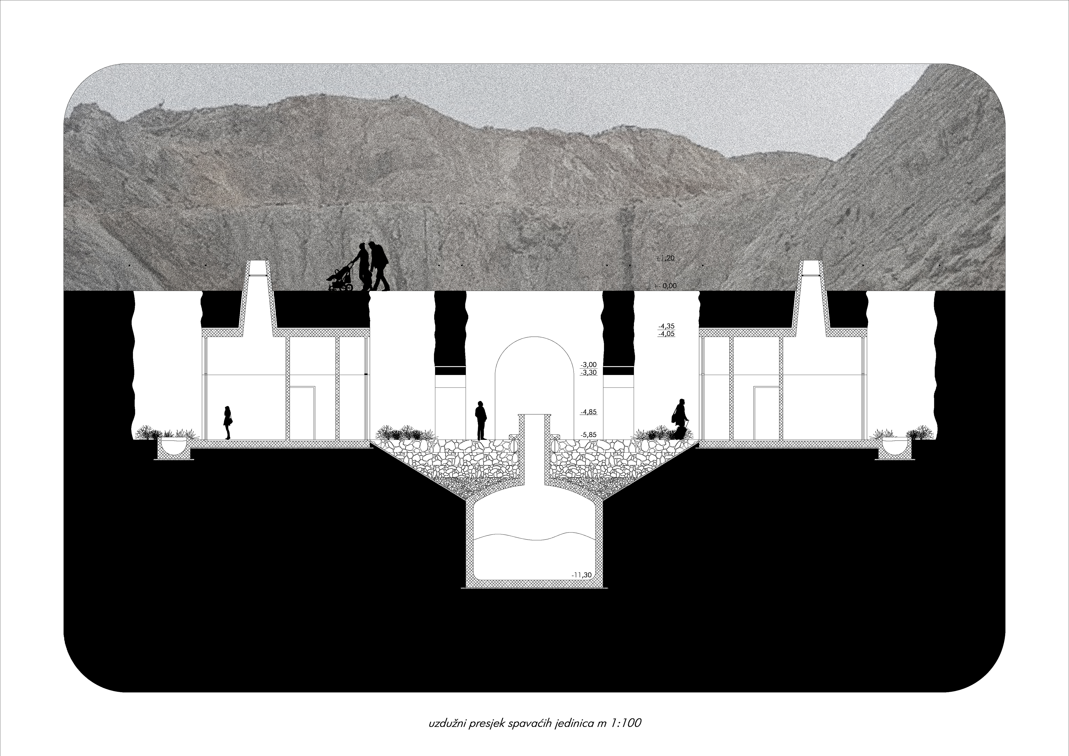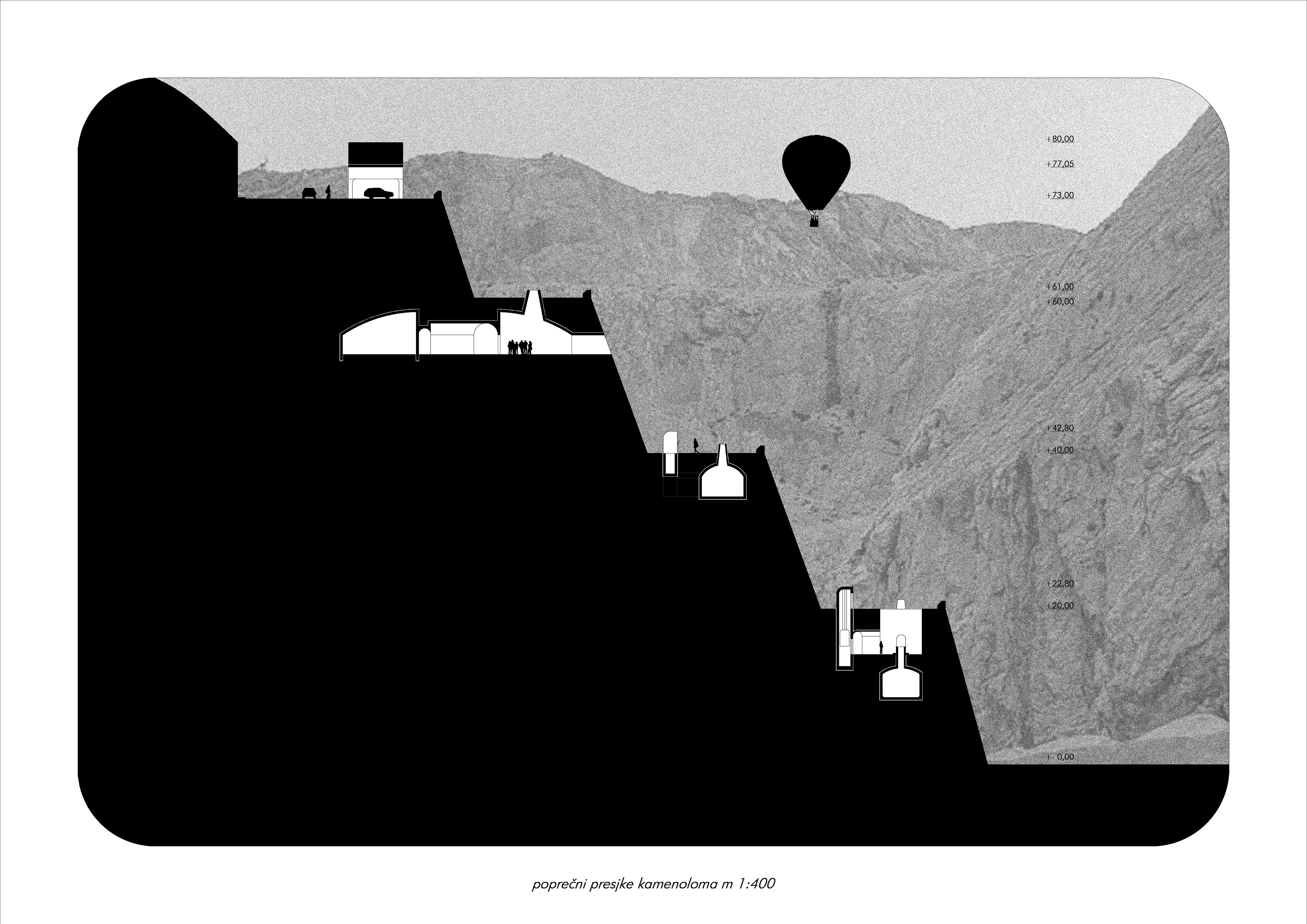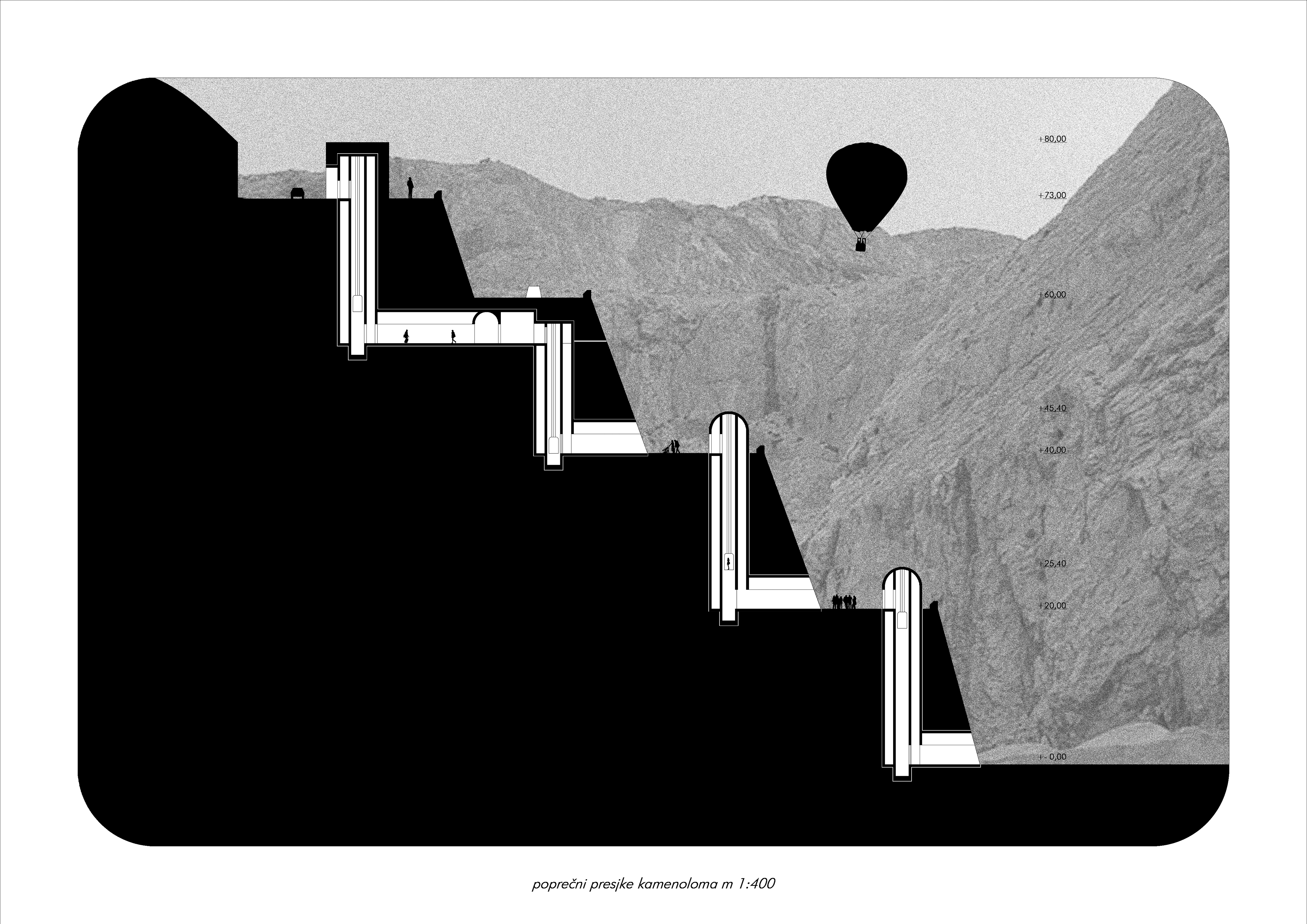 Lokacija hotela nalazi se u kamenolomu Dubac u neposrednoj blizini Dubrovnika. Višegodišnjim iskopom kamenolom je dobio određenu dozu skulpturalnosti. Osnovna misao projekta bila je napraviti arhitekturu koja nenametljivo djeluje na postojeći kontekst, te zadržava ambijent koji je zatečen na lokaciji. Ideja je bila da se kretanjem kroz hotel stvaraju posebni prostorni osjećaji, pa se tako u određenim situacijama sagledava cjelina kamenoloma i čita njegova veličina, a u određenim trenutcima stvara se osjećaj potpune izoliranosti od okoline. Nova građevina projektirana je kao samoodrživi sustav podzemnih tunela koji se kaskadno spuštaju od vrha prema dnu. Prilikom dolaska na vrh kamenoloma odnosno hotela sagledava se kamenolom i stvara se osjećaj impozantnosti. Nakon toga se ulazi u komunikacijske jezgre kroz koje se spušta do servisno uslužne etaže koja je u potpunosti ukopana, a jedini doticaj sa okolinom su otvori u prostorima ugostiteljskih sadržaja iz kojih se pruža pogled na more i kamenolom. Zbog veličine hotelskog kompleksa ugostiteljski sadržaji nisu pozicionirani na jednom mjestu nego su točkasto raspoređeni duž čitavog kompleksa. Servisno-uslužna etaža sastoji se od dva tunela, primarnog uz koji su smješteni svi sadržaji koji su potrebni gostima i servisnoga tunela koji se nalazi u stražnjem planu uz kojeg su smješteni svi sadržaji koji su neophodni za funkcioniranje hotela. Iz servisno uslužne etaže dalje se kroz jezgre spušta na sljedeću etažu. Nakon spuštanja izlazi se na platno kaskade gdje se sagledava kamenolom, te se dalje spušta u mikro svijet soba koje su u tlocrtu točkasto pozicionirane. Sobe su projektirane kao manji kompleksi u čijem se središtu nalazi mali trg sa cisternom u koju se skuplja kišnica, a uz pomoć prirodnog sustava ventilacije stvara se posebna mikro klima. Hotel koristi tradicionalne elemente prikupljanja vode koja se filtrira kroz kamen, a ventilacija zraka projektirana je na prirodan način uz pomoć sustava cijevi u kojima se zrak hladi odnosno grije prilikom prolaska cijevi kroz spremnike za tehničku vodu.