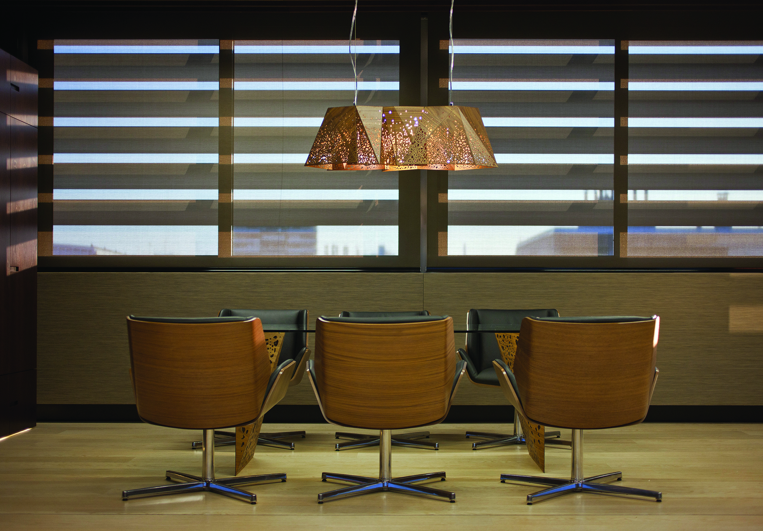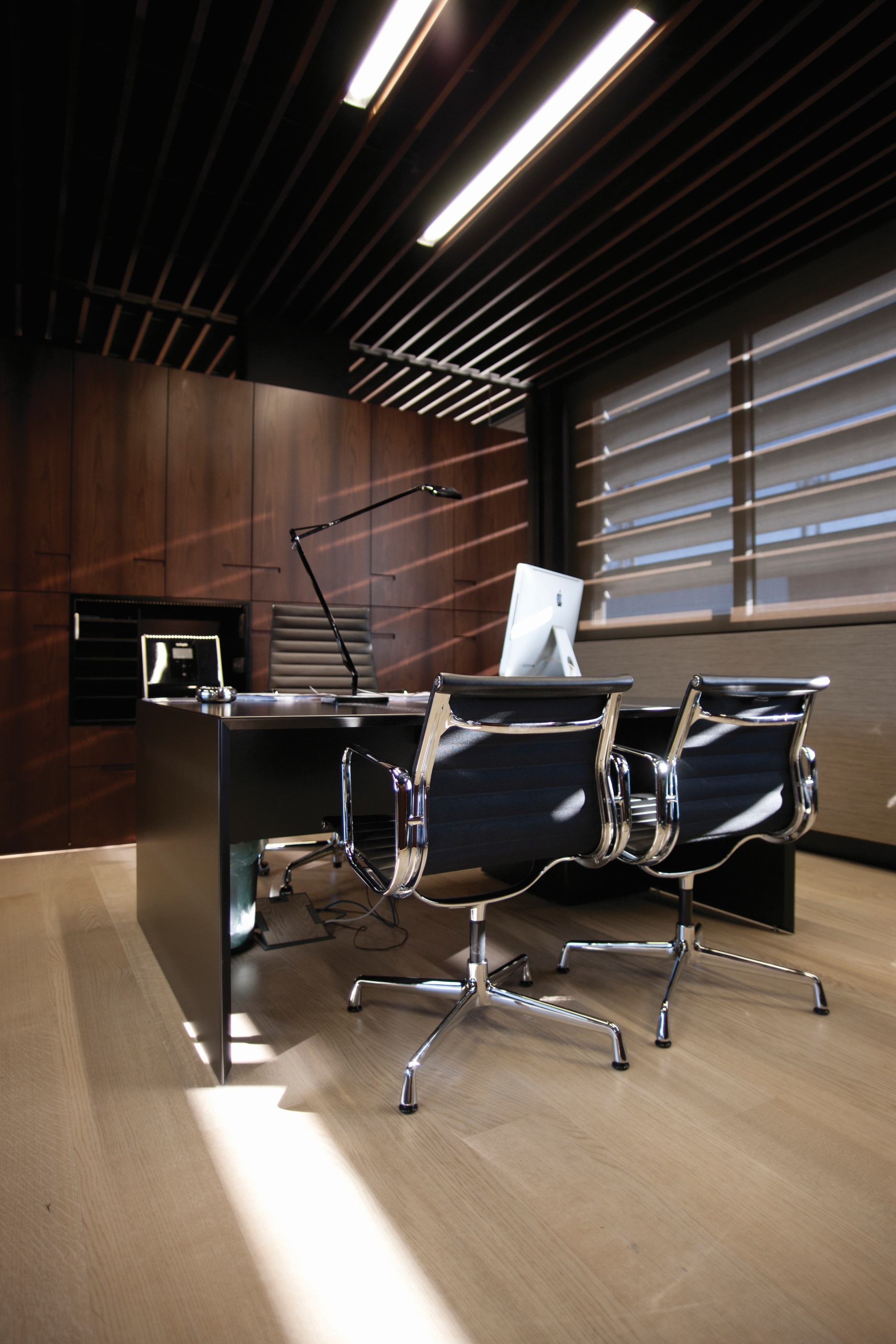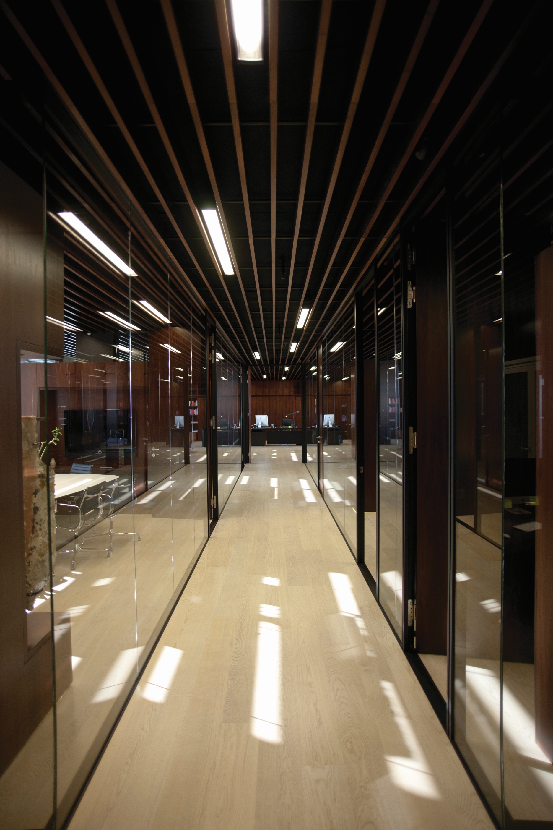 Izmedu stropnih lamela ‘skriveni’ su sprinkleri, lampe, zvučnici i ventilacija, a između njih prolaze staklene pregrade. Svi ormari izrađeni su po mjeri, sadrže otvorene police za pisače, telefone i slično, te se u njima nalaze upravljački paneli za svjetlo, zaštitu od sunca, zaštitu od pogleda i audiosustav. Na radnim stolovima tako ostaju samo računala i hrpe papira.