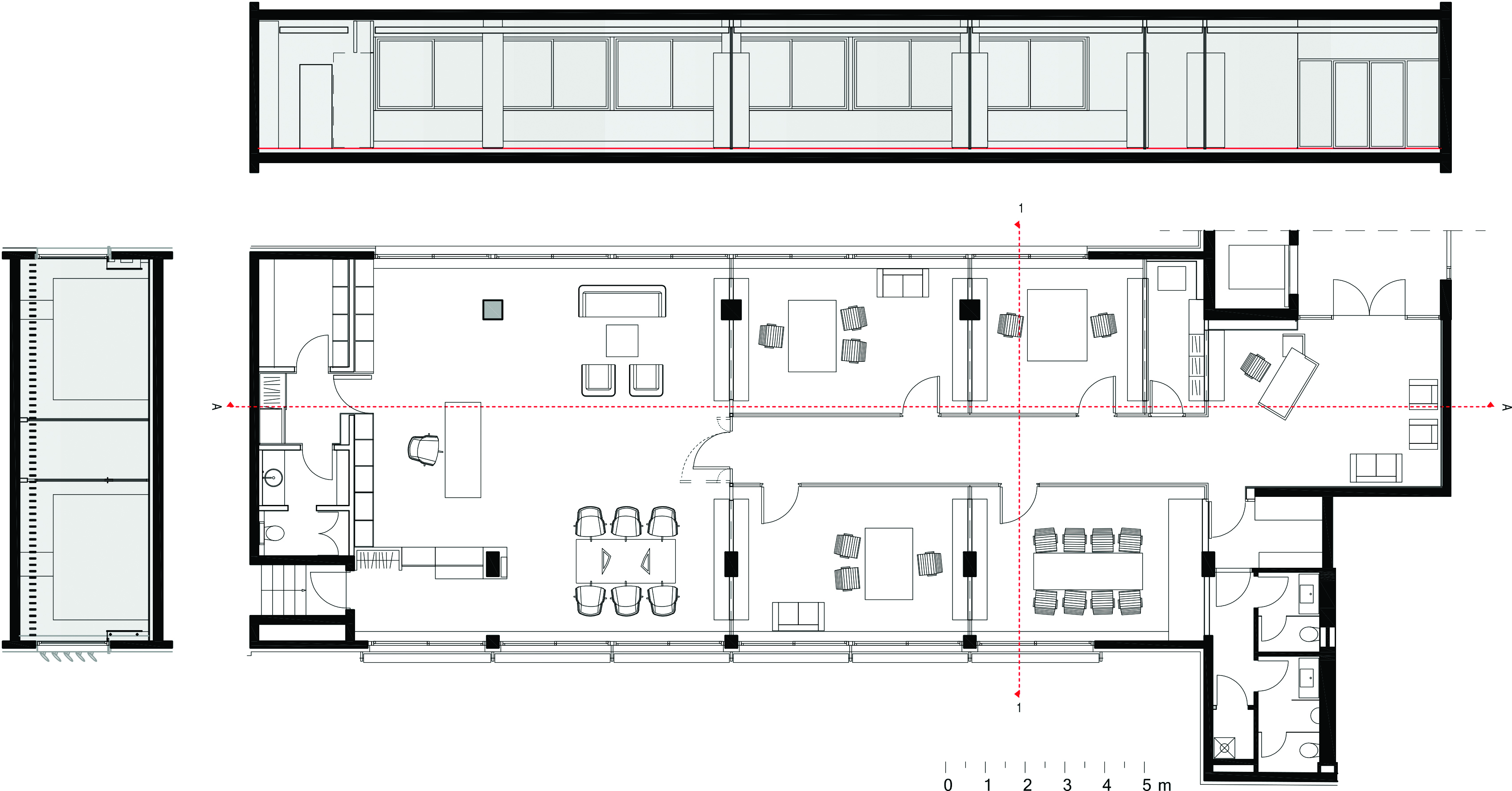 Buduća namjena prostora predviđala je da se u njega smjesti odvjetnički ured i bilo je važno da se unutarnjim uređenjem kod budućih klijenata postigne osjećaj stabilnosti tvrtke te povjerenja i sigurnosti. Prostorne potrebe odvjetničkog ureda bile su: četiri ureda, soba za sastanke i arhiv. Jedan od ureda morao je biti dovoljno prostran za sastanke većeg broja ljudi. Prostor pravokutnog tlocrta s duljim fasadnim zidovima i površine 270 m2 sadržavao je ‘samo’ 6 stupova i obodne zidove. Takav slobodan prostor pokušalo se zadržati. Dani prostor nametnuo je rješenje središnjeg hodnika s radnim prostorima s lijeve i desne strane, uz prozore. Veći ured nalazi se na kraju hodnika i proteže se od fasade do fasade. Način rada odvjetničkog ureda zahtijevao je odvojene urede te ormare za spise uz svaki stol. Zato se na mjestima postojećih stupova nalaze ormari za spise koji dijele radne prostore. Kako bi se zadržao dojam slobodnog prostora, ormari su niži od visine stropa, prostori se dijele staklenim stijenama, a drveni strop kontinuirano prolazi kroz čitav prostor.
