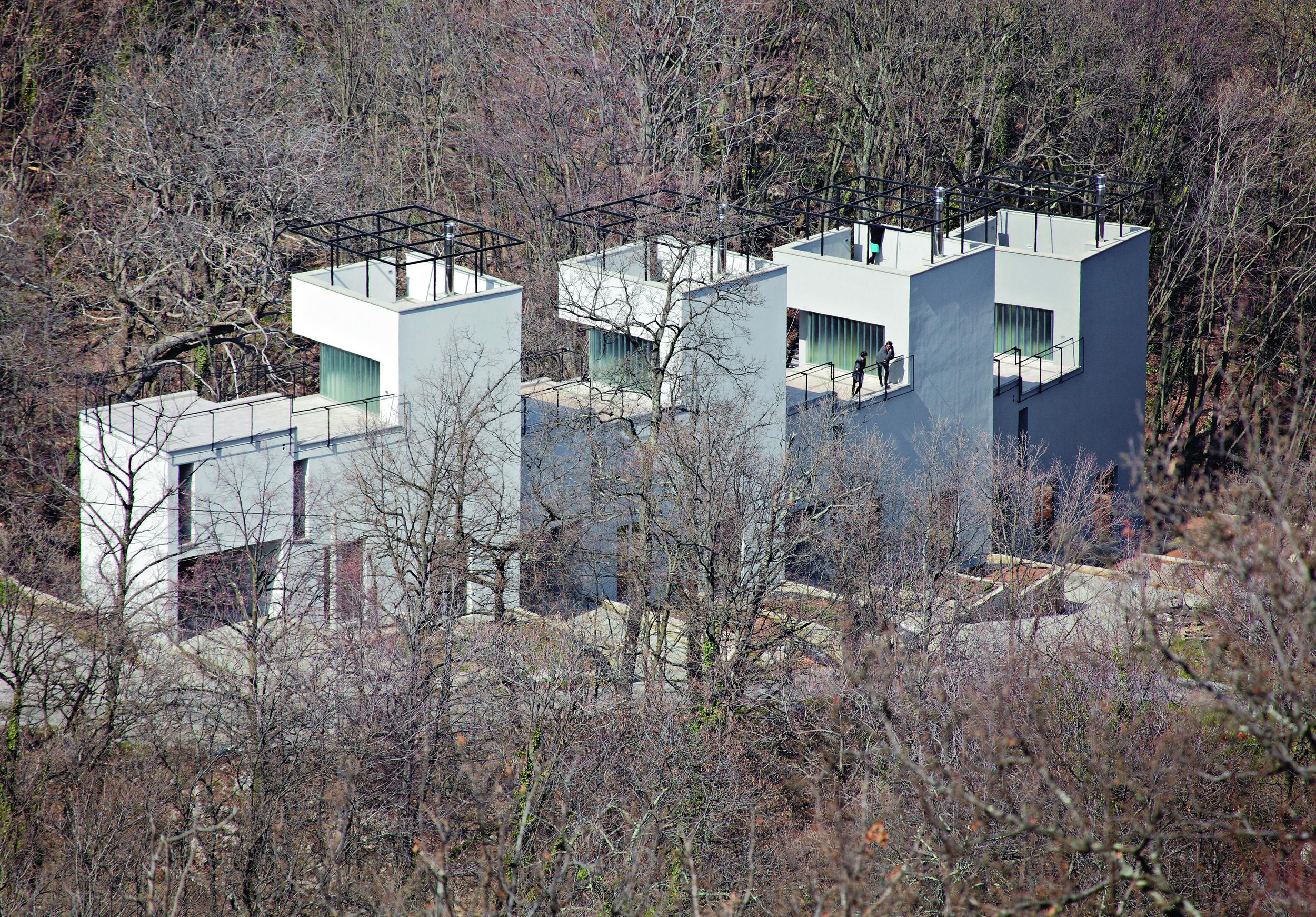 Kuće su projektirane za poznate naručitelje. Inicijalni zahtjev naručitelja bila su dva samostojeća objekta s po dvije stambene jedinice, uz uvjet njihove ravnopravnosti i upotrebu standardnih konstrukcija i materijala. Rješenje uzdužnog nizanja stambenih jedinica hrptom brda predloženo je kako bi što veći dio specifičnog šumskog krajolika, izrazito strmog i stjenovitog, ostao netaknut. Uređuje se tek uzak pojas između ceste i kuća – kolni prilazi i predvrtovi. Nedostatak stražnjih vrtova nadoknađuje se korištenjem krovnih terasa i vidikovaca.