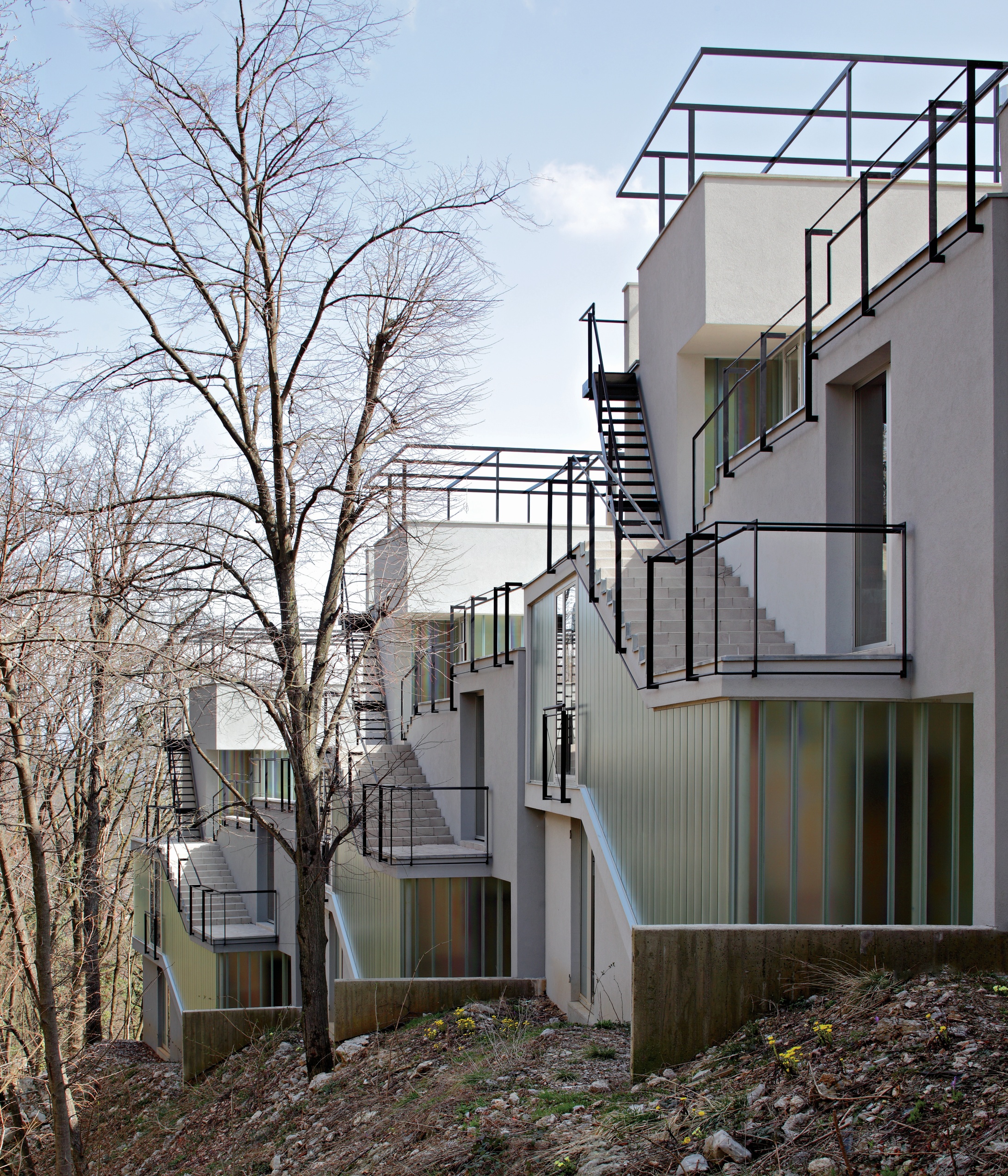 Jedinice su longitudinalna oblika i orijentirane su na jugoistok – prema cesti i na sjeverozapad – prema šumi. Rješenje ne preferira krajnje jedinice niza. Zbog prilagodbe zatečenom terenu primijenjeno je kaskadno rješenje, i na čitav niz i na svaku pojedinačnu stambenu jedinicu. Orijentacija na šumu maksimalno se potencira, bez obzira na nedostatak osunčanja. Boravišne prostorije su dignute na kat zbog pogleda na šumu i dojma ‘boravka u krošnjama’, veze s krovnim terasama te osunčanja odozgo – preko ostakljenog povišenog dijela boravka.