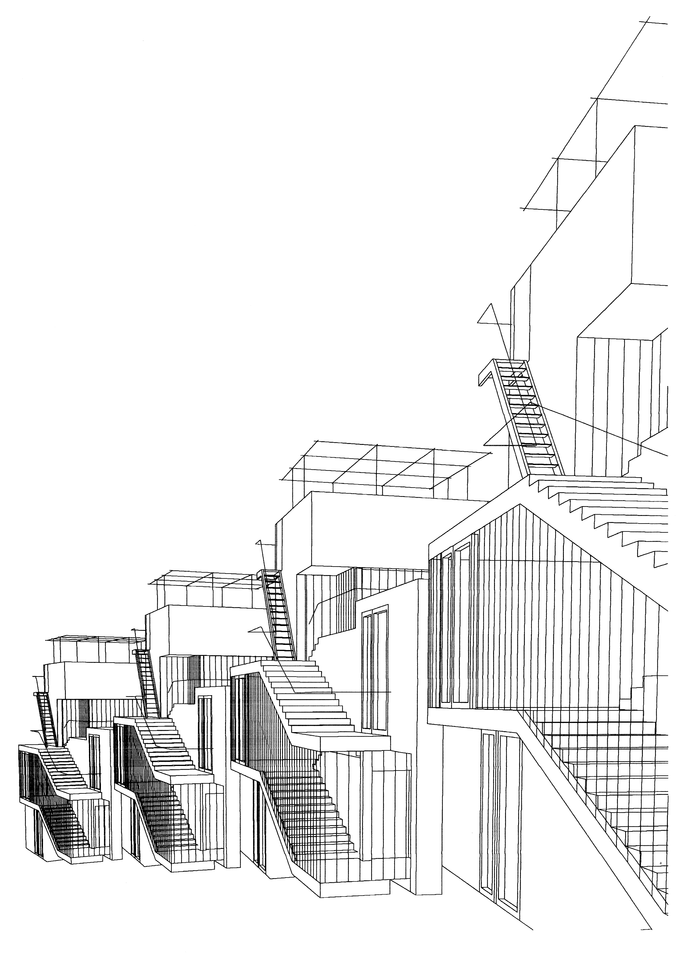 ‘Kuće se kaskadno nižu hrptom brda. Uzdužni presjek ponavlja nagib terena, pročelje pokazuje presjek. Svaka kuća spiralno izrasta iz tla – od konobe do vidikovca, od potpunog mraka do krošanja stabala – sve su domaće aktivnosti usput obuhvaćene. Šuma je izbor, zato je stalno prisutna u kući – ovisno od prirode pojedinačnog prostora: jednom je u naznaci, drugi put u širokoj panorami.’