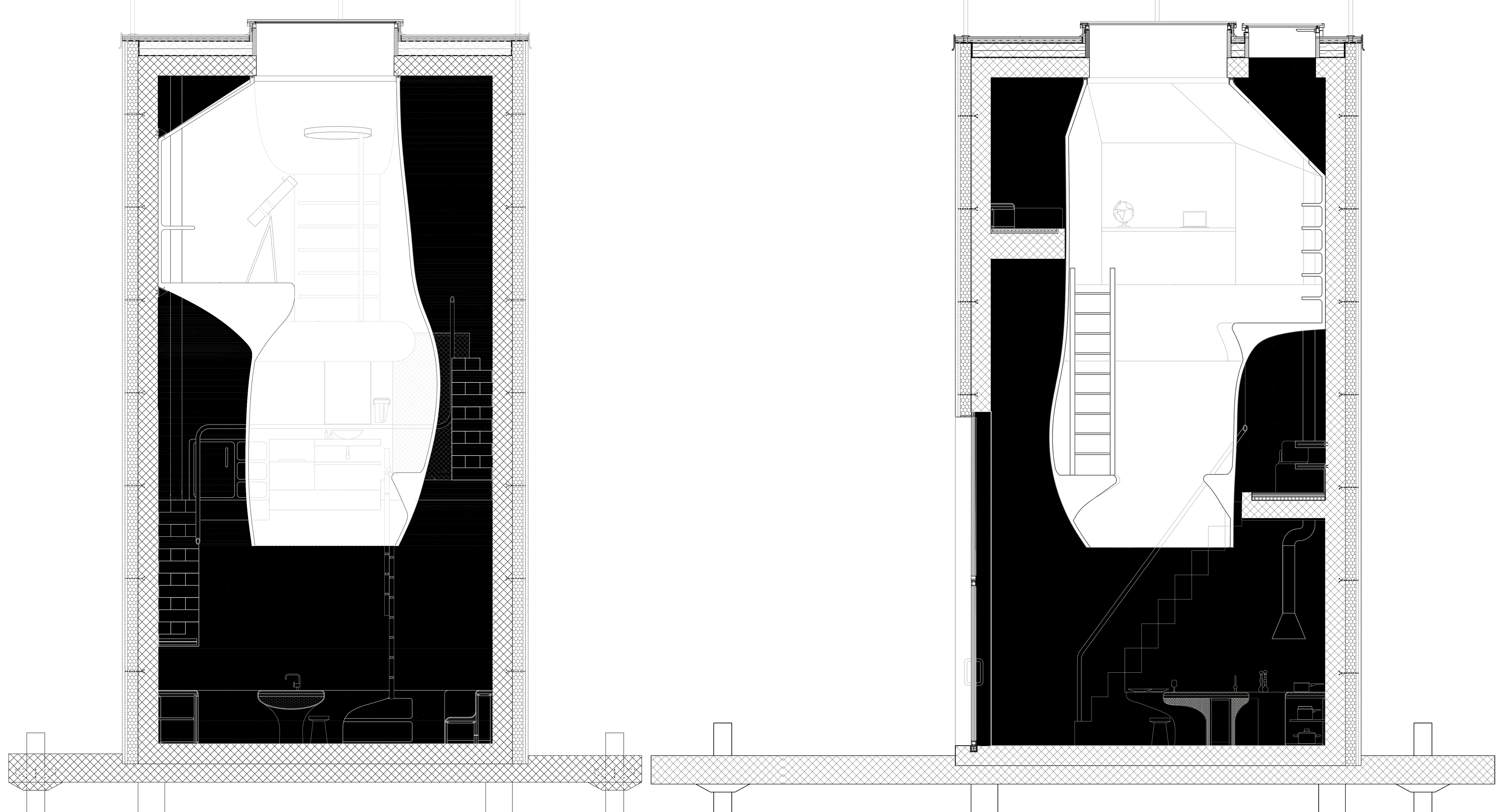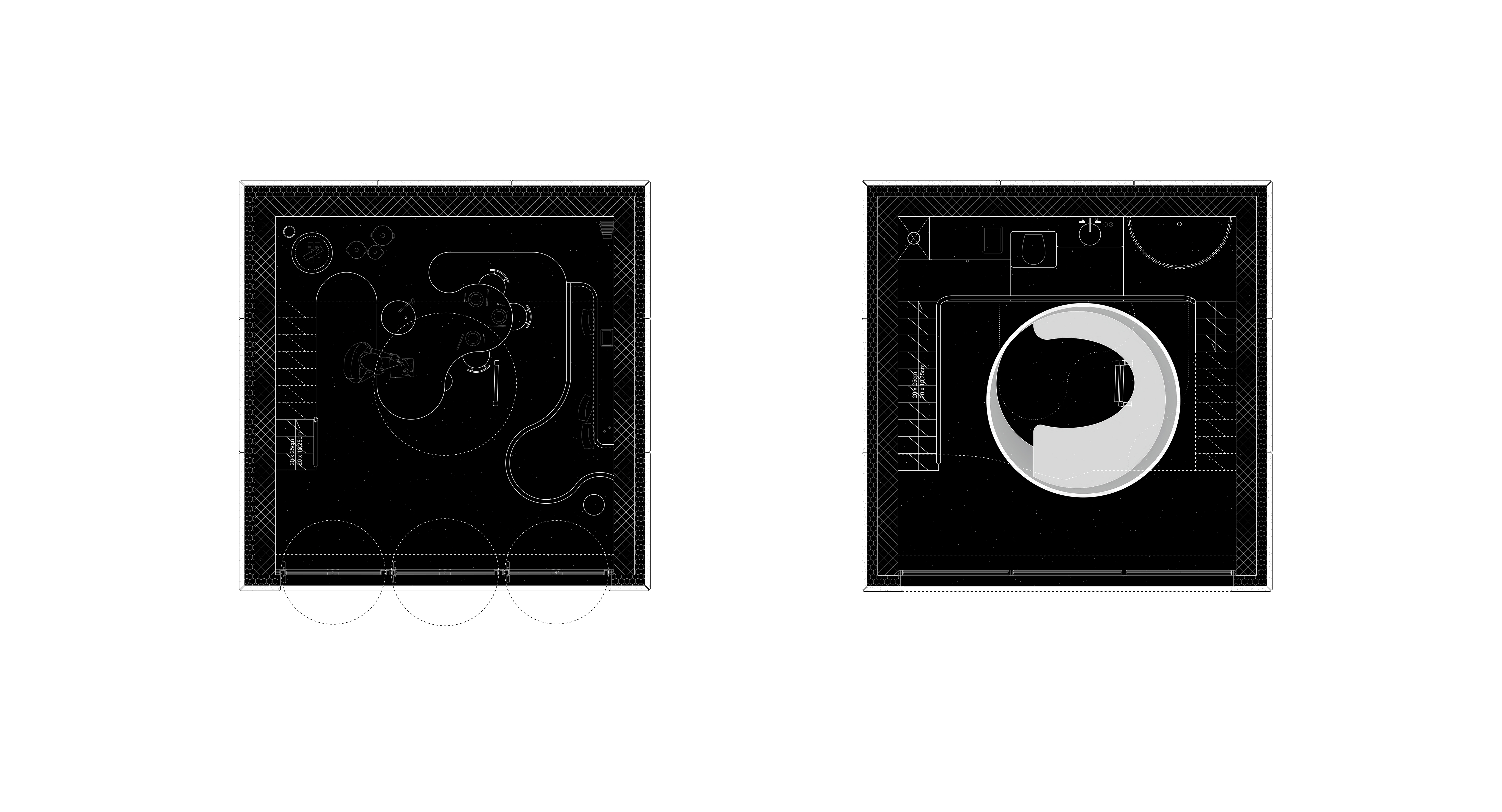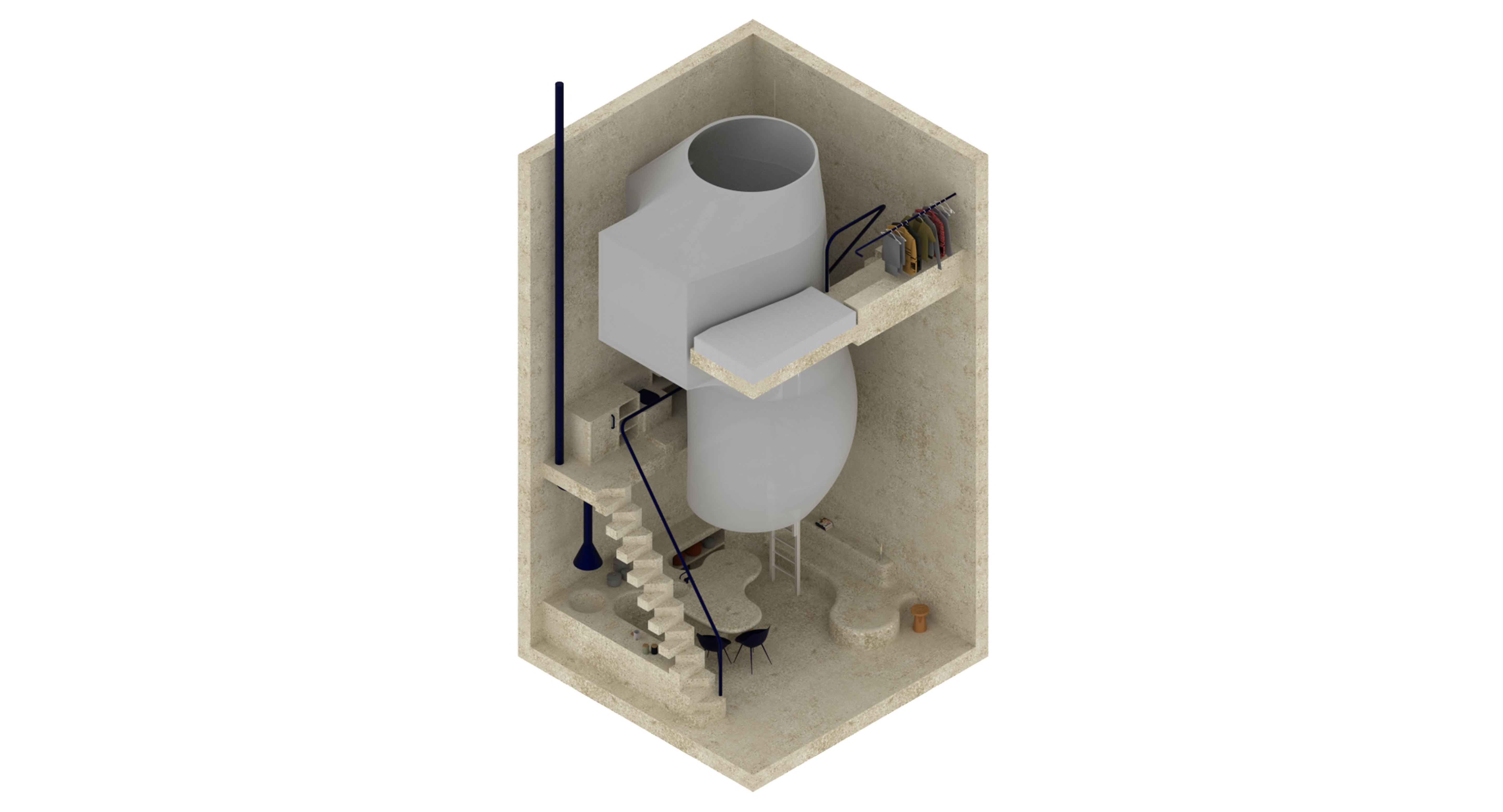 Na donjoj je plohi oblikovana topografija koja tvori elementaran namještaj integriran u jedinstveno tijelo. Svi elementi izvan kukuljice izrastaju iz prizme, organično teku praznim volumenom i stvaraju elemente koje čovjek koristi za stanovanje.
