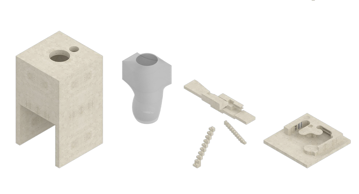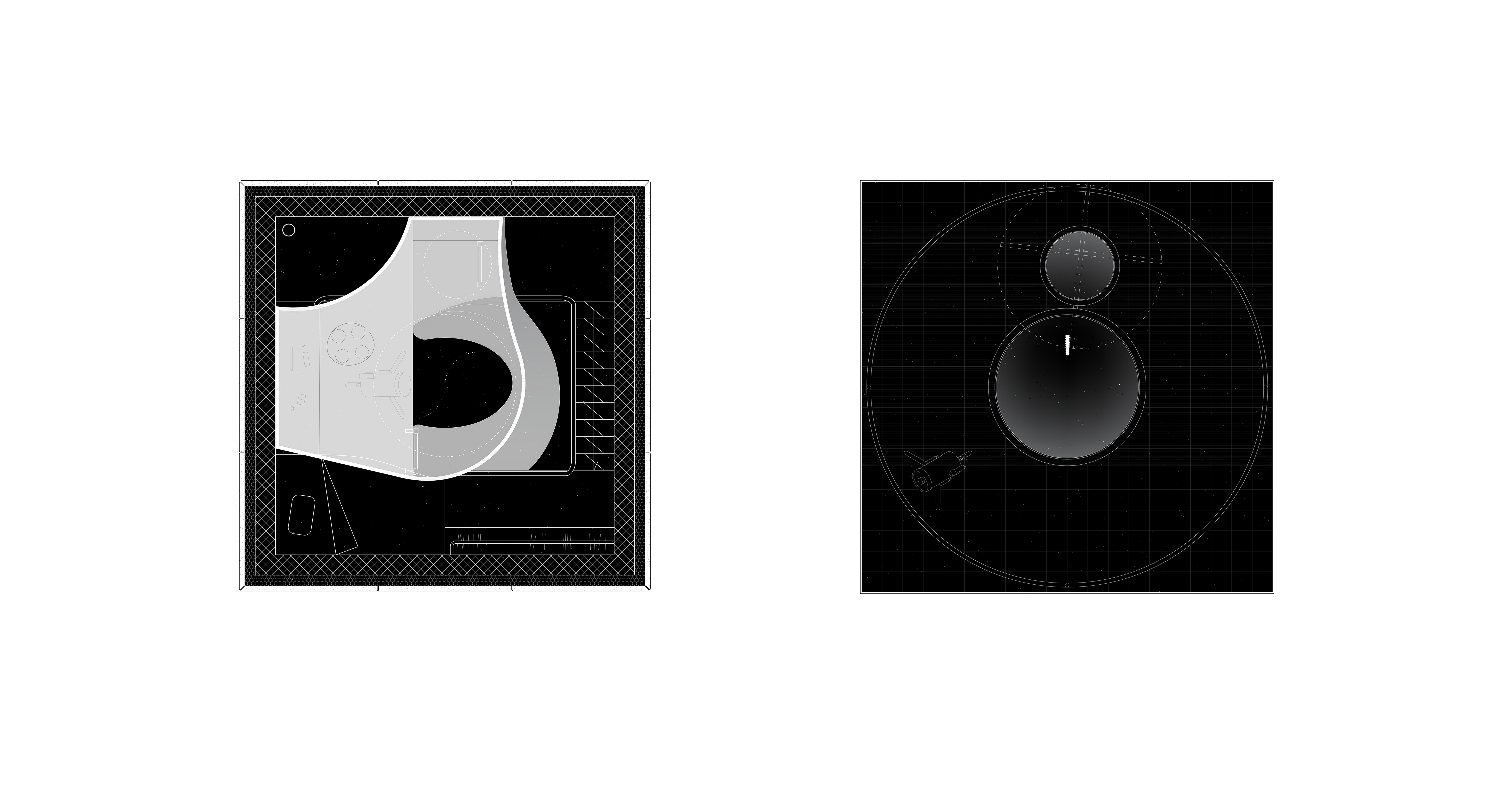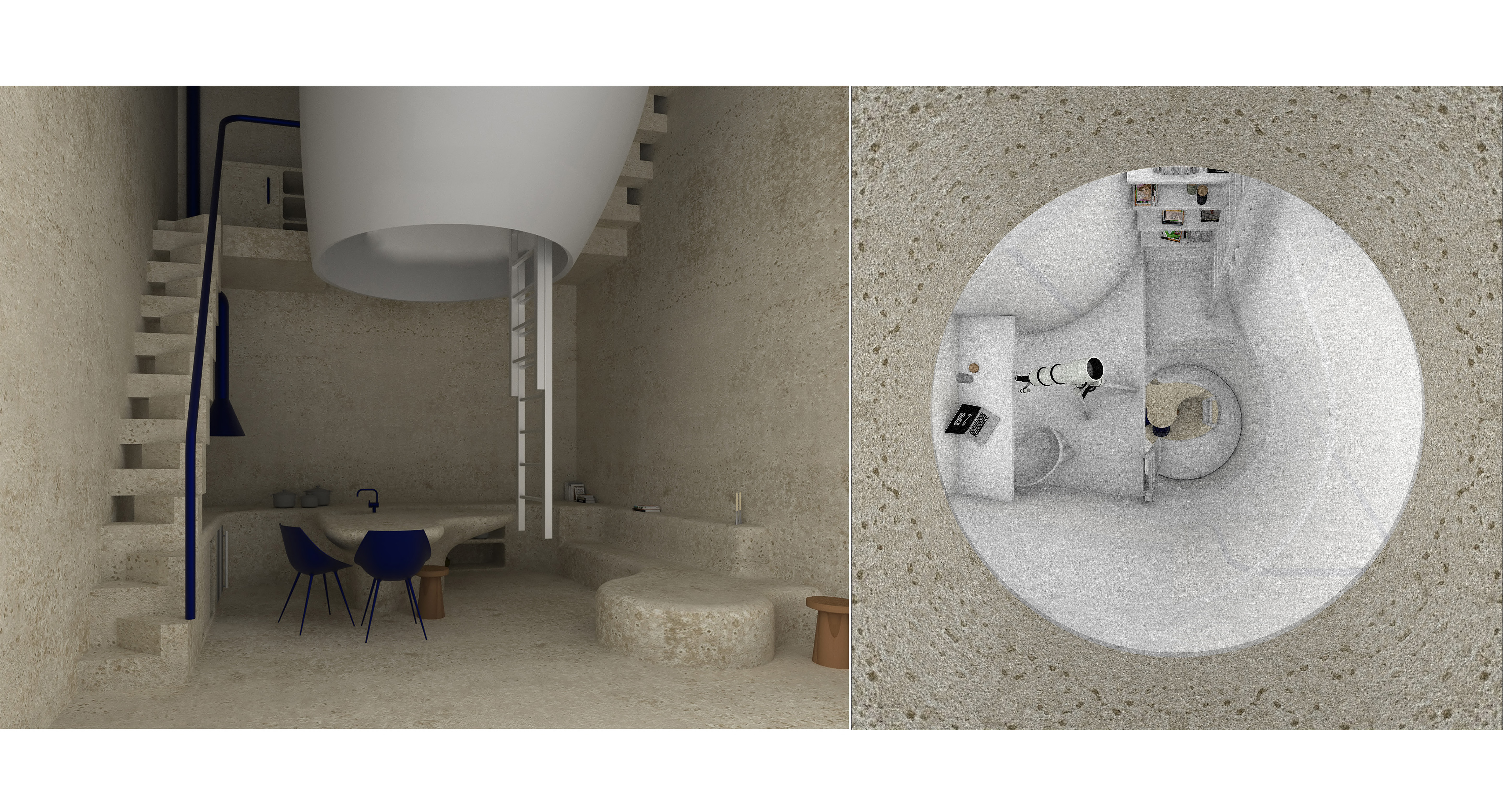 Na donjoj je plohi oblikovana topografija koja tvori elementaran namještaj integriran u jedinstveno tijelo. Svi elementi izvan kukuljice izrastaju iz prizme, organično teku praznim volumenom i stvaraju elemente koje čovjek koristi za stanovanje.