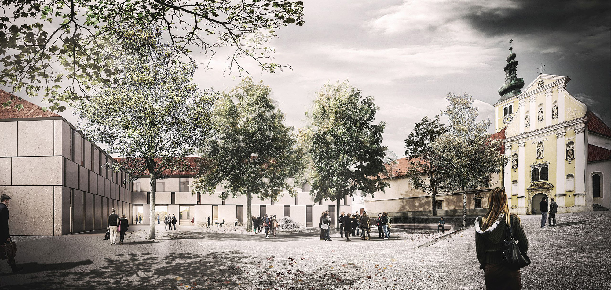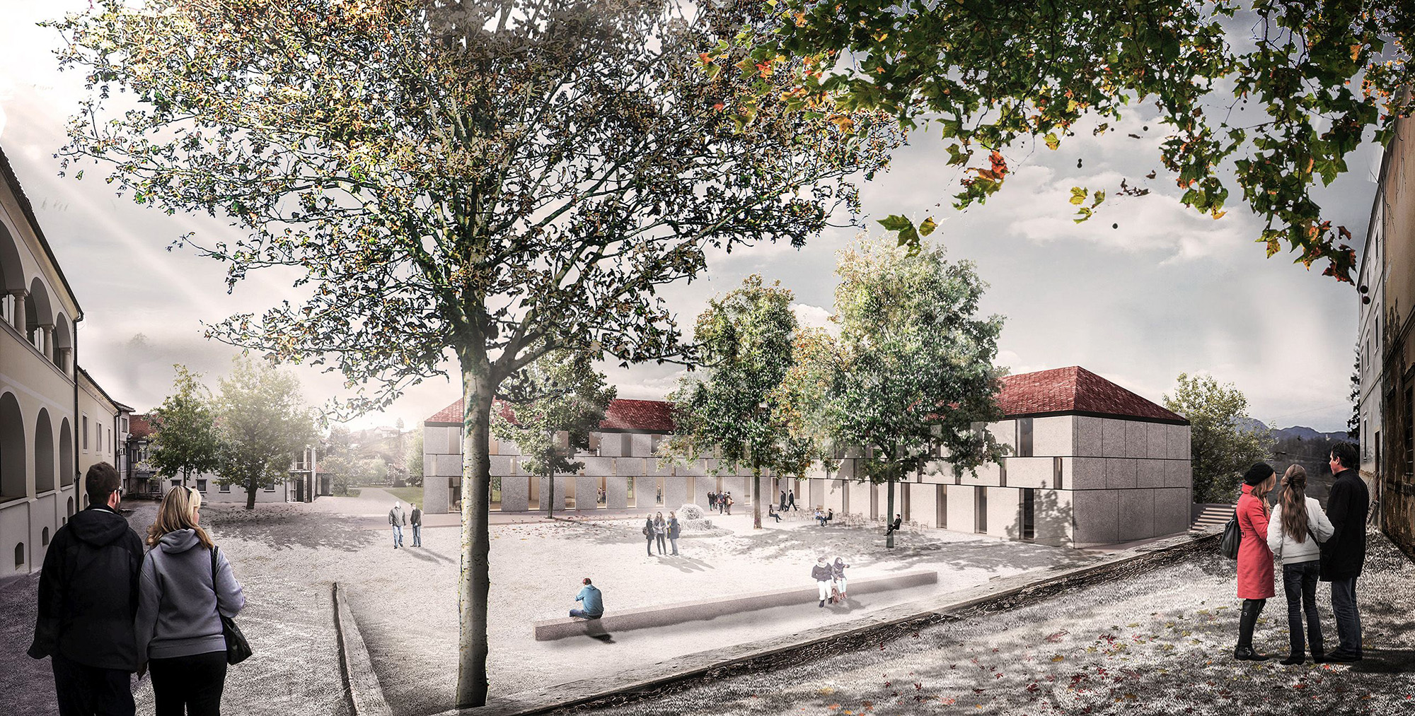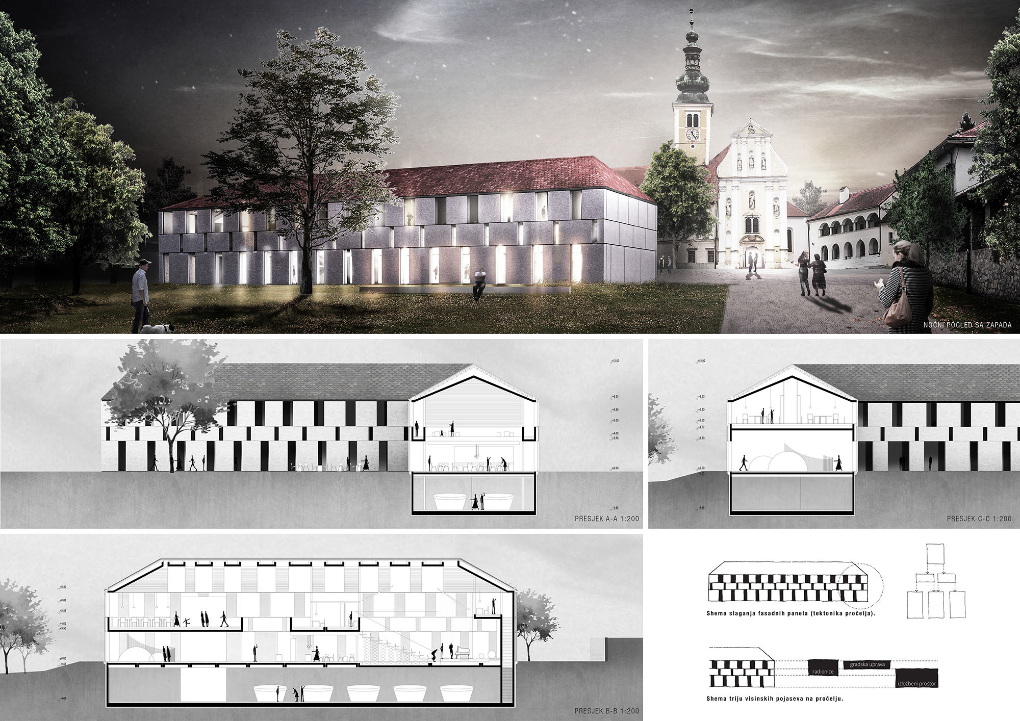 - zgrada je oblikovno koncipirana na način koji respektira i inovativno interpretira oblikovne principe prisutne u postojećoj strukturi samostana,