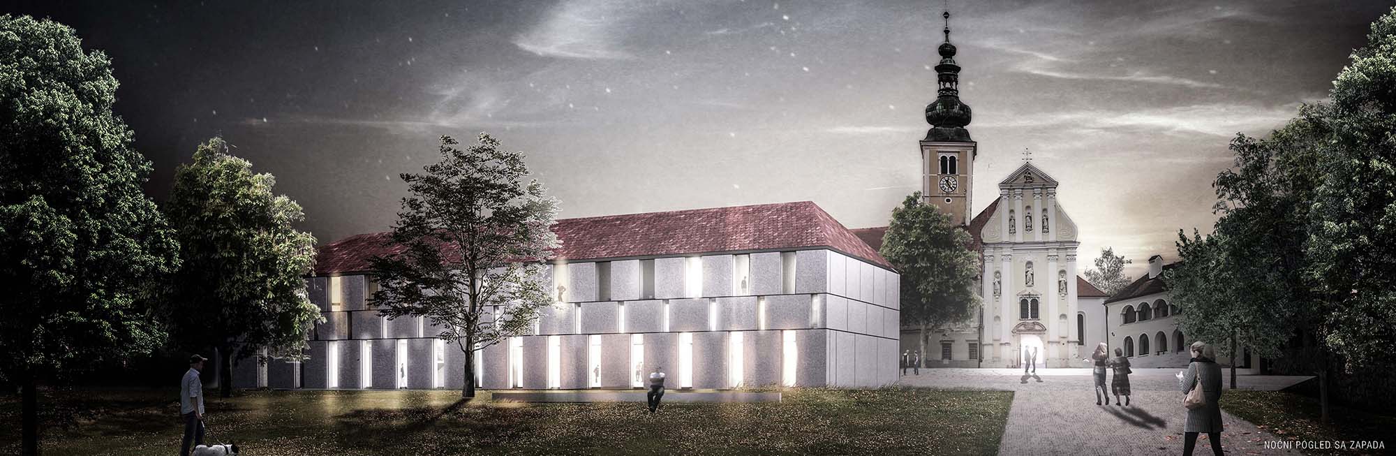 Temeljna ideja-odrednica tlocrtnog koncepta nove zgrade nalazi referencu u masivnim zidovima postojećeg samostana. Za razliku od masivnosti postojećih zidova, dubina fasadne ovojnice nove zgrade rezultat je funkcionalnog uslojavanja (dupliranja) fasadnog zida, što pomaže operativnijoj organizaciji tlocrta. Dvostruka fasadna stijena omogućava oblikovanje koridora za pristup multifunkcionalnoj dvorani, oblikovanje galerije nad ulaznim holom te mogućnost ugradnje panela za zamračenje izložbenih, uredskih i dvoranskih unutarnjih prostora. Tema uslojavanja zida (dupliranja pročelja) referira se i na arhitektonski motiv klaustra - značajni tradicijski element samostanskih kompleksa, kojeg nalazimo i unutar obližnjeg pavlinskog samostana.