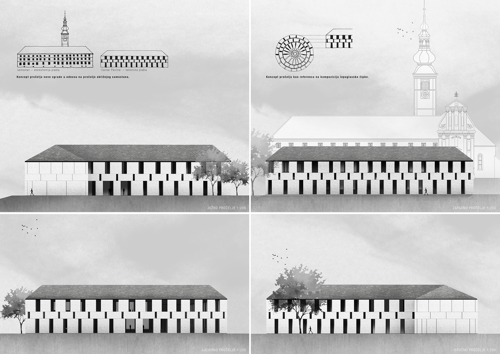 Uravnotežena ritmična repeticija punih i praznih površina pročelja stvara kontemplativnu atmosferu u unutarnjem prostoru zgrade. Unutrašnjost prostora oblikovana je igrom svjetla i sjene, osunčanih i zasjenjenih površina. Kao referenca na kulturnu baštinu Lepoglave, pročelje nove zgrade Centra Pavlina može se razumjeti i kao oblikovna kompozicija proizašla iz lokalnog običaja izrađivanja lepoglavske čipke. Fasadni paneli izrađeni su iz brušenog terrazza u koji je primiješan agregat lokalnog kamena. Na taj će način kolorit zgrade biti prilagođen značajkama područja u kojem se zgrada nalazi.