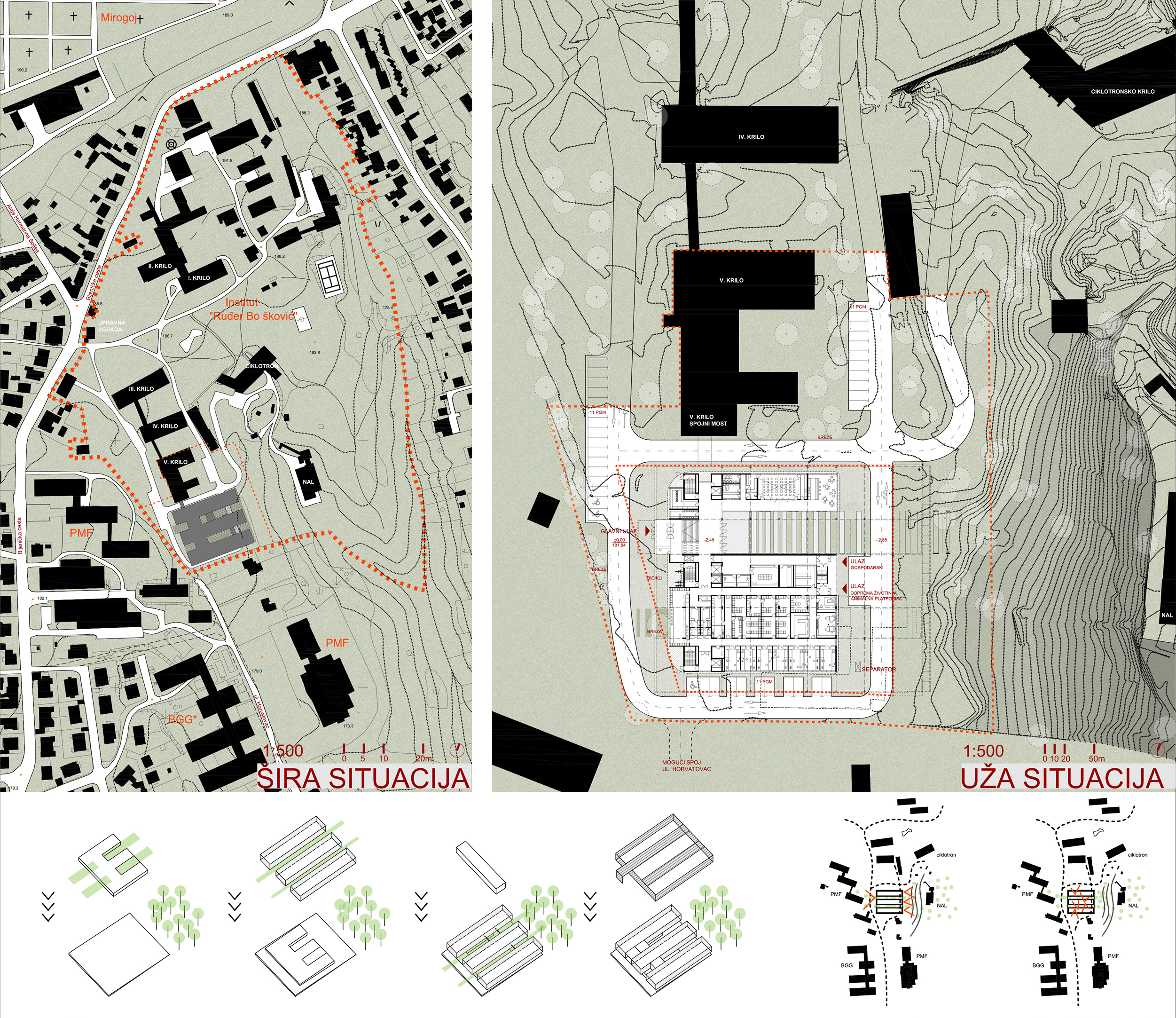 Nova zgrada svojom osnovnom dipozicijom na tri izdužena funkcionalna trakta nastavlja ritmično ponavljanje postojećih i planiranih razmještaja arhitektonskih volumena u kvalitetnom zelenom okruženju. Na taj način nova izgradnja afirmira vrijednosti postojećeg krajolika, nastojeći skladno nastaviti urbanu geometriju koja u prostoru postoji već desetljećima.
