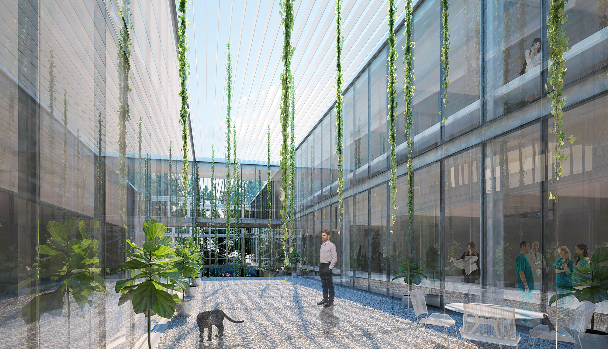 Volumen nove zgrade laboratorija IRB-a slijedi osnovnu impostaciju postojećih nezavisnih paviljona arhitekta Ostrogovića, ali unutar jedinstvene suvremene tehničko-tehnološke ovojnice. Ova ovojnica ima dvostruku ulogu: s jedne strane, ona omogućava zadovoljenje tehičko-tehnoloških karakteristika (zaštita od prekomjernog osunčanja, zagrijavanja i hlađenja, kontrola osvjetljenja i sl.), a s druge, ovojnica pruža i mogućnost vizualne i stvarne propulzije zelenila unutar ove polupropusne opne, na dva nivoa; kako onom fizičkom, tako i onom fenomenološkom.