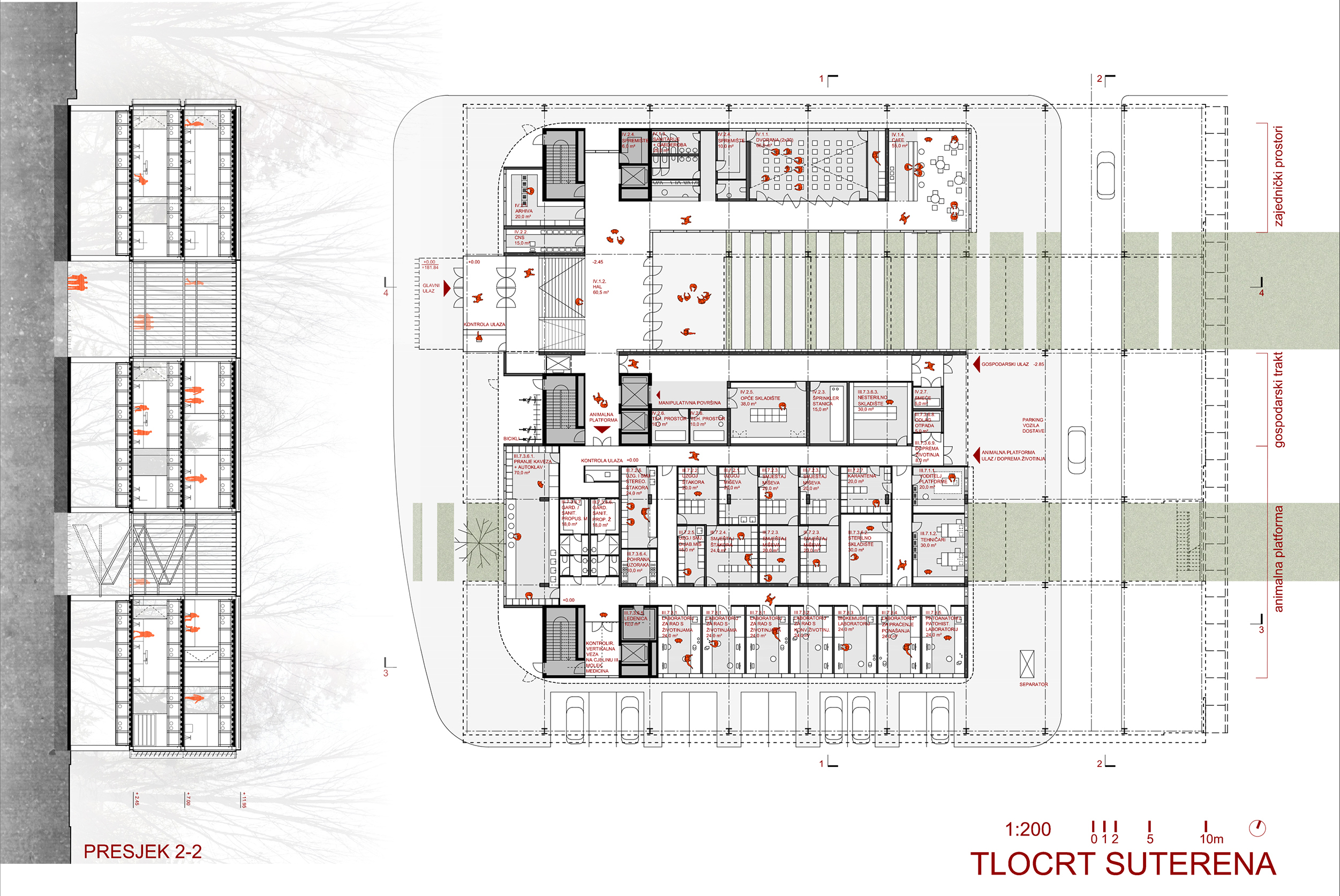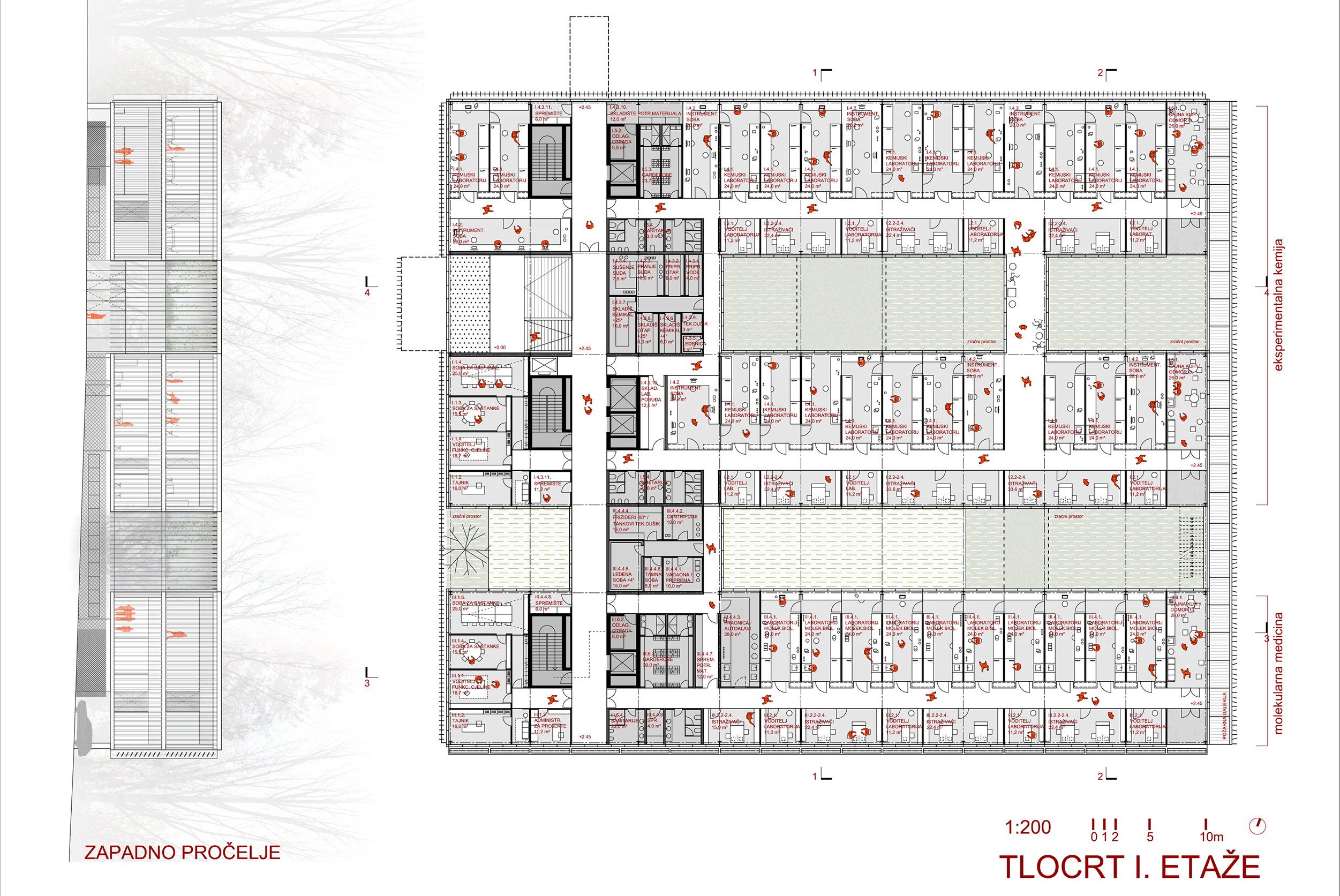 Osim što osnovna makro-dispozicija omogućava afirmaciju postojećeg kontekstualnog urbanističkog koncepta i odnosa prema kvalitetnom zelenilu i vizurama, ovom se dispozicijom ujedno postiže i optimalna orijentacija (kako prostora laboratorija, tako i pripadajućih radnih prostora znanstvenika) te nesmetanost funkcioniranja pripadajućih administrativnih prostora, kao i cjeline zajedničkih prostora, te izdvojene animalne platfome u suterenu.