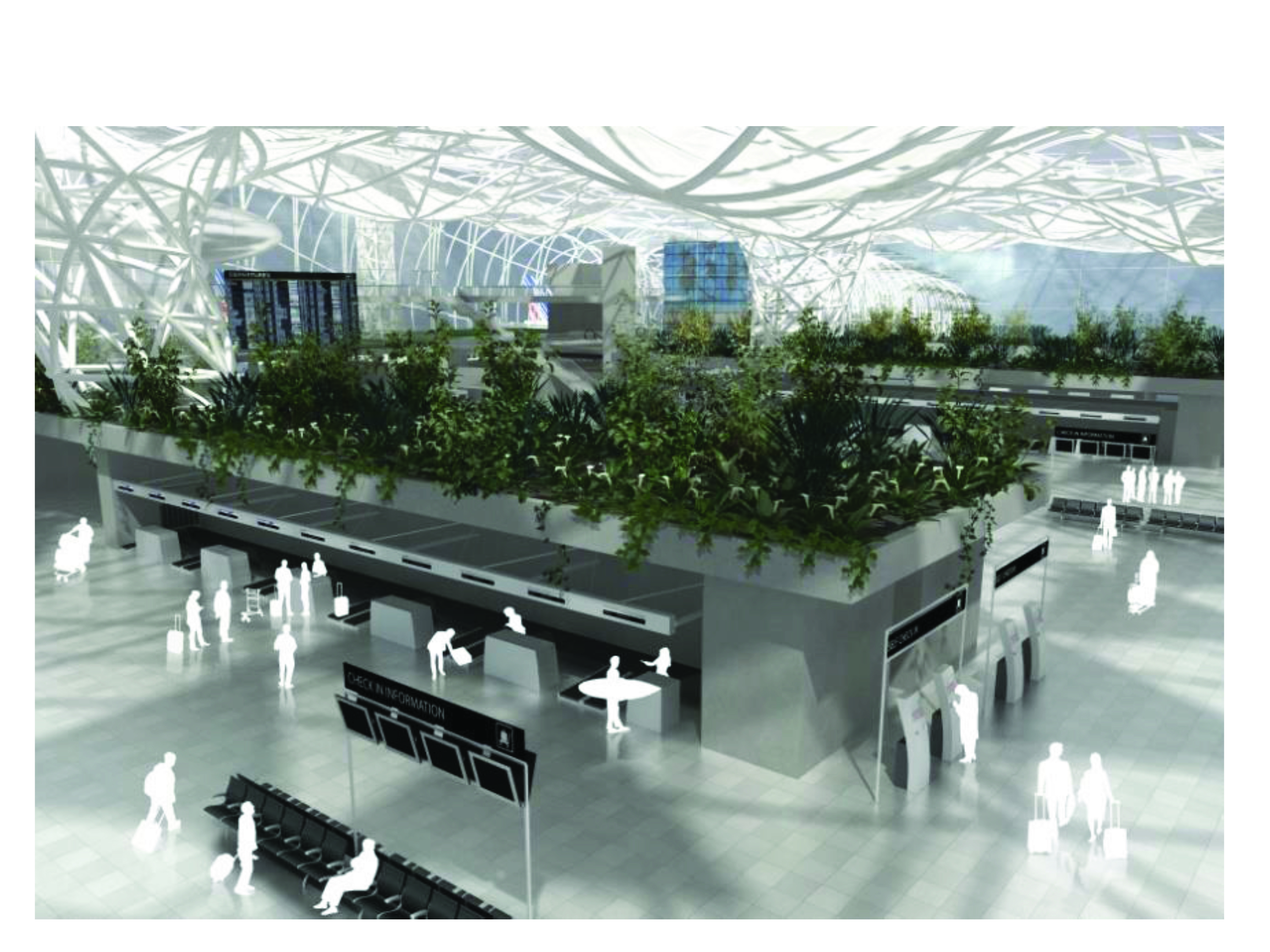 Krovna struktura dizajnirana je kao dvostruka ovojnica. Njezin veliki otvor za ventilaciju ima značajne ekološke dobrobiti. Upravljanje postraničnim otvorima i snaga povratnog mlaznog avionskog motora u dvostrukoj ovojnici mogu stvarati mikroklimu unutar krova koja dramatično može smanjiti potrošnju energije. Ova zelena zračna luka ujedno je i energana.